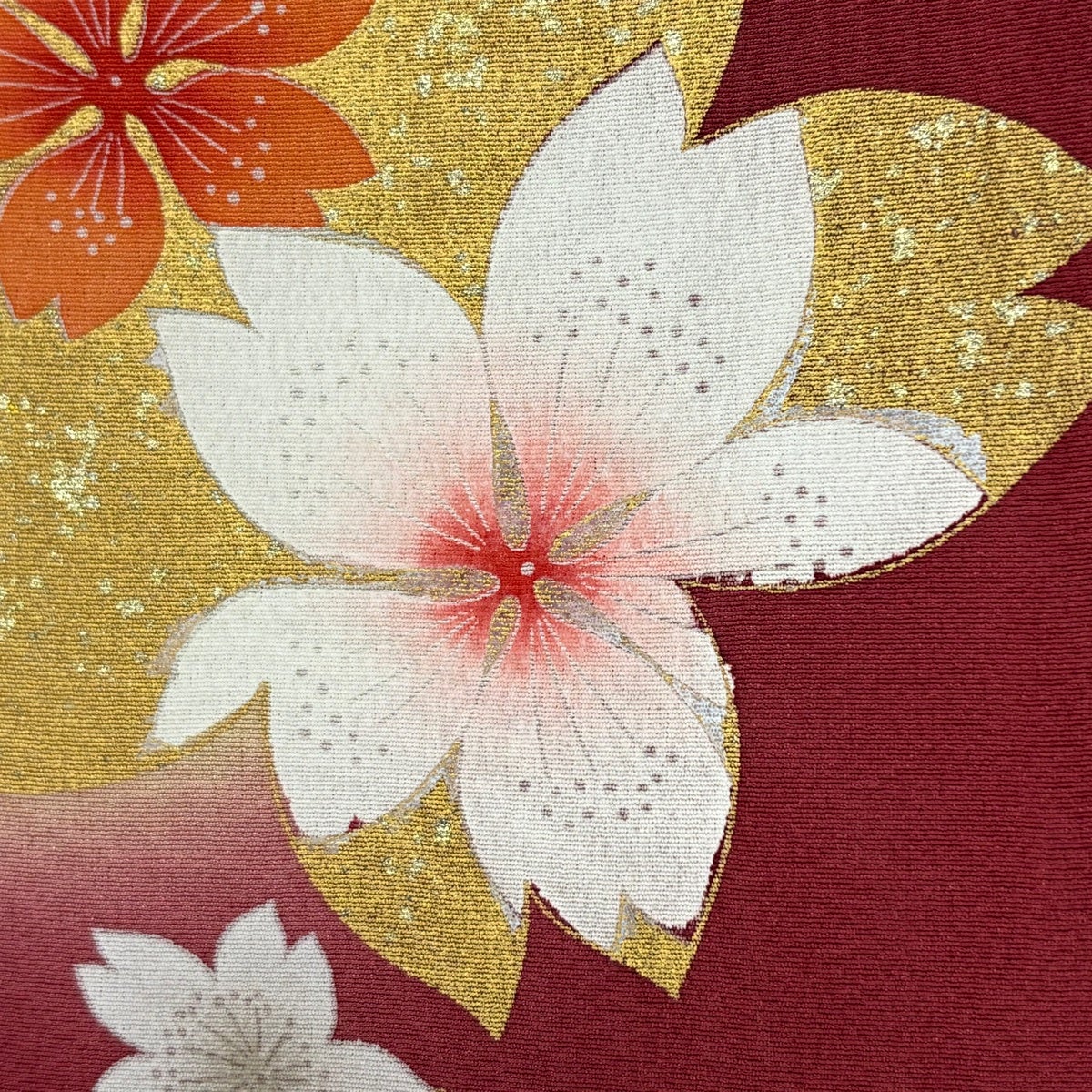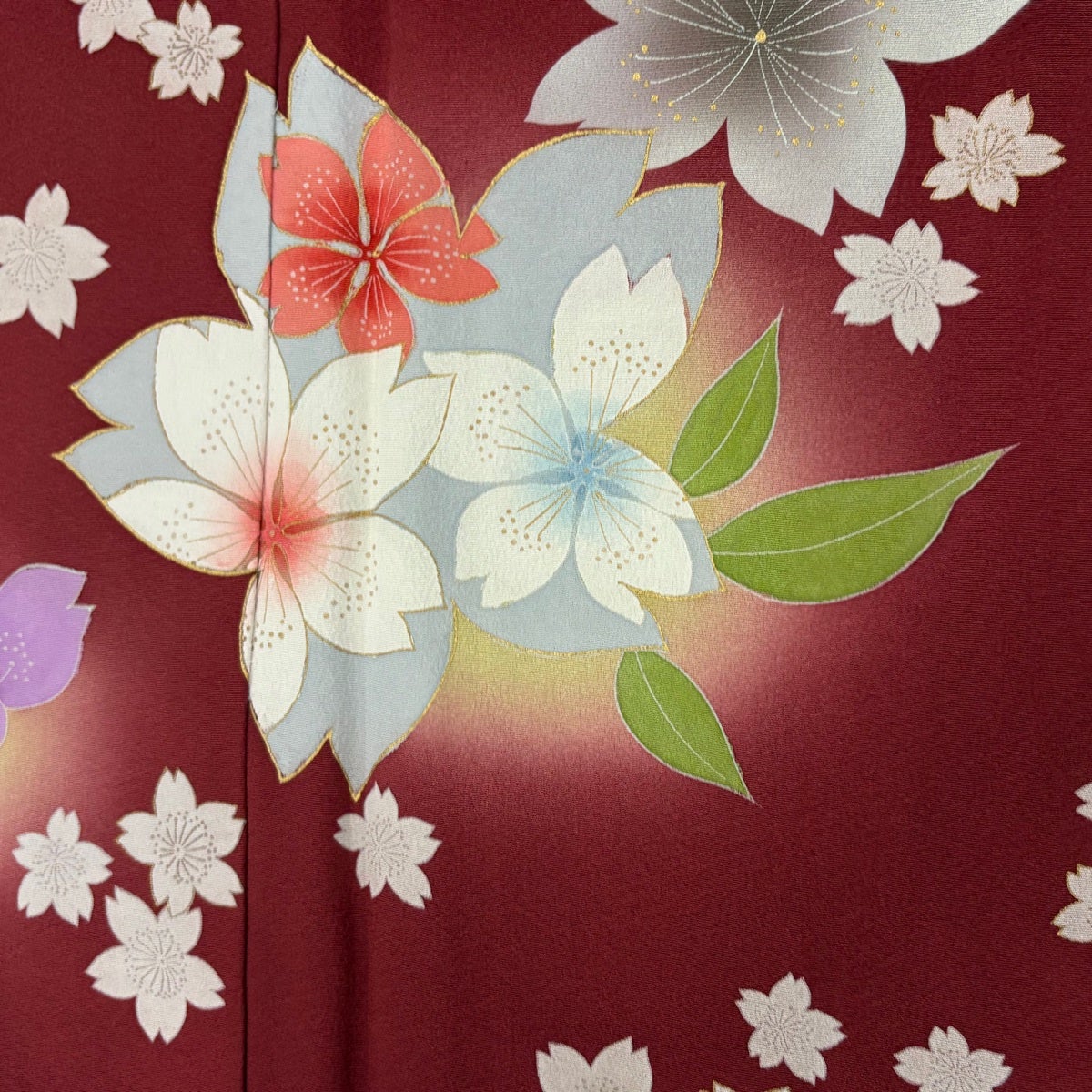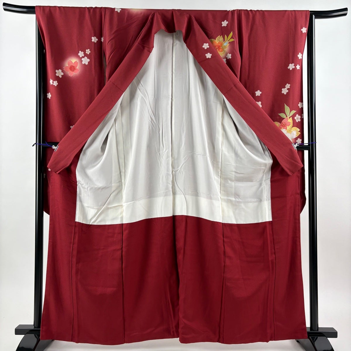 振袖 身丈153.5cm 裄丈63.5cm S 袷 鞠 桜 金糸 刺繍 えんじ色 正絹 秀品