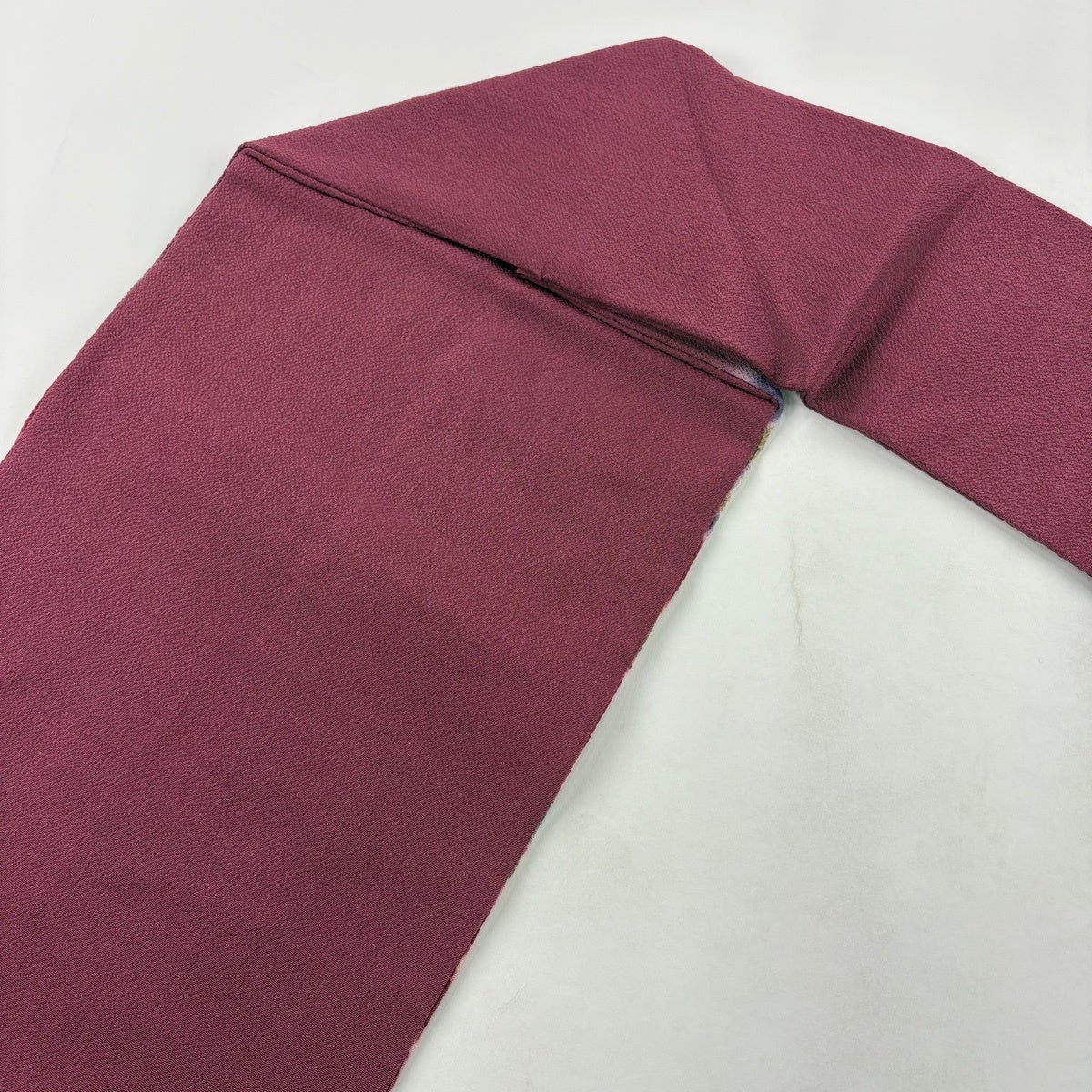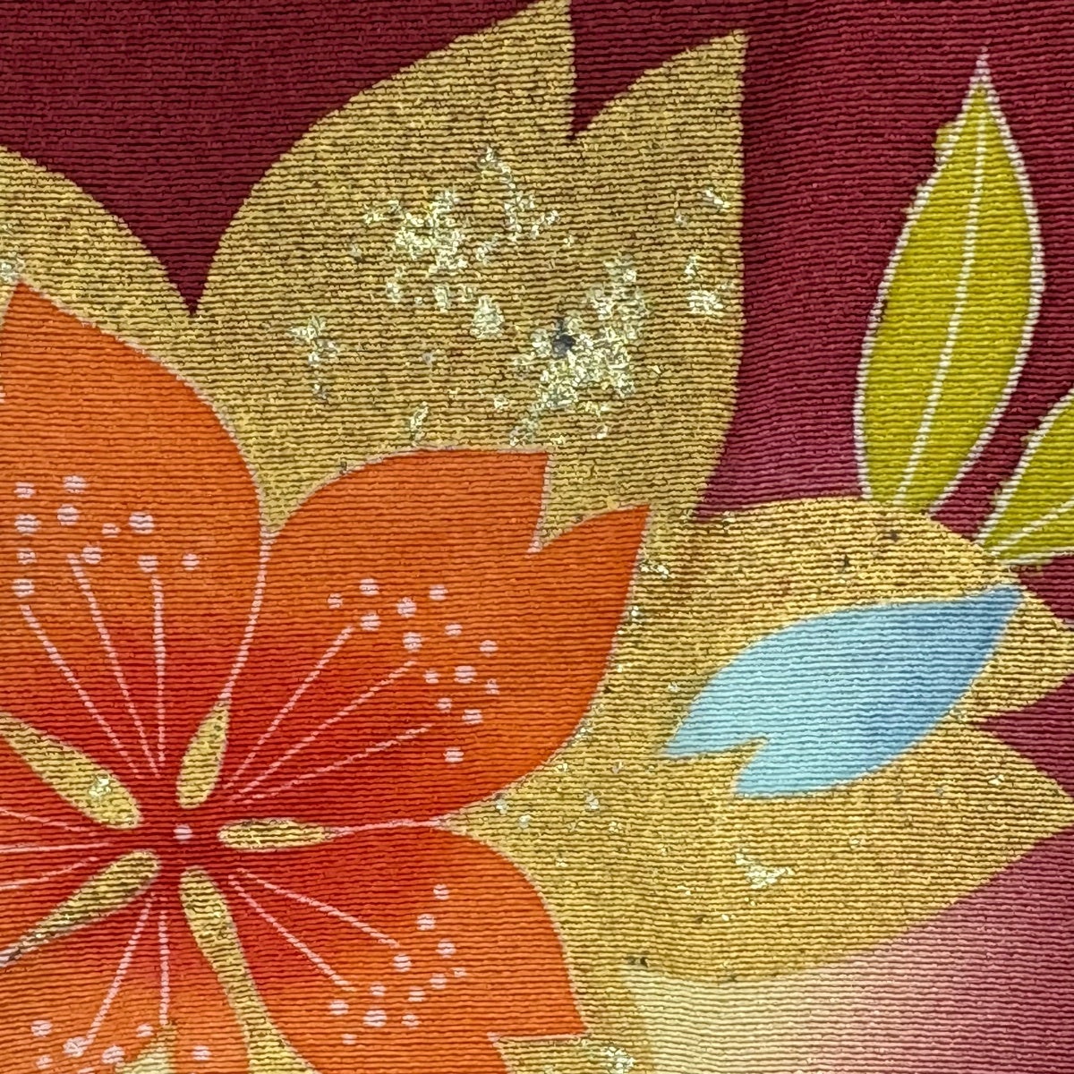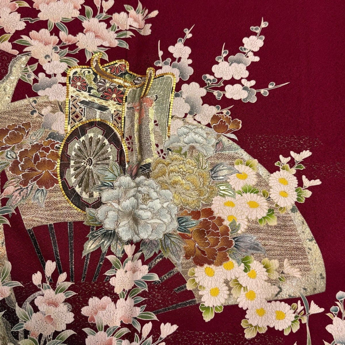 振袖 身丈170.5cm 裄丈69cm L 袷 やまと 御所車 草花 金糸 刺繍 えんじ色 正絹 秀品