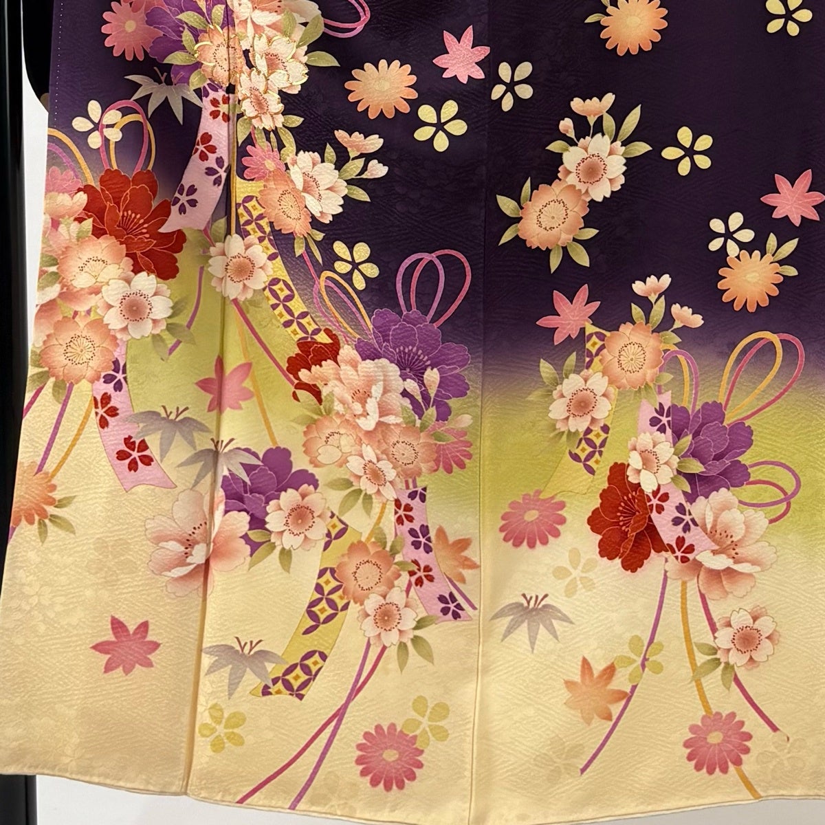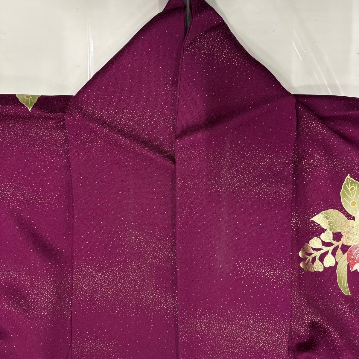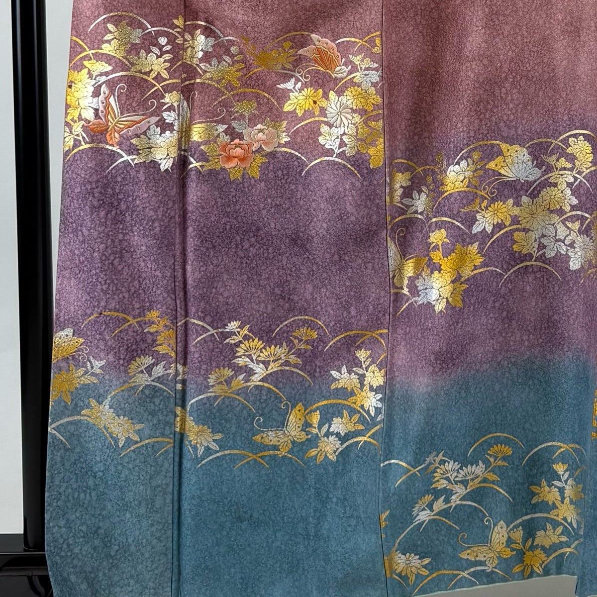 振袖 身丈150.5cm 裄丈65.5cm M 袷 花束 短冊 金糸 金彩 紫 正絹 秀品