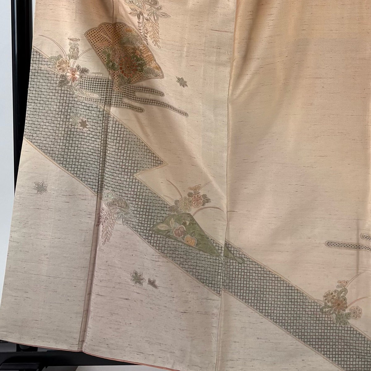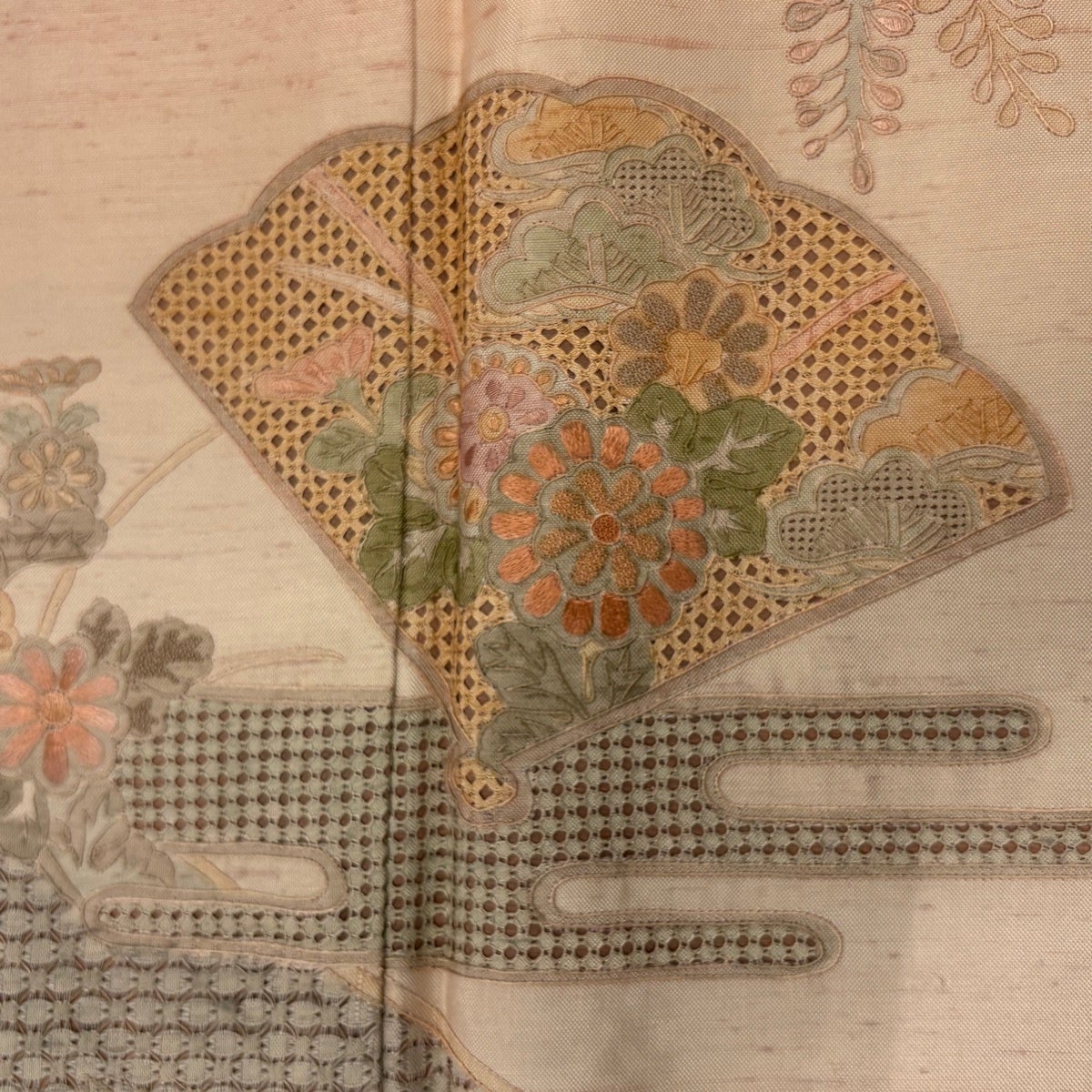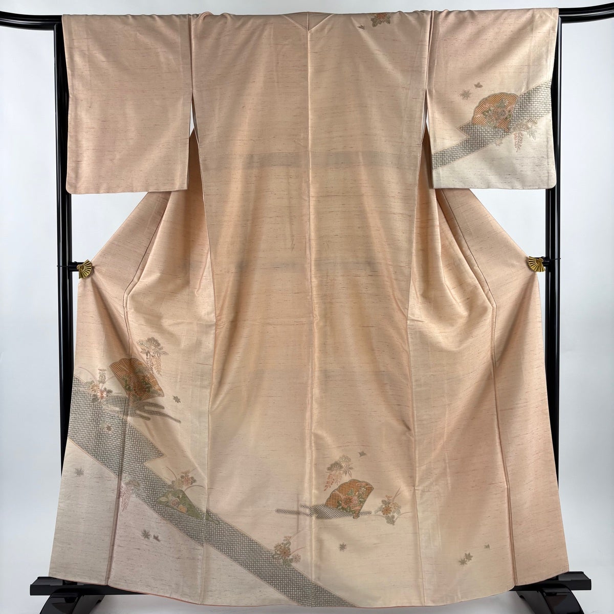 訪問着 身丈161cm 裄丈63.5cm S 袷 花扇 草花 金彩 ピンクベージュ 正絹 秀品
