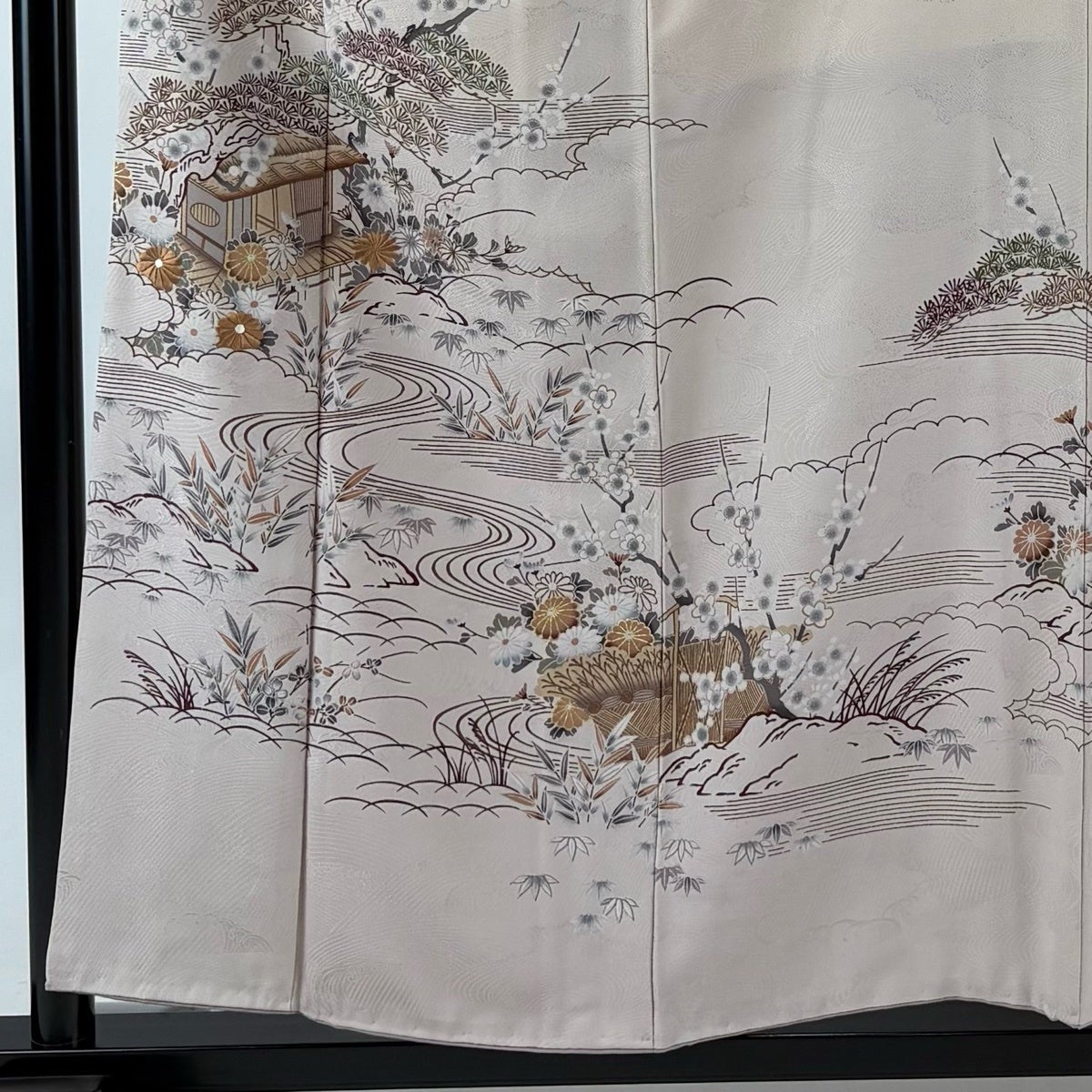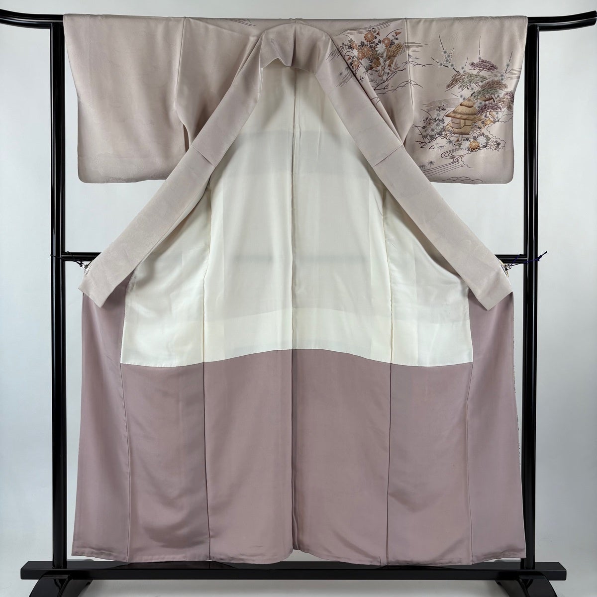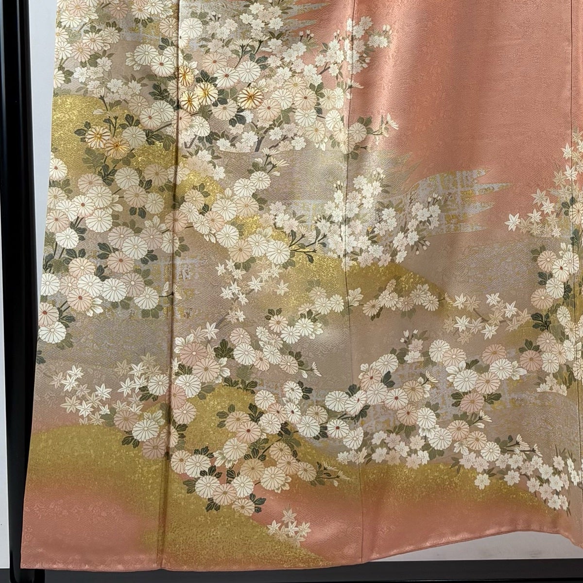 訪問着 身丈161cm 裄丈63.5cm S 袷 花扇 草花 金彩 ピンクベージュ 正絹 秀品