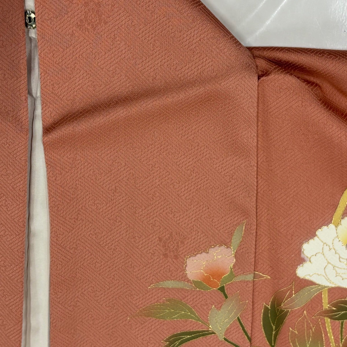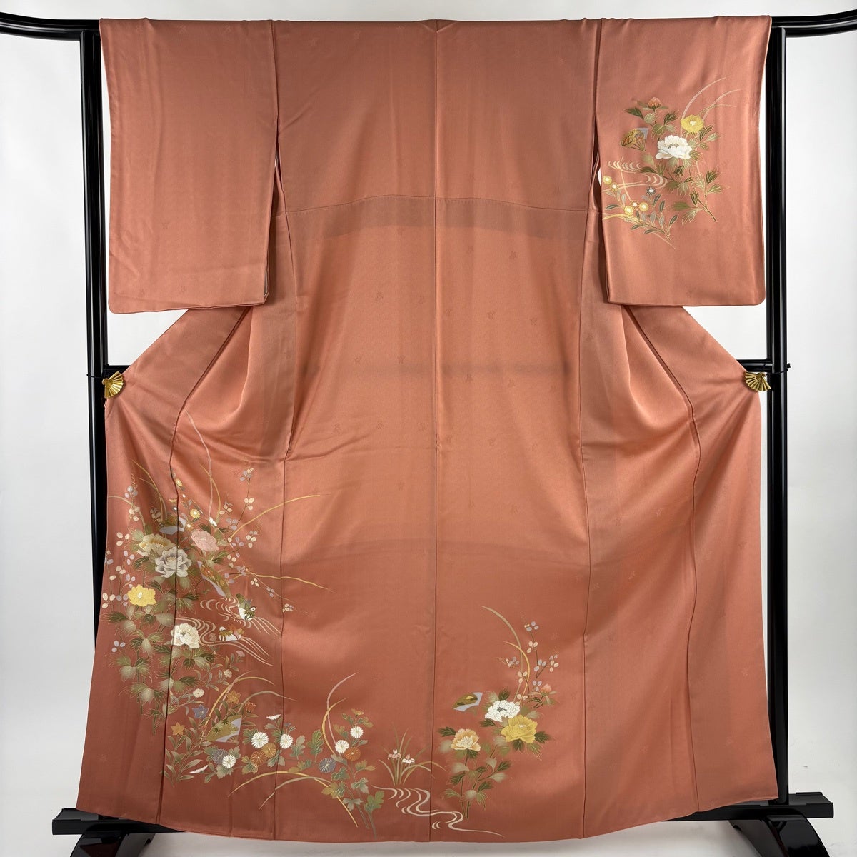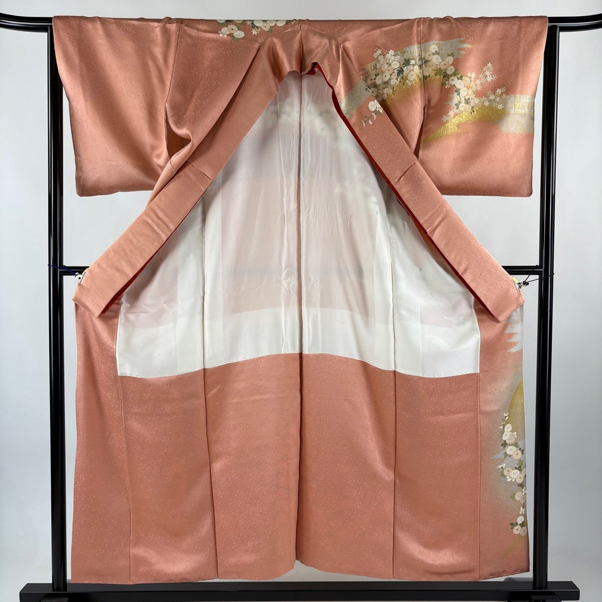 訪問着 身丈160.5cm 裄丈66cm M 袷 花車 流水 金彩 薄オレンジ 正絹 秀品