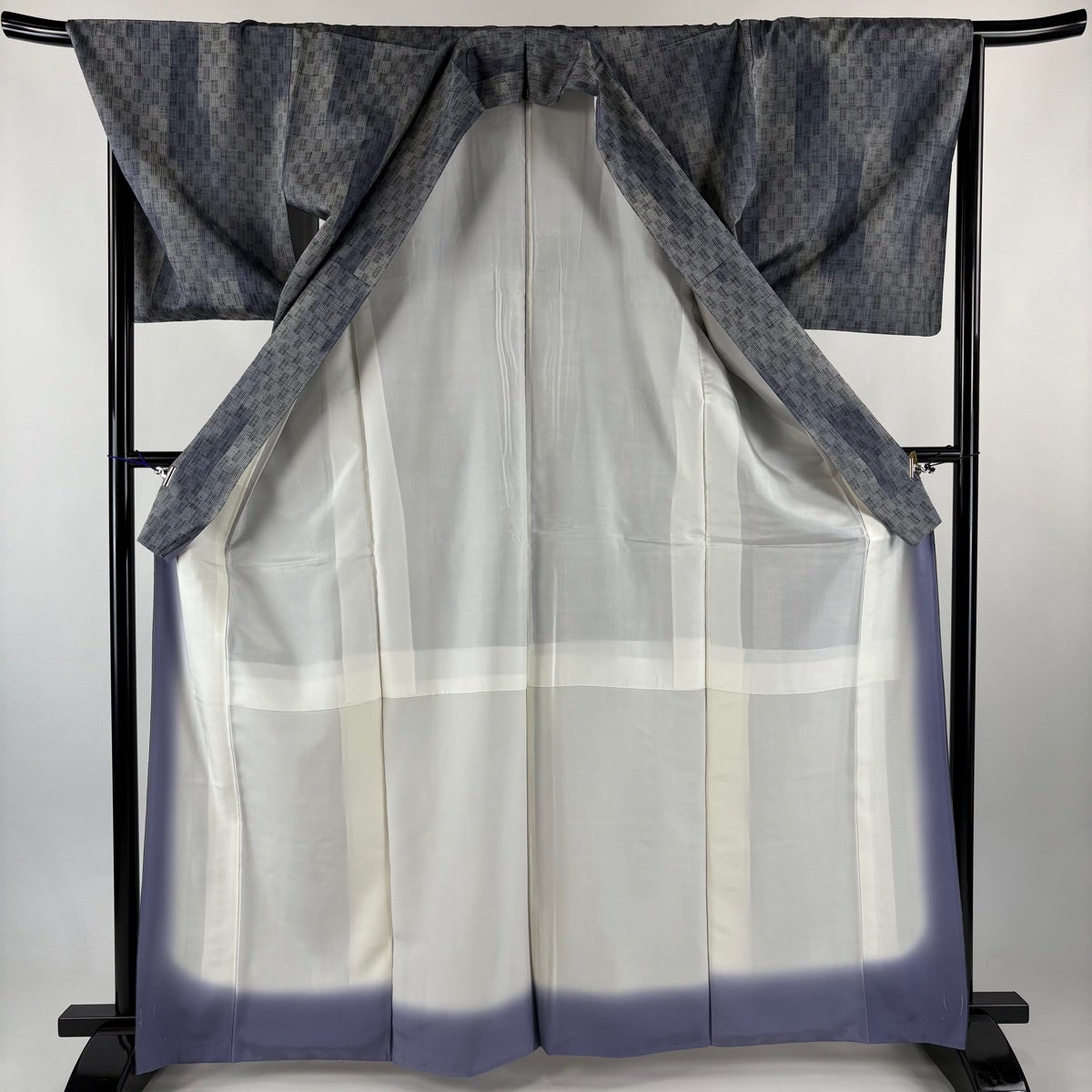 【美品】 紬 身丈165cm 裄丈70cm L 袷 変わり市松 幾何学 青灰色 正絹 秀品