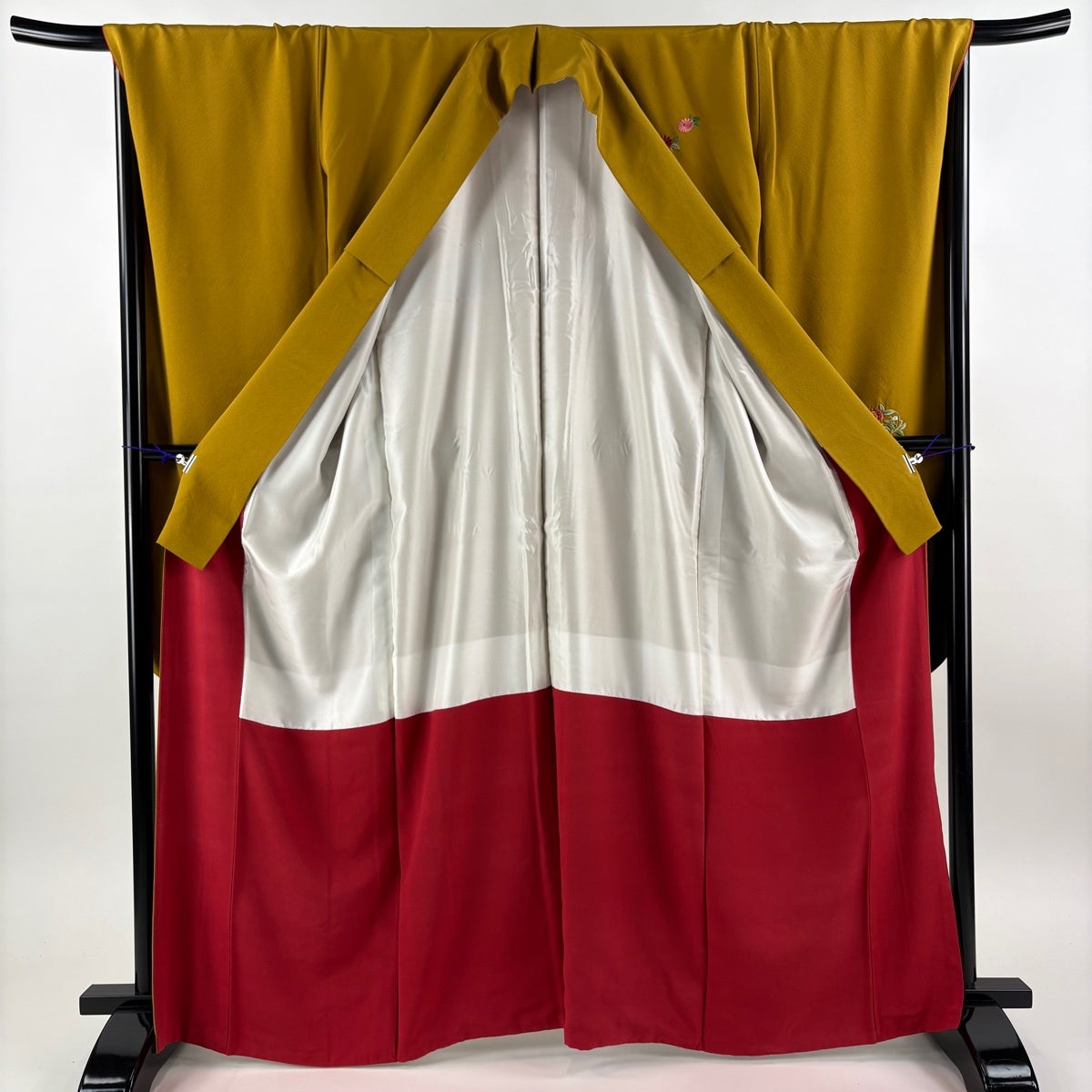 振袖 身丈167cm 裄丈68.5cm L 袷 鞠 草花 金糸 刺繍 山吹色 正絹 秀品