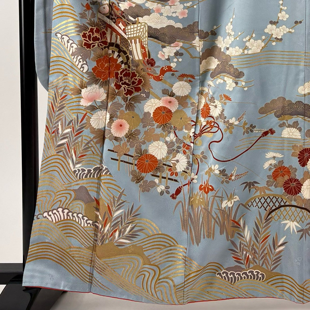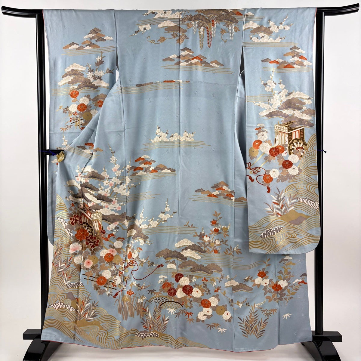 振袖 身丈165cm 裄丈62cm S 袷 御所車 松竹梅 金彩 水色 正絹 秀品