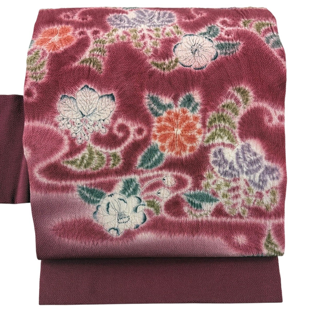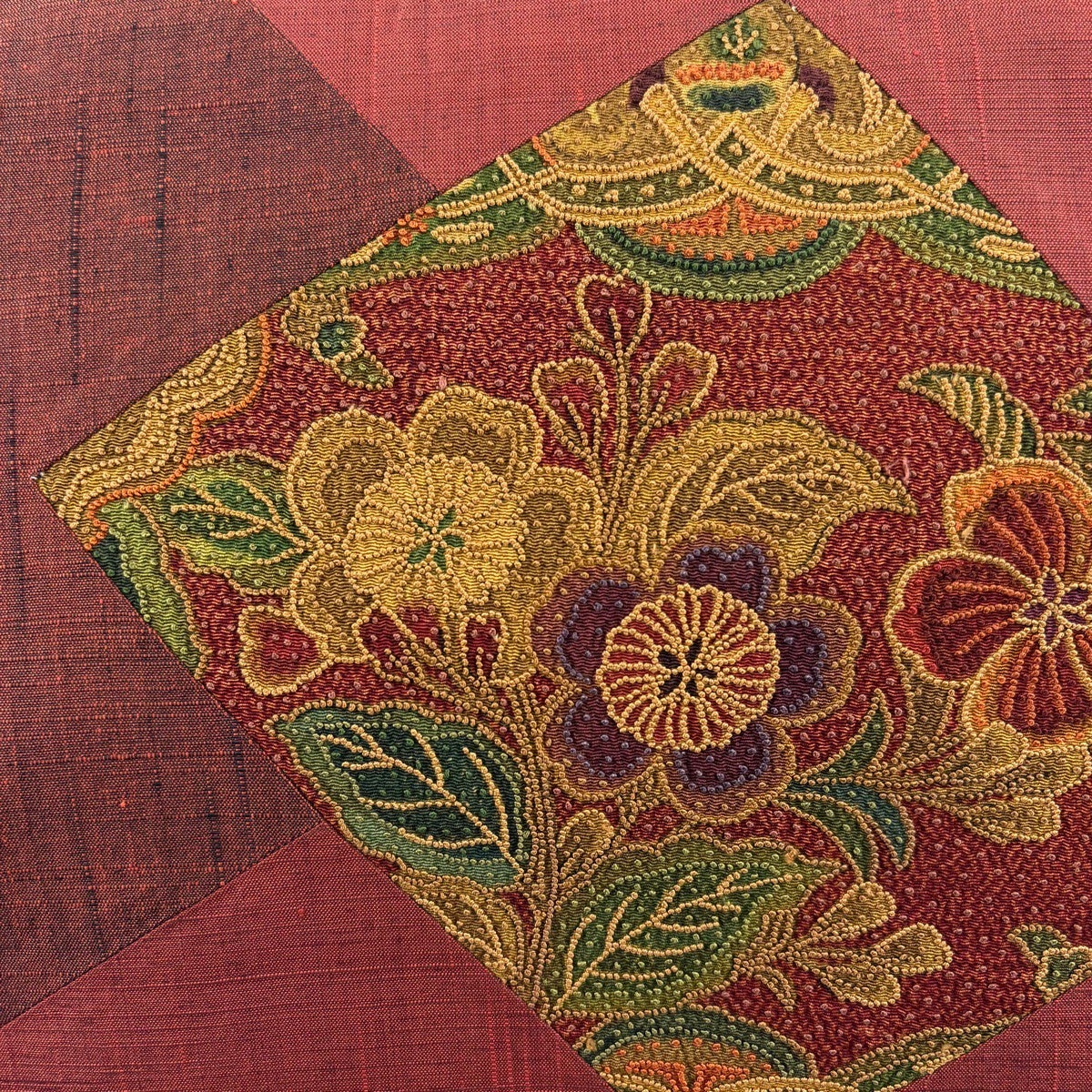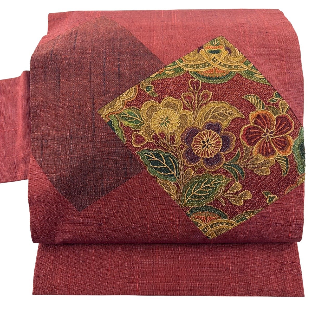 名古屋帯 秀品 紬地 草花 刺繍 切りばめあ えんじ色 正絹