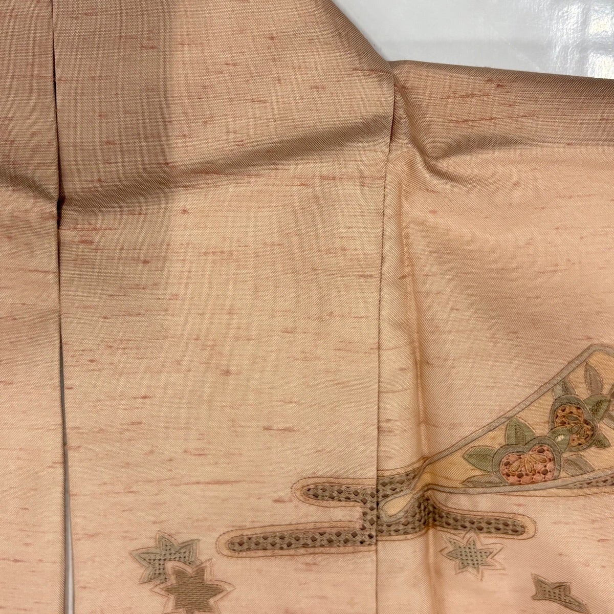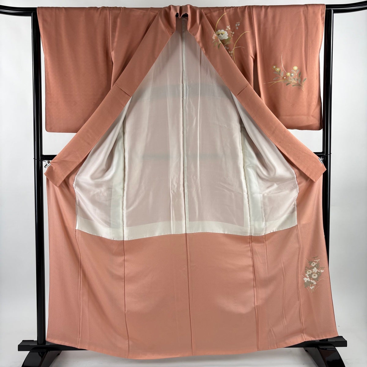 訪問着 身丈162cm 裄丈65cm M 袷 紬地 花扇 ヱ霞 汕頭刺繍 刺繍 サーモンピンク 正絹 秀品