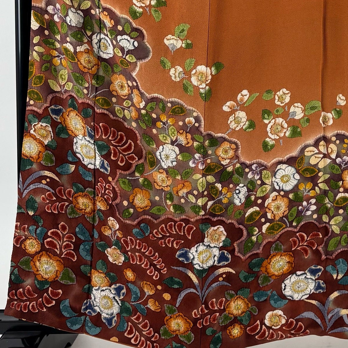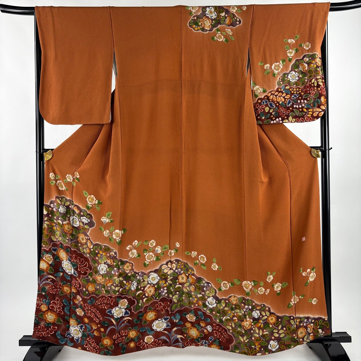 訪問着 身丈160.5cm 裄丈67cm M 袷 落款あり 辻が花柄 雲文 絞り ぼかし 茶色 正絹 秀品