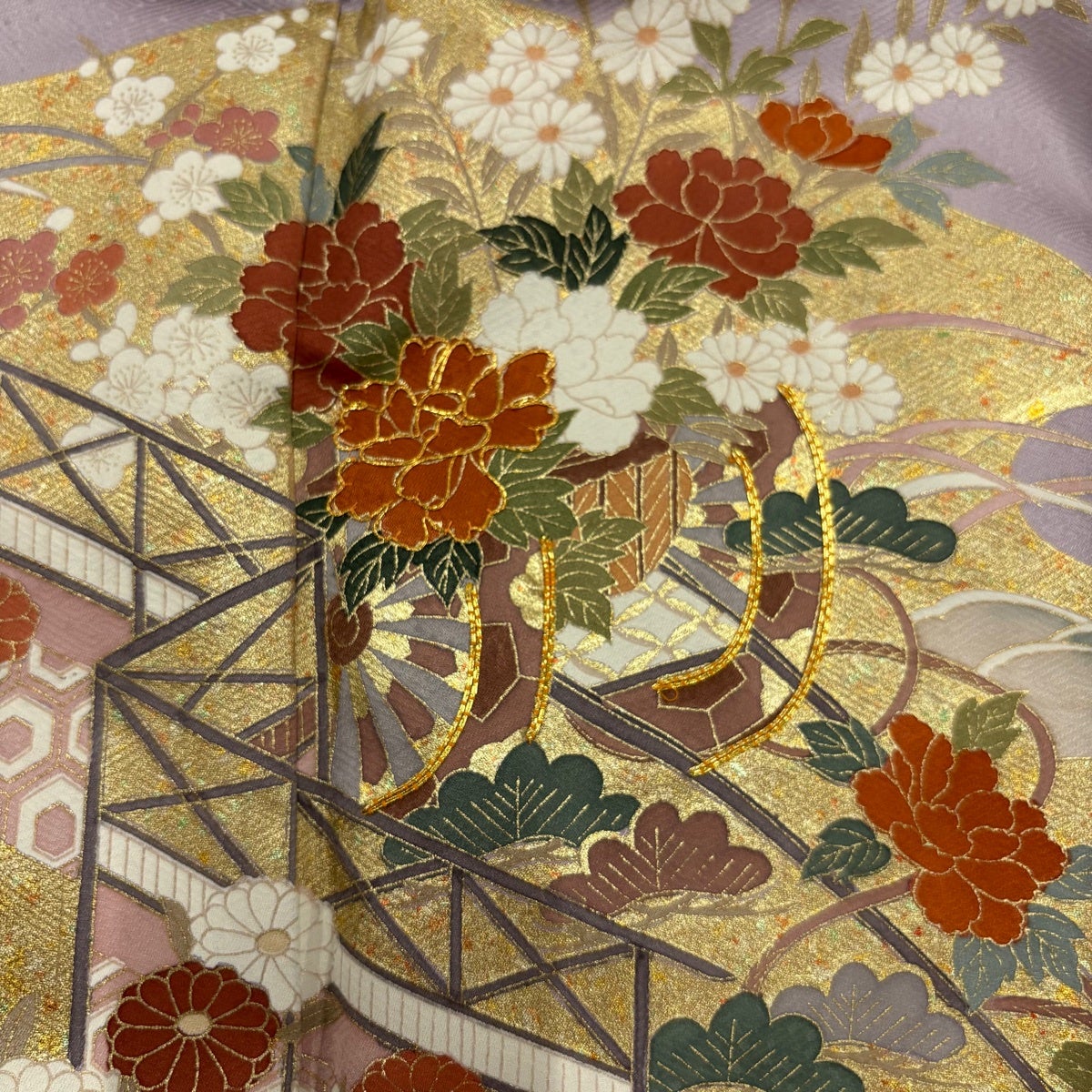 【美品】 色留袖 身丈159cm 裄丈63cm S 袷 花車 菊 金糸 金彩 薄紫 正絹 秀品 三つ紋