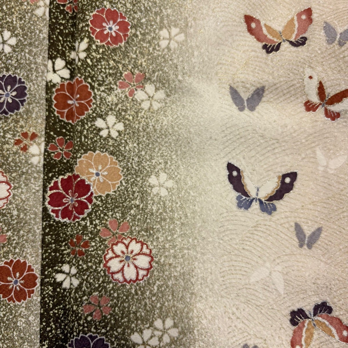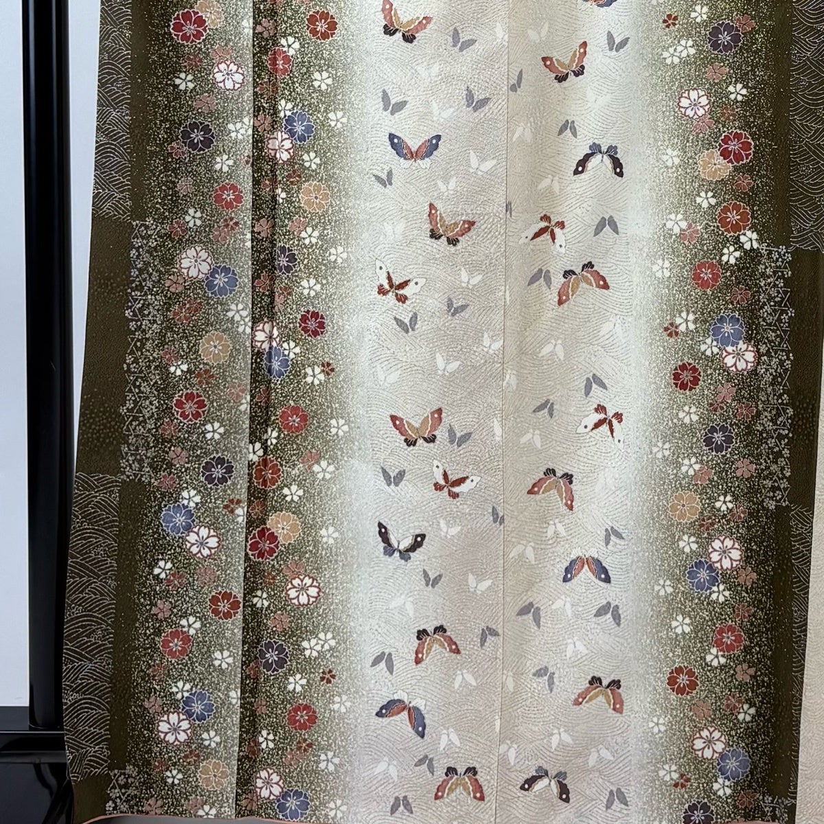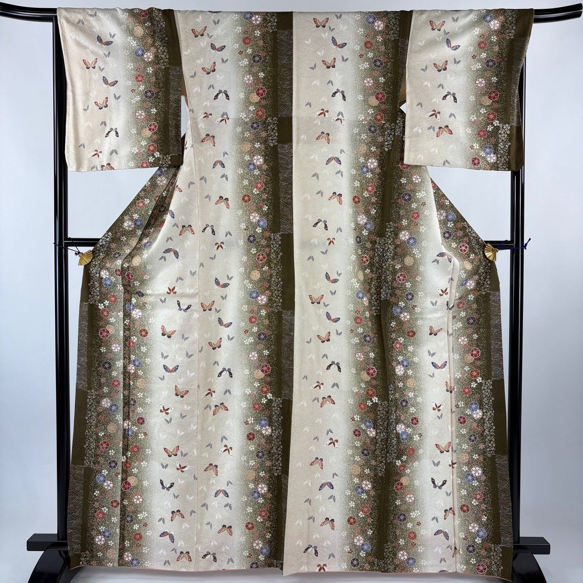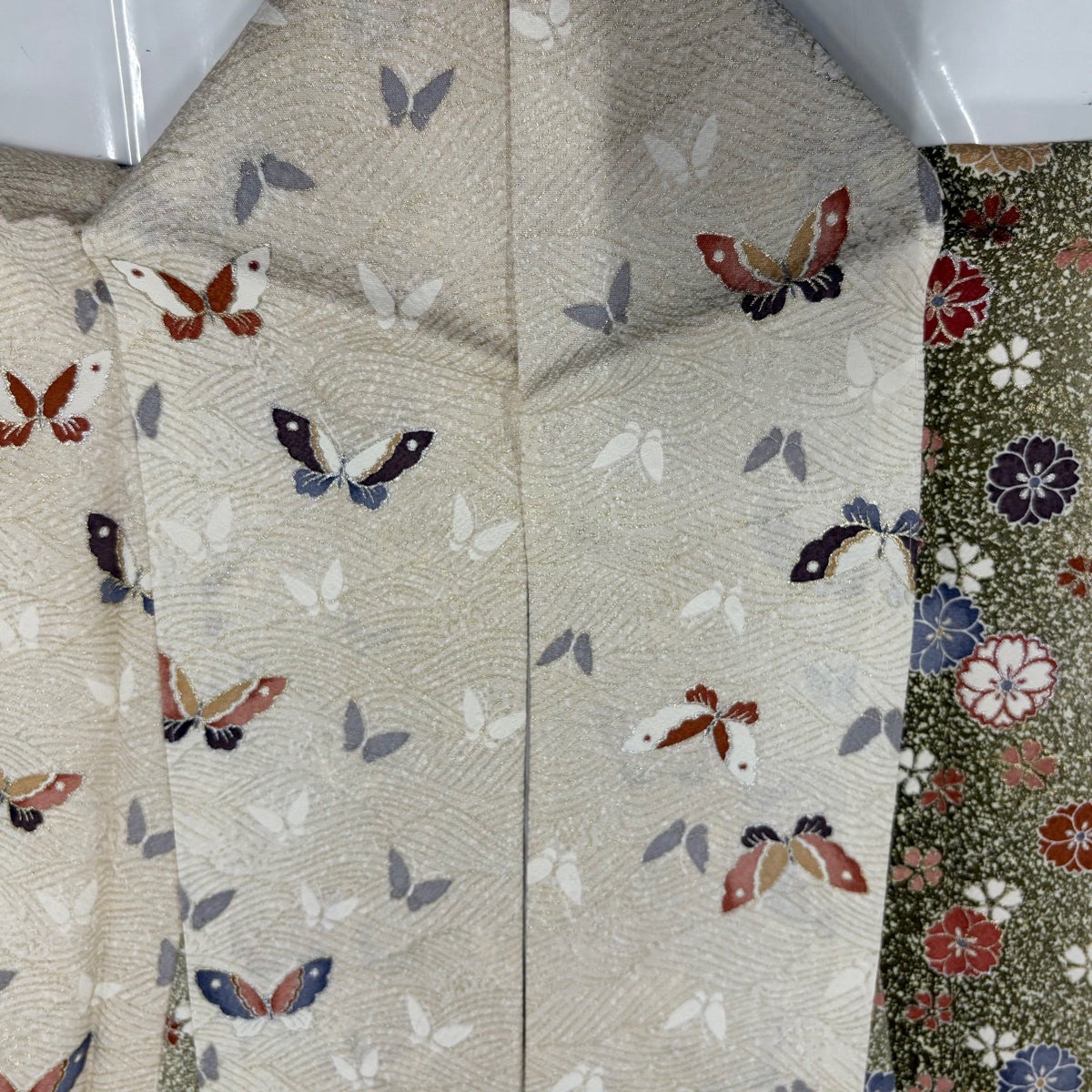 【美品】 小紋 身丈165.5cm 裄丈67.5cm L 袷 やまと 蝶 桜 金銀彩 ベージュ 正絹 秀品