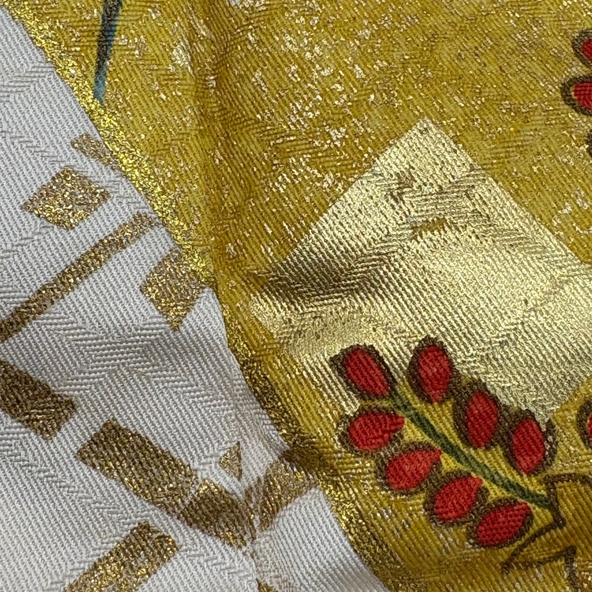 【美品】 付下げ 身丈176cm 裄丈69cm L 未仕立て 斉藤三才 仮絵羽 落款あり 鳥 麻の葉 金彩 ぼかし 山吹茶色 正絹 秀品