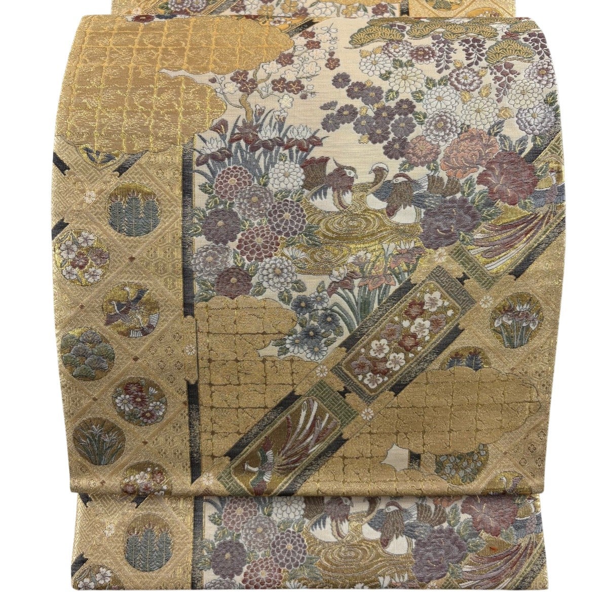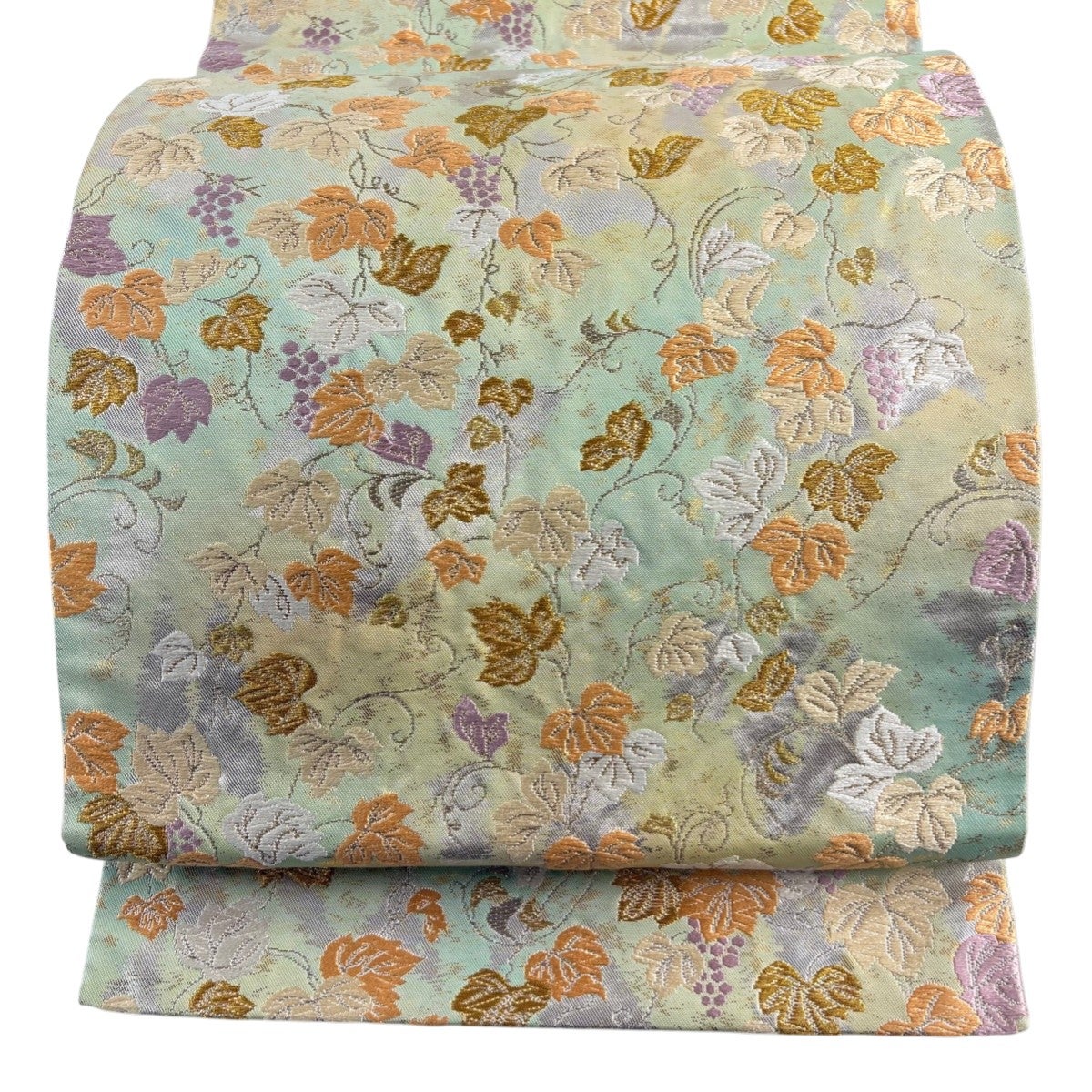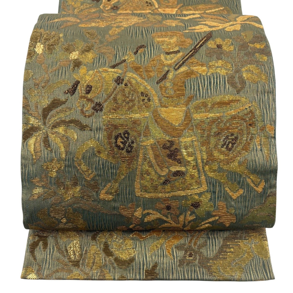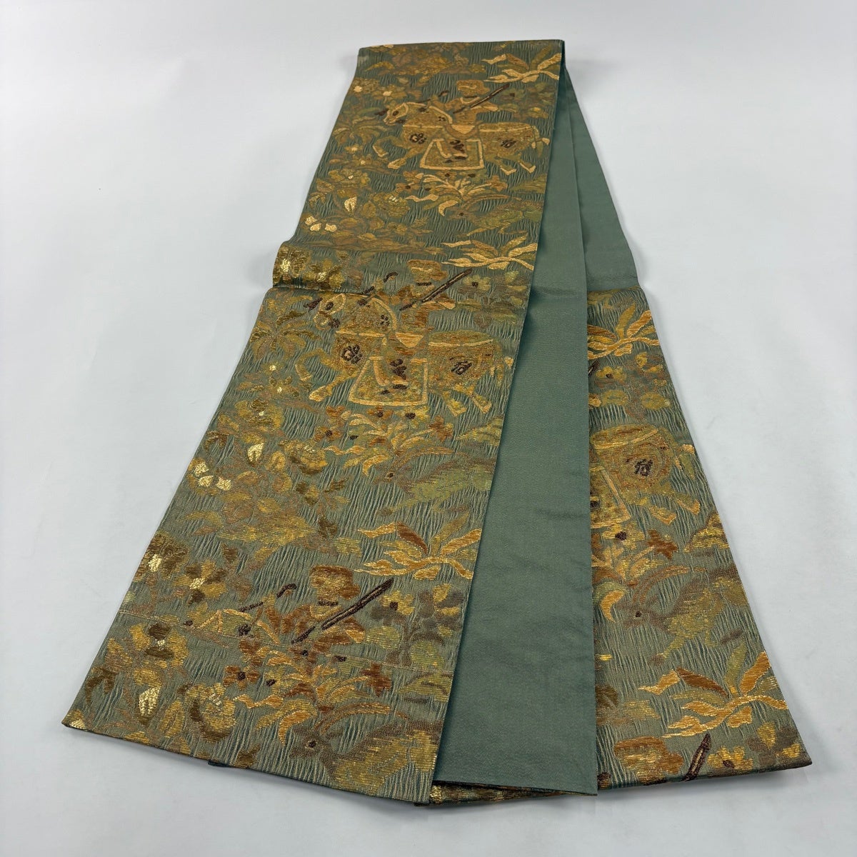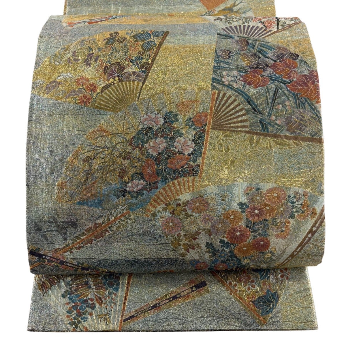 【美品】 袋帯 秀品 琳派三十六華扇 金糸 箔 青灰色 六通 正絹