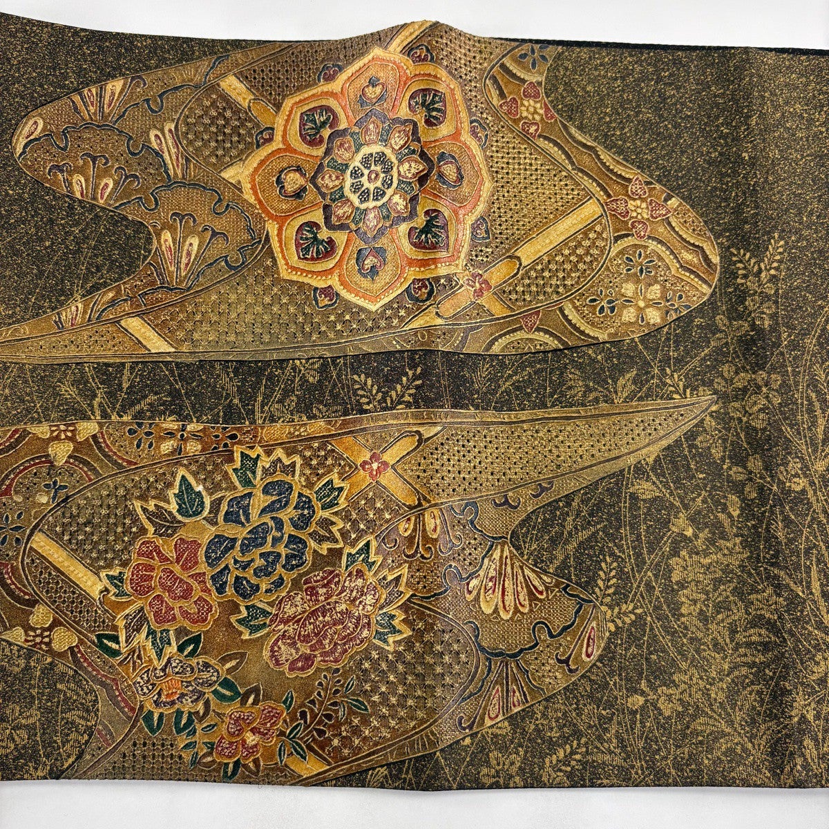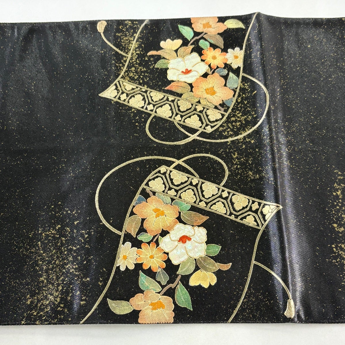 【美品】 袋帯 秀品 巻物 草花 螺鈿 金彩 黒 お太鼓柄 正絹