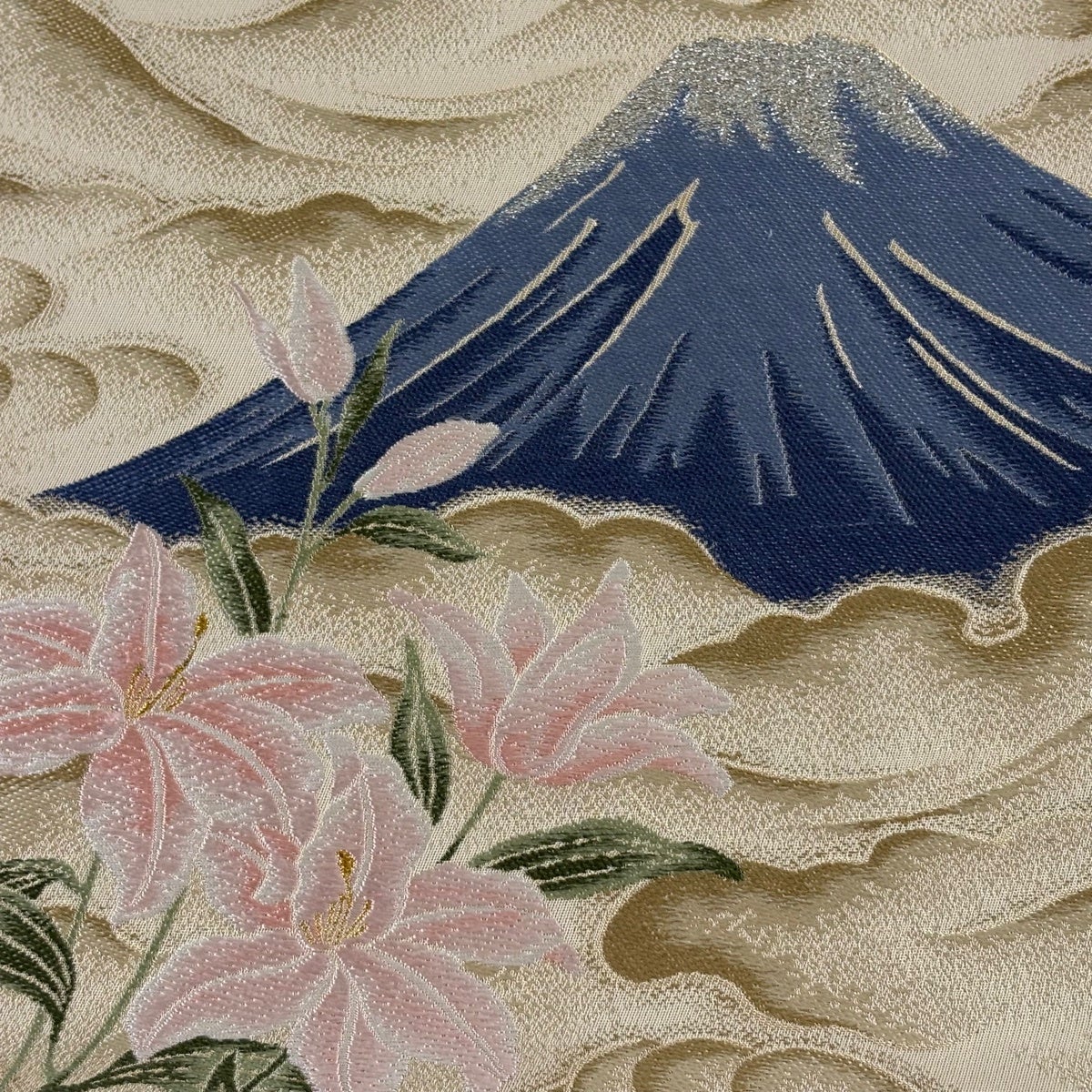 【美品】 袋帯 秀品 鈴乃屋 草花 波 唐織 金糸 金色 お太鼓柄 正絹