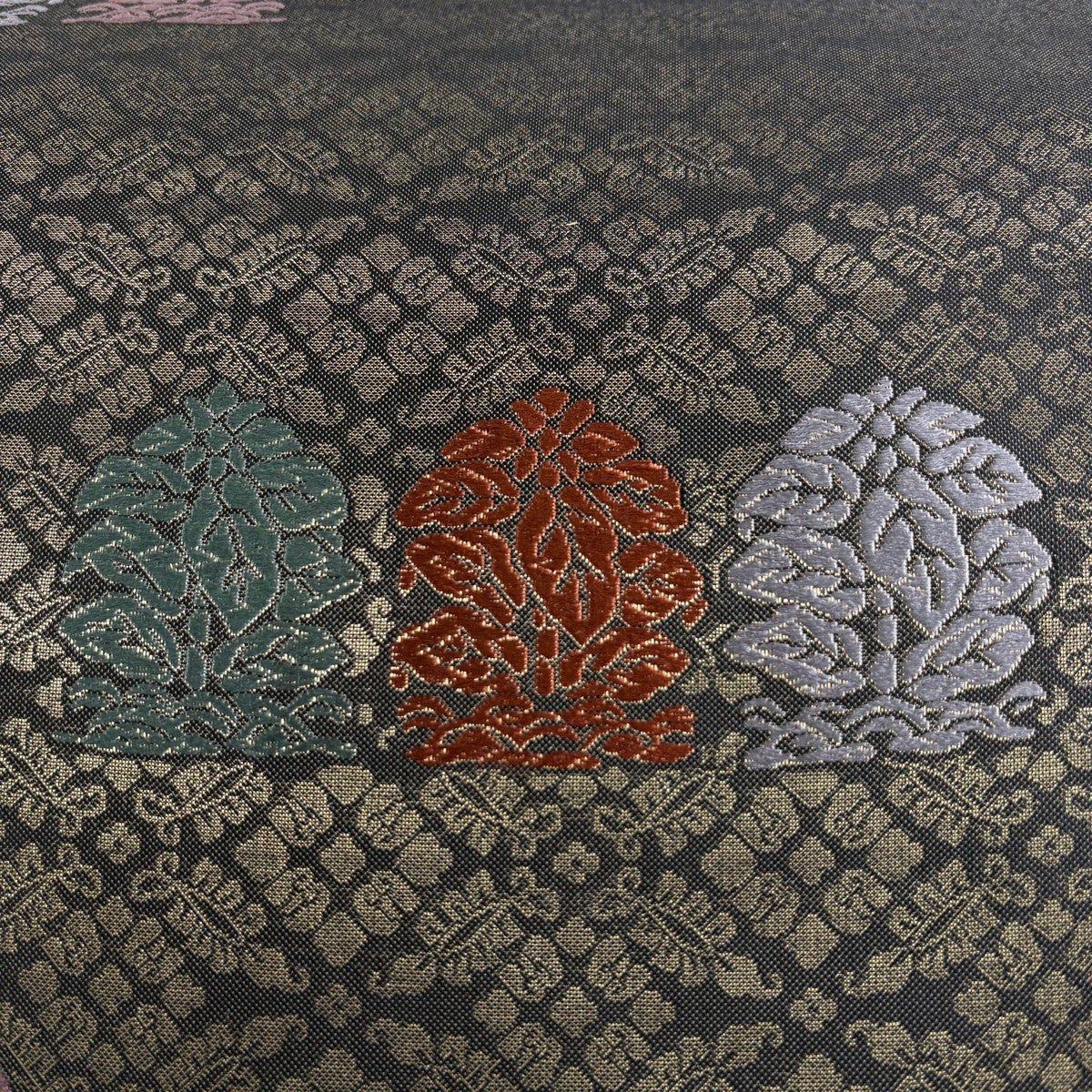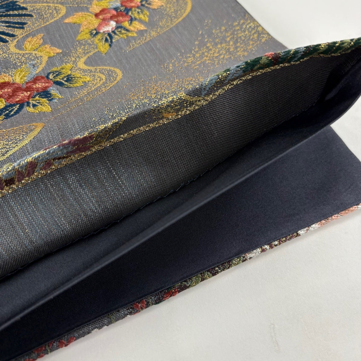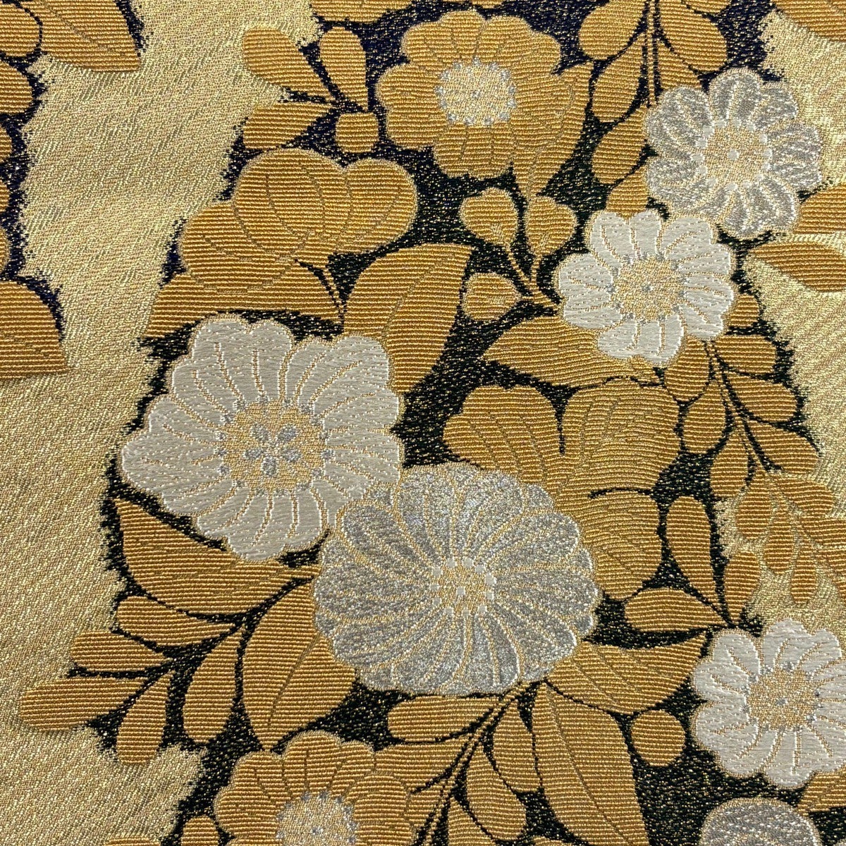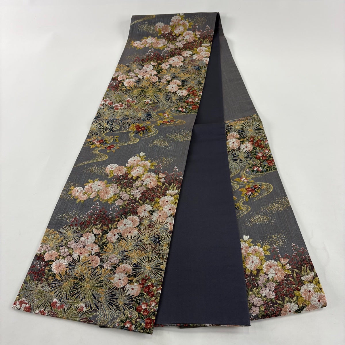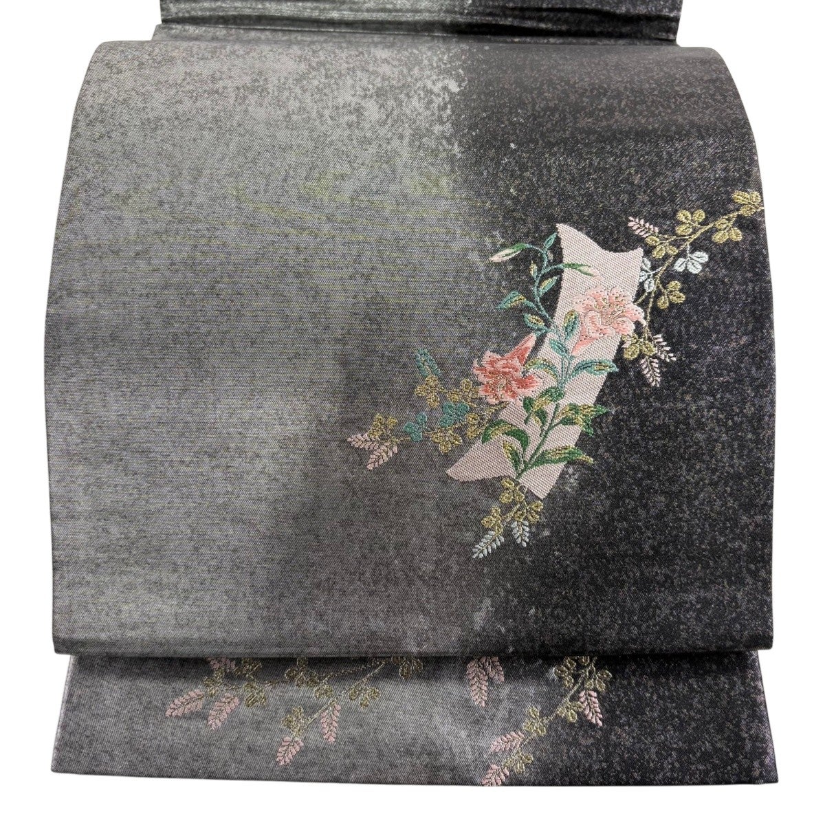 【美品】 袋帯 秀品 京の四季花 金糸 箔 黒灰 お太鼓柄 正絹