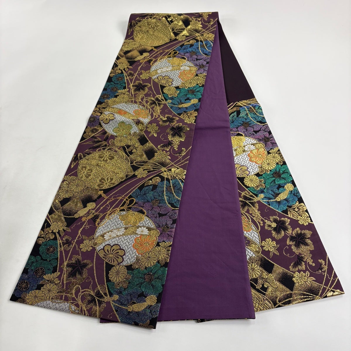 【美品】 袋帯 秀品 鈴 梅 金銀糸 箔 紫 六通 正絹