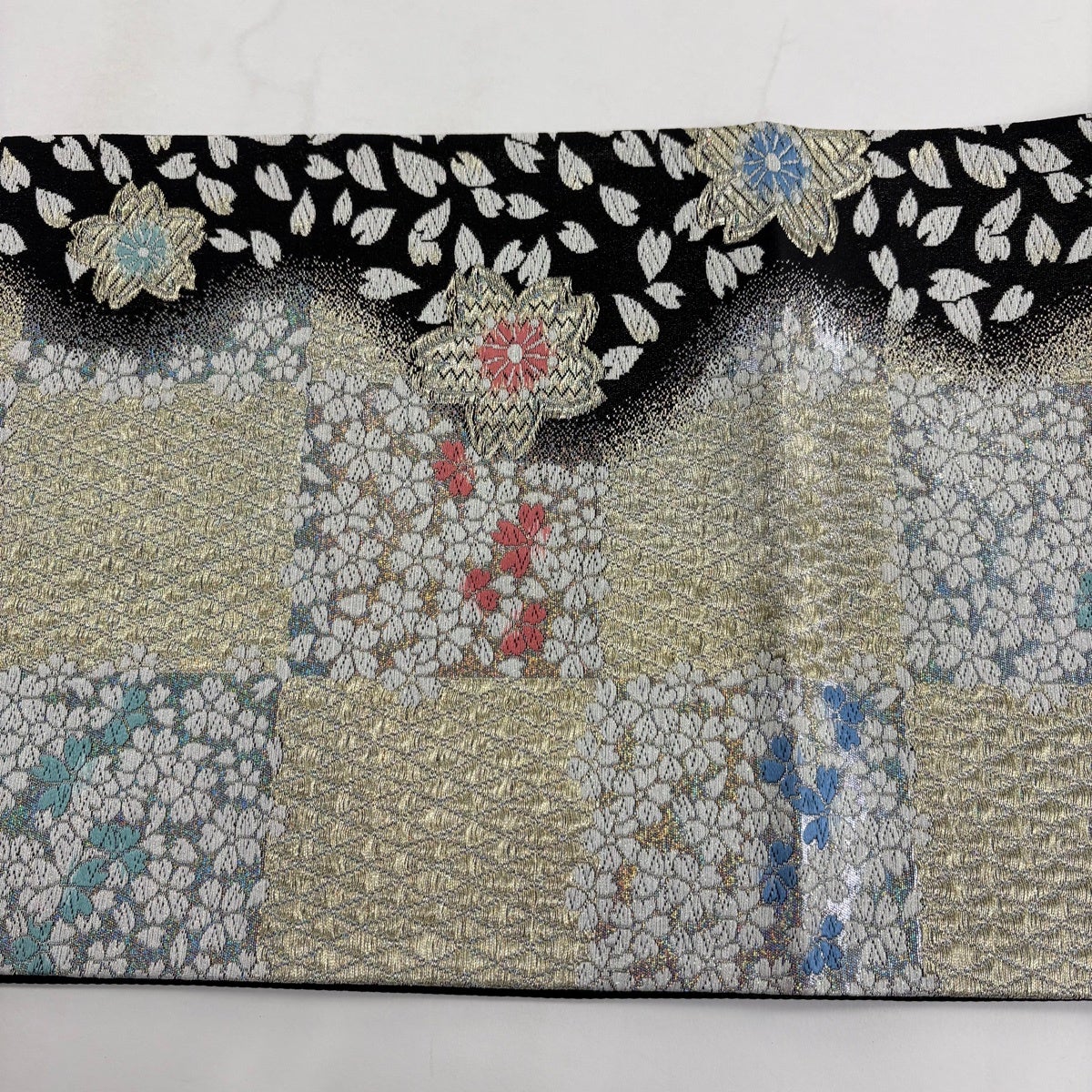 【美品】 袋帯 秀品 桜 市松 唐織 箔 黒 六通 正絹
