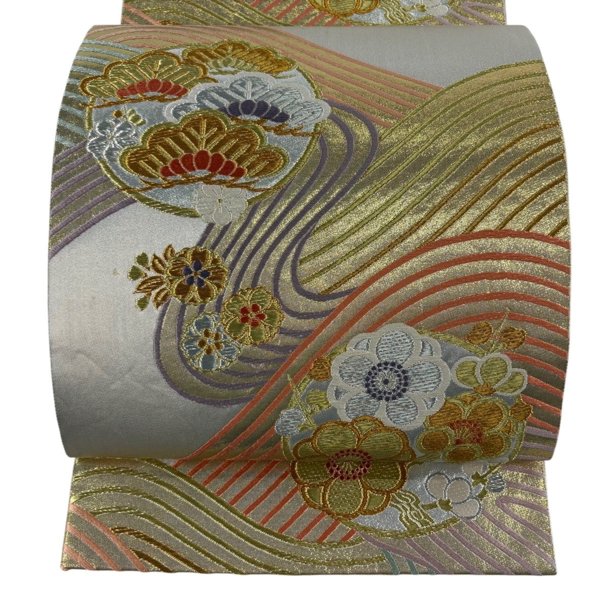 【美品】 袋帯 秀品 松梅 波 唐織 箔 金色 六通 正絹