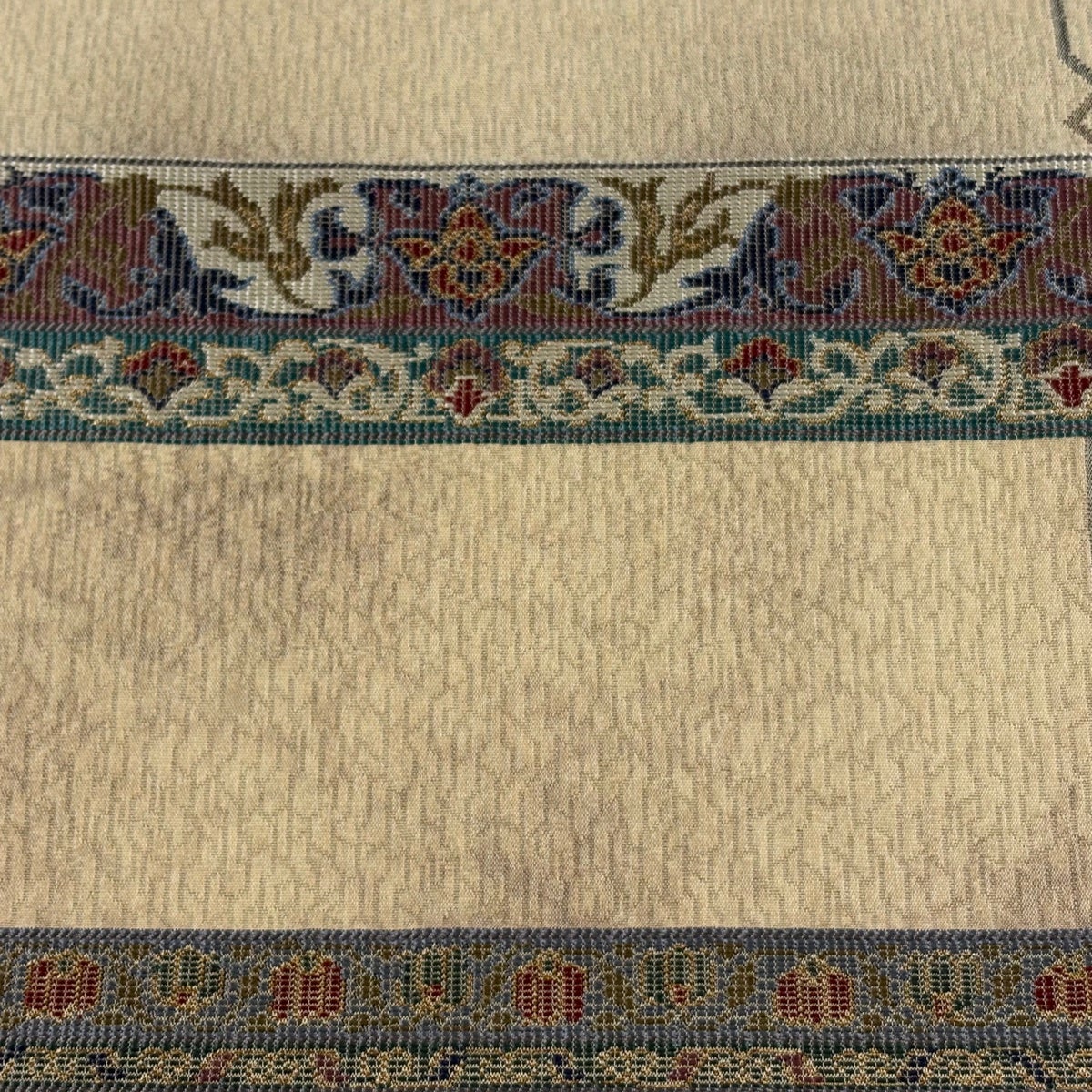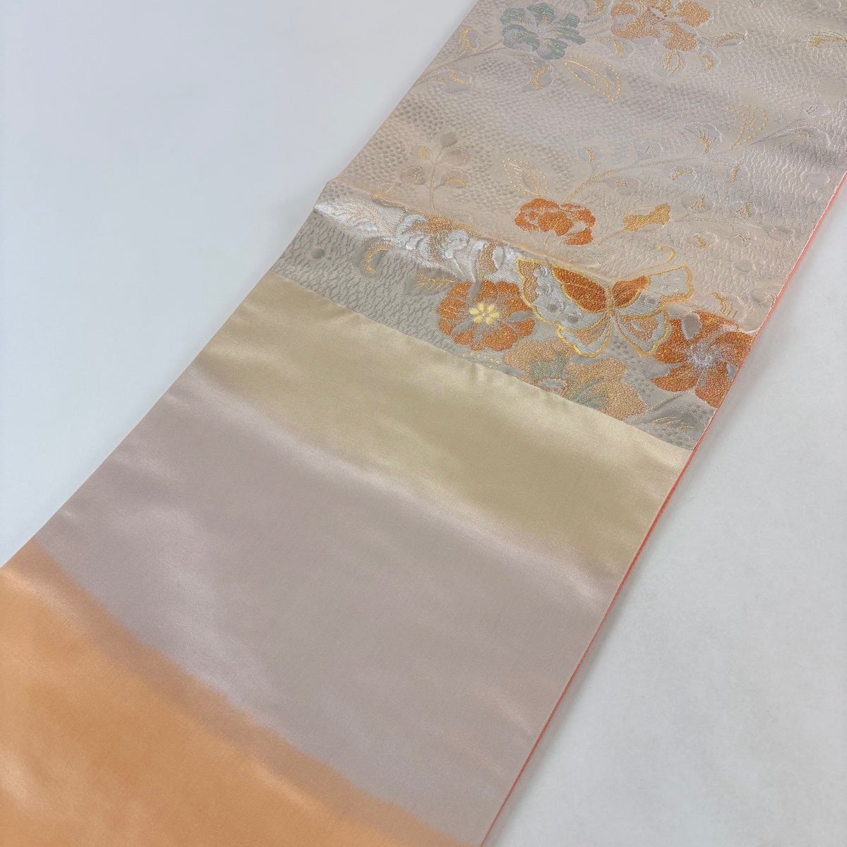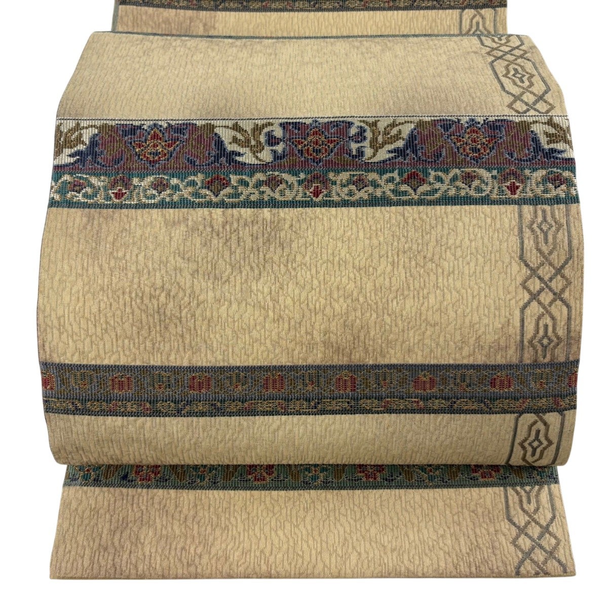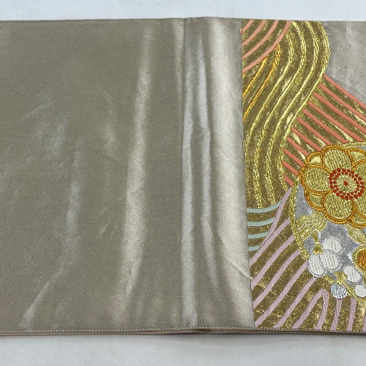 【美品】 袋帯 秀品 草花 幾何学模様 ベージュ お太鼓柄 正絹