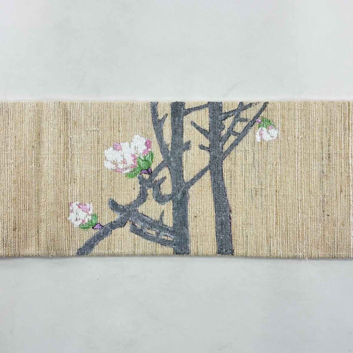 名古屋帯 秀品 落款あり 紬地 枝花 ベージュ 正絹