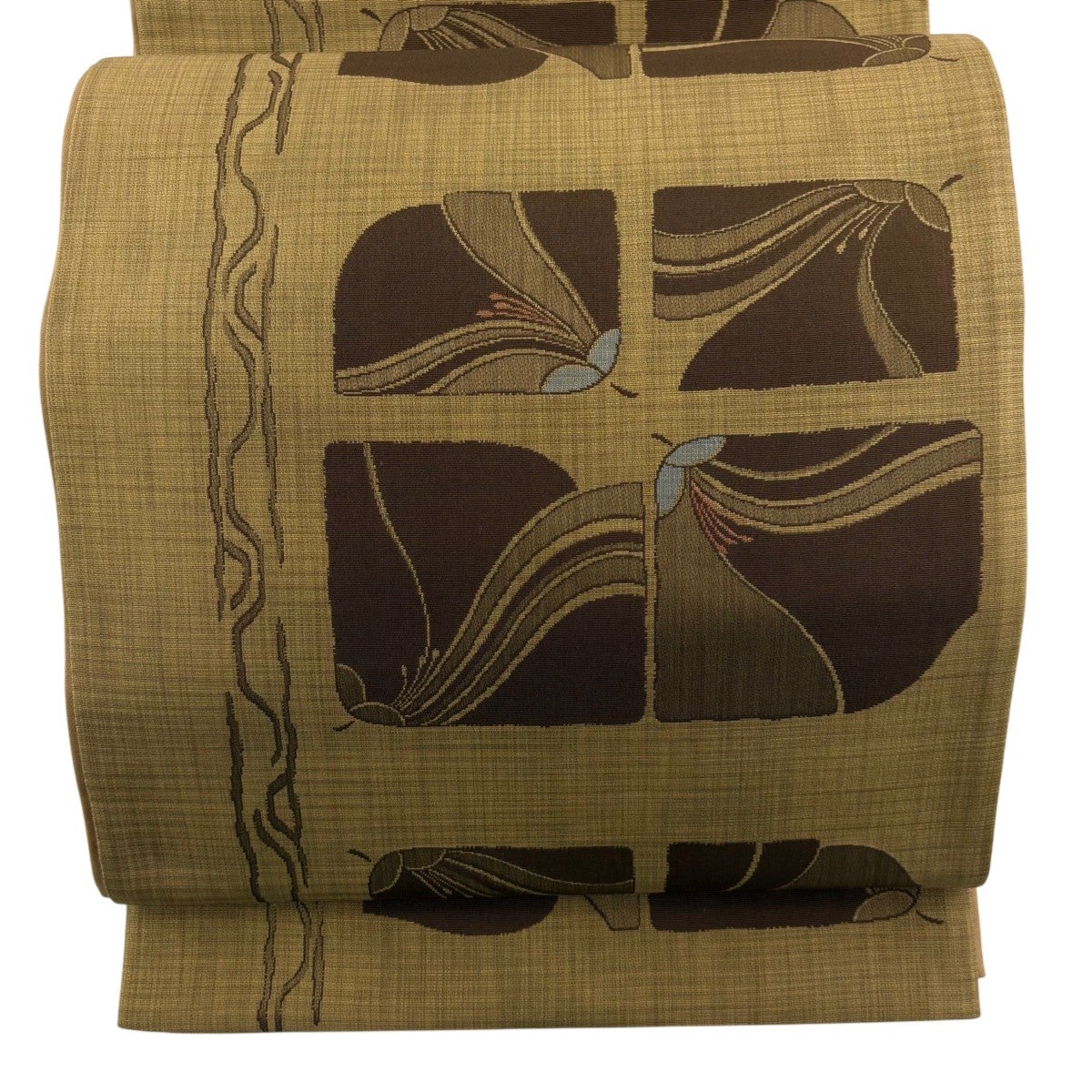 【美品】 袋帯 秀品 花 幾何学模様 薄茶色 六通 正絹