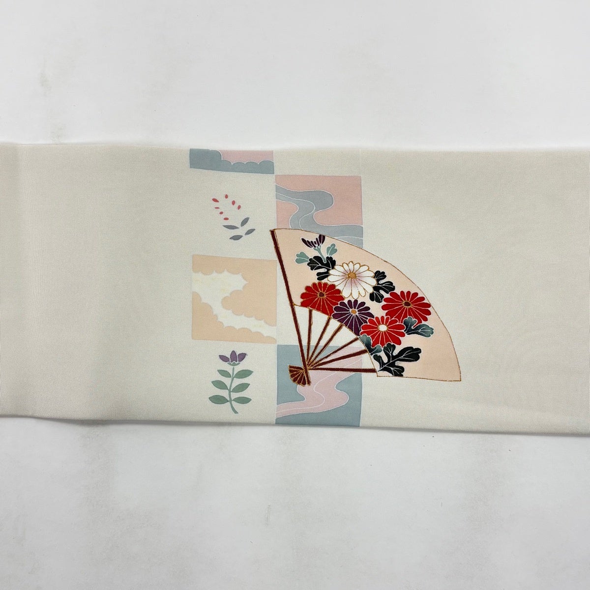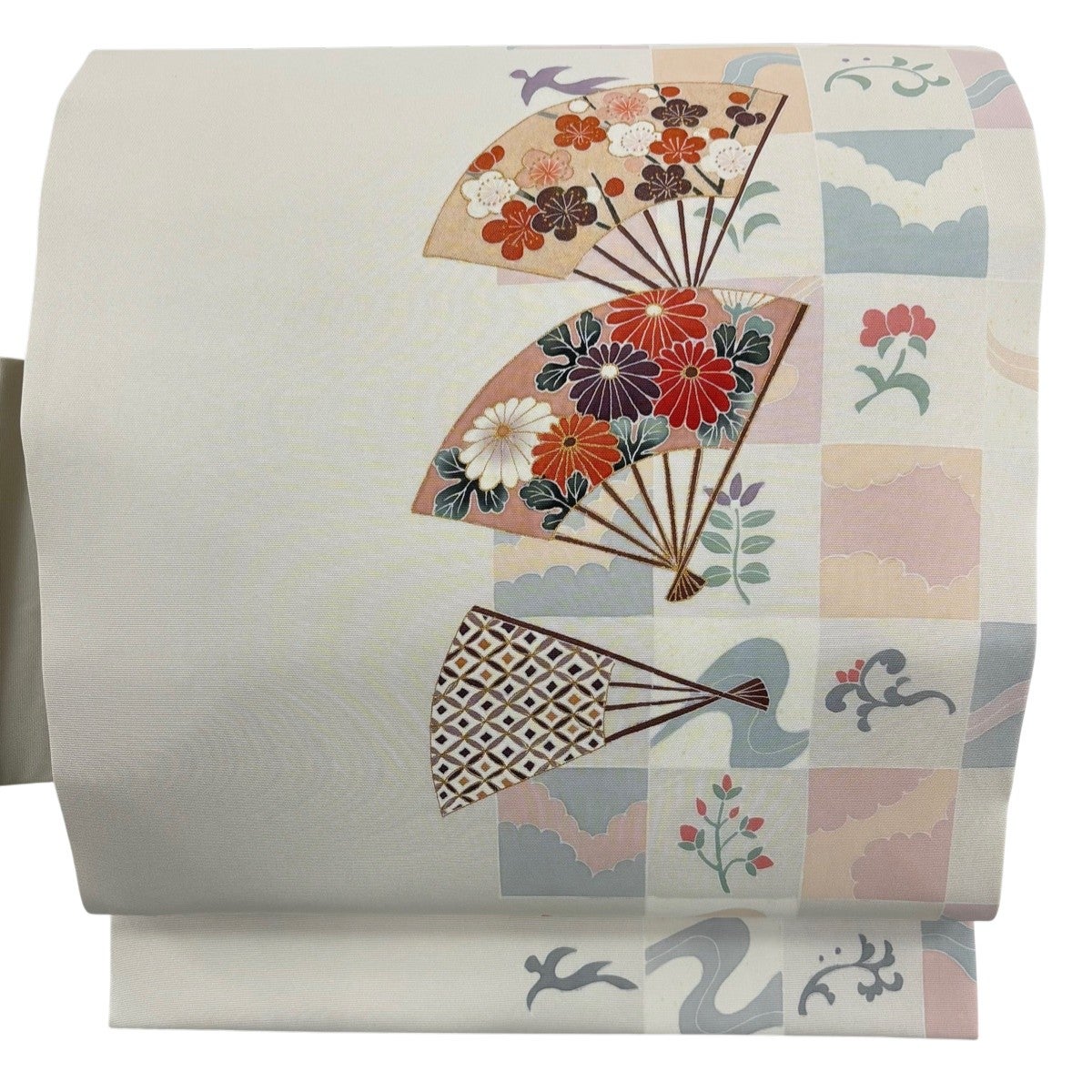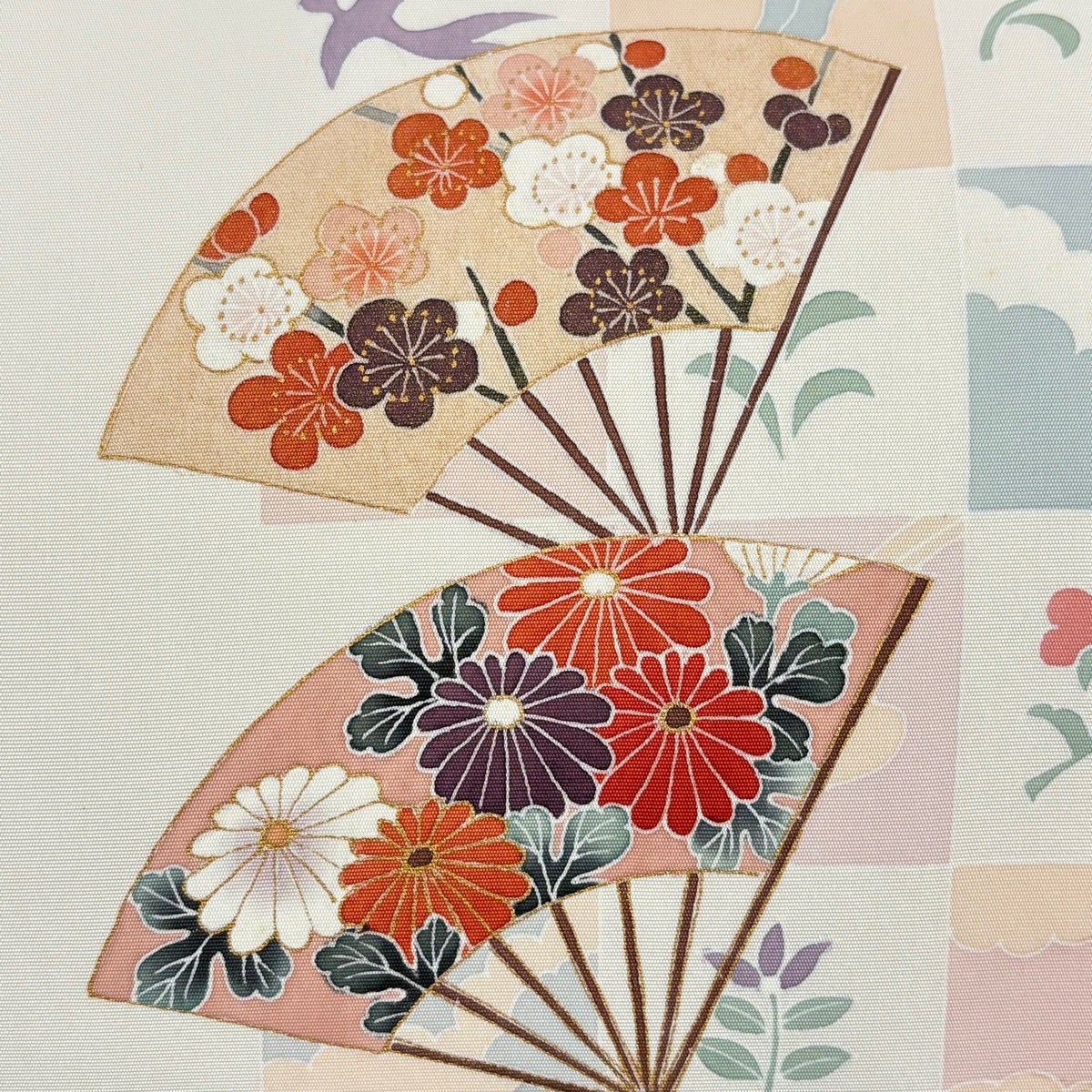 名古屋帯 秀品 落款あり 扇 枝梅 金彩 ベージュ 正絹