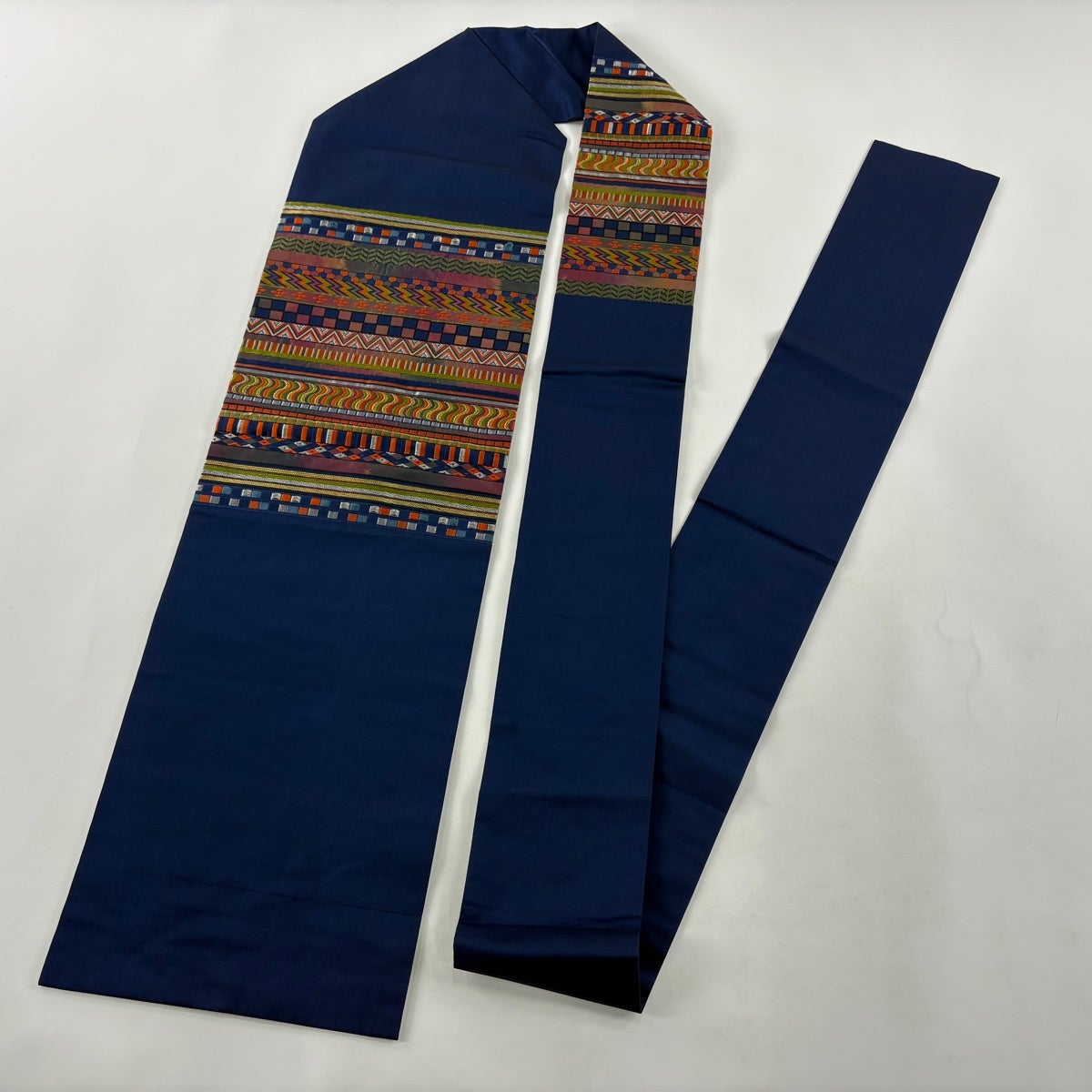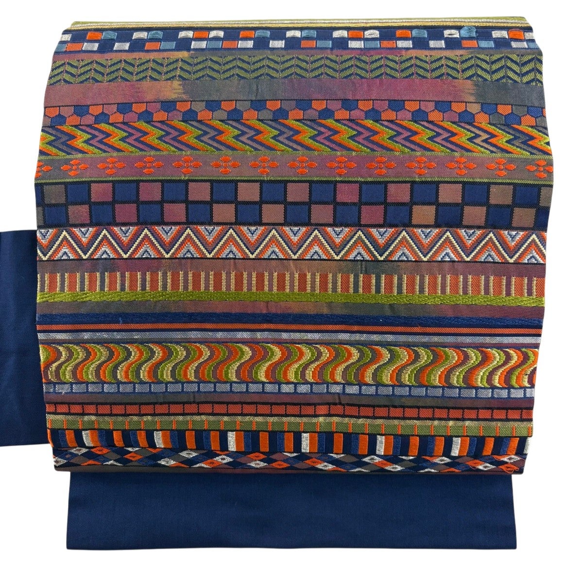 名古屋帯 秀品 段縞 流水 金銀糸 紺色 正絹