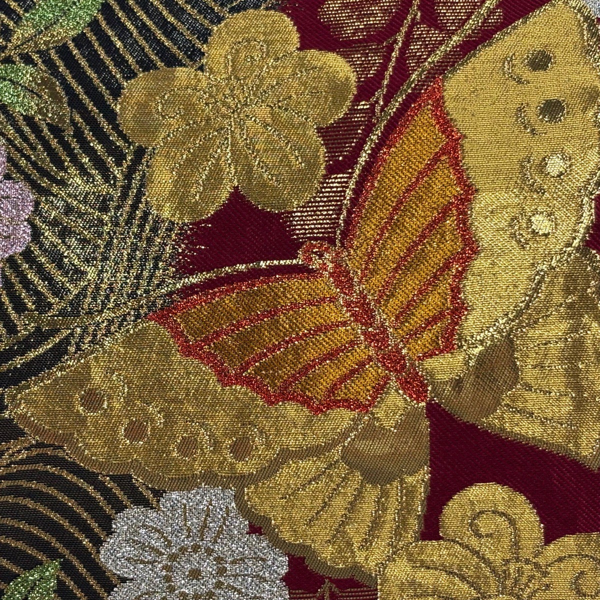 【美品】 袋帯 秀品 蝶 椿 金糸 箔 えんじ色 六通 正絹
