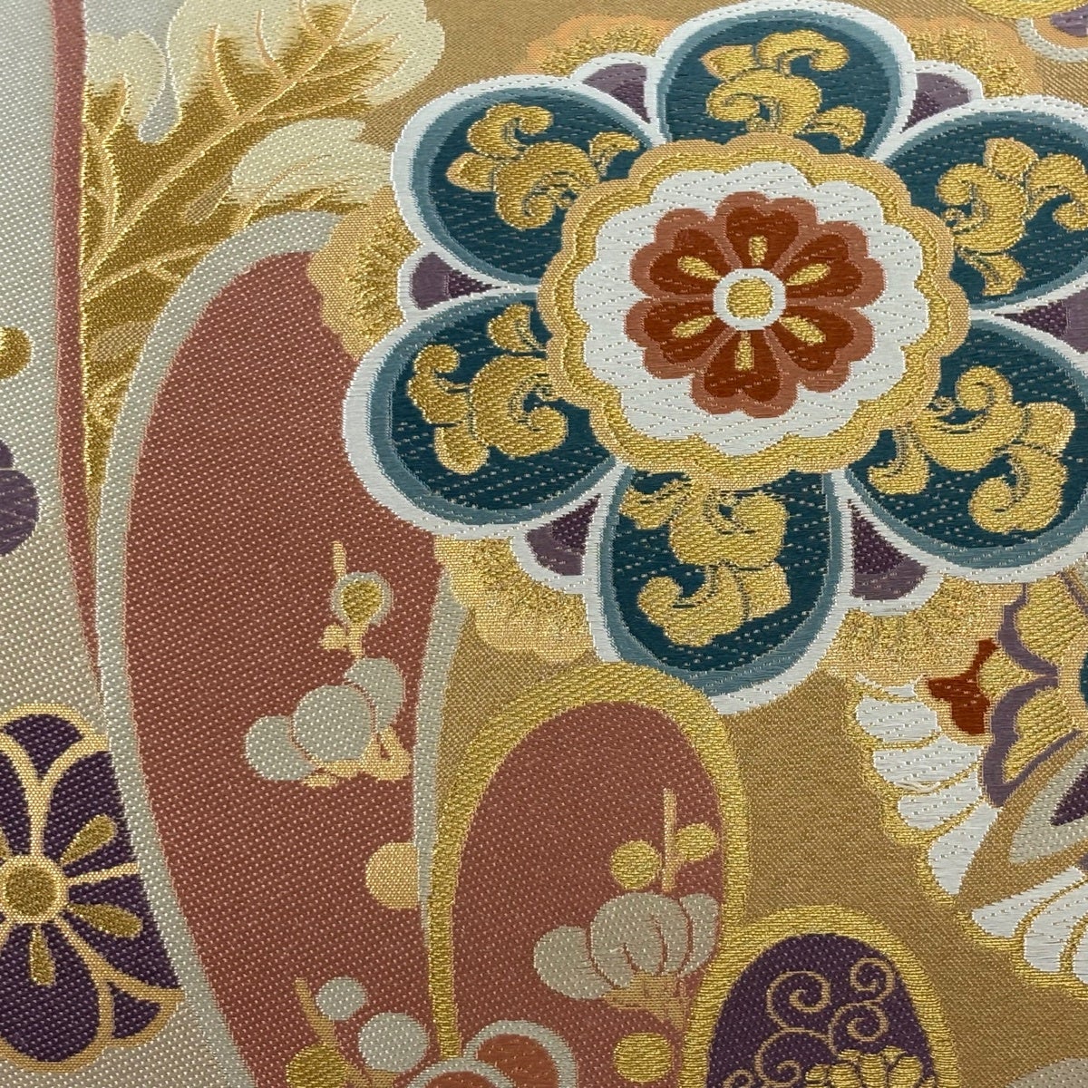 【美品】 袋帯 秀品 菊 枝梅 唐織 箔 オレンジ 六通 正絹