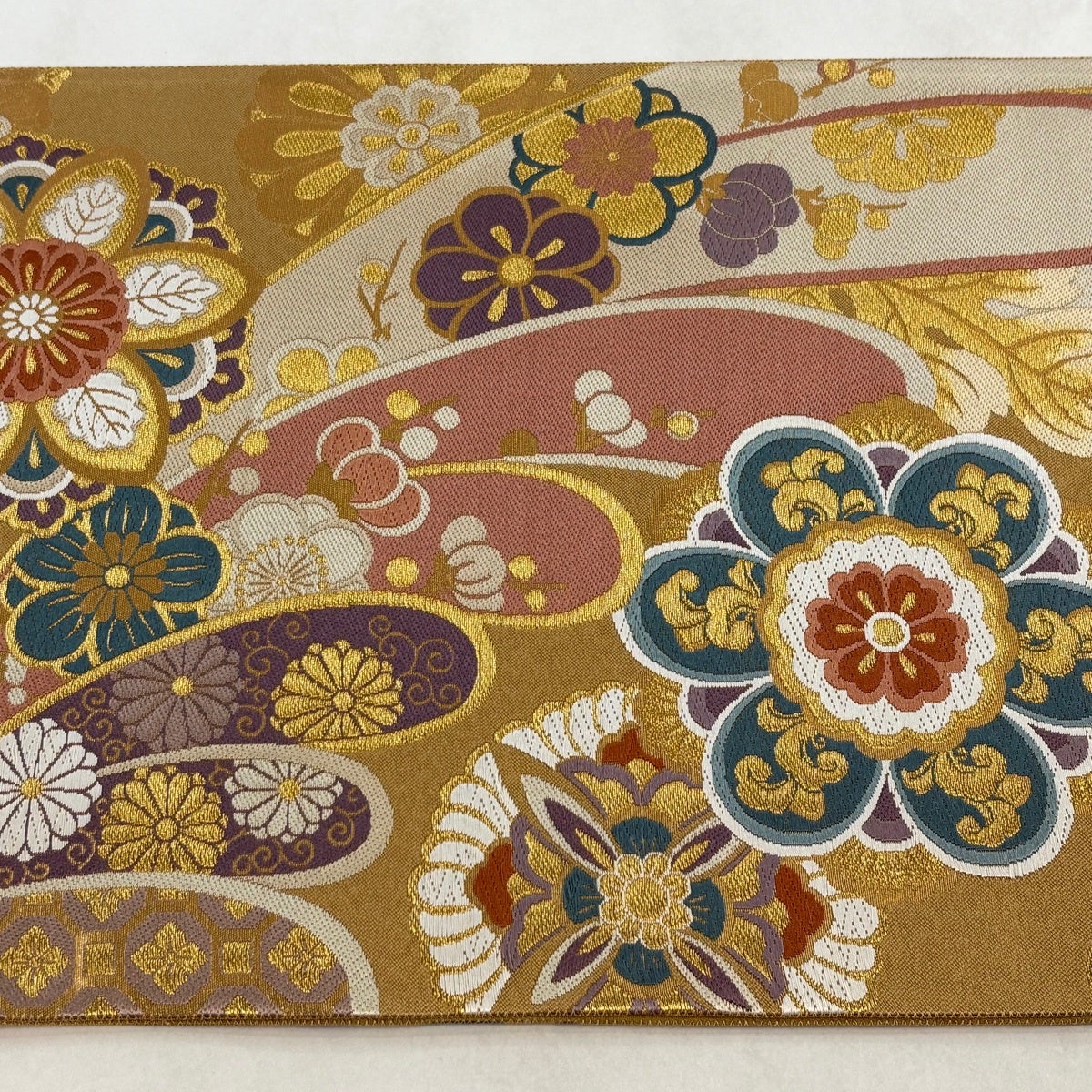【美品】 袋帯 秀品 彩虹波 金糸 黄土色 六通 正絹