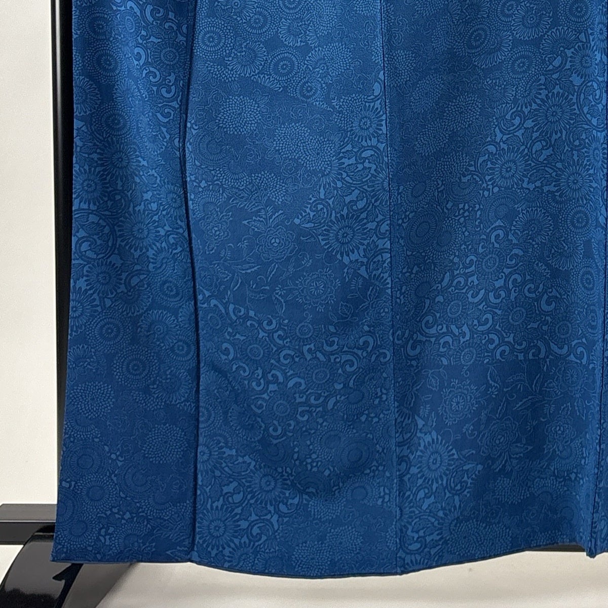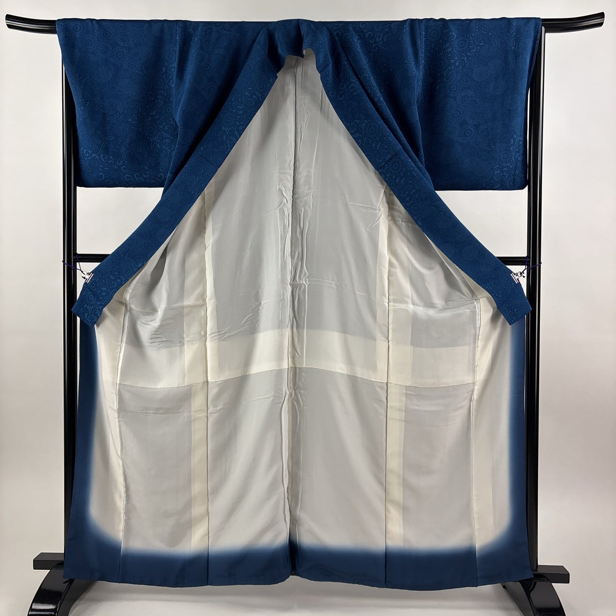 【美品】 小紋 身丈163cm 裄丈66cm M 袷 落款あり 花唐草 縮緬 藍色 正絹 秀品