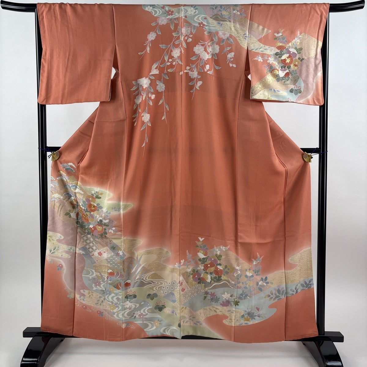 訪問着 身丈160cm 裄丈66.5cm M 袷 菊 鴛鴦 金糸 金銀彩 サーモンピンク 正絹 秀品