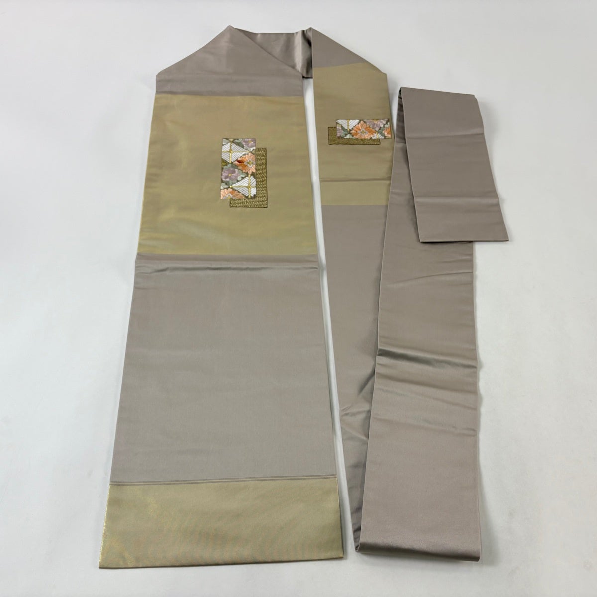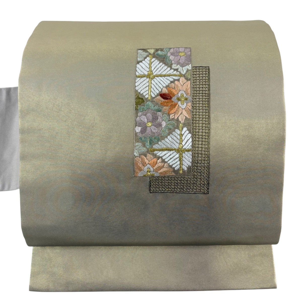 【美品】 袋帯 秀品 格天井 草花 金糸 箔 灰緑 六通 正絹
