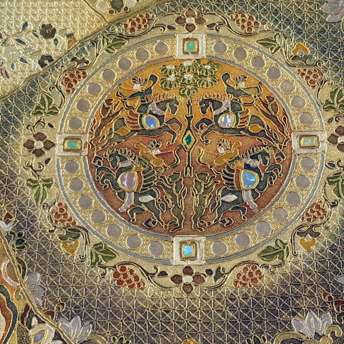 【美品】 袋帯 秀品 本金プラチナ箔 平安御苑文 金糸 銀色 六通 正絹