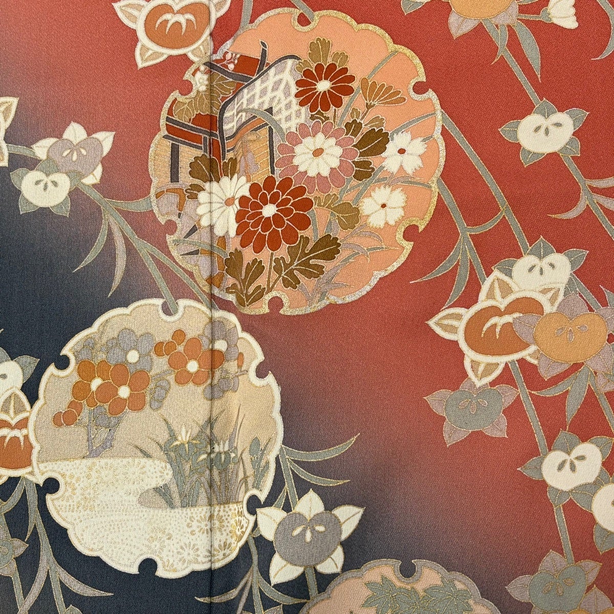 振袖 身丈166cm 裄丈63.5cm S 袷 秋草 霞 金糸 金彩 赤茶 正絹 秀品
