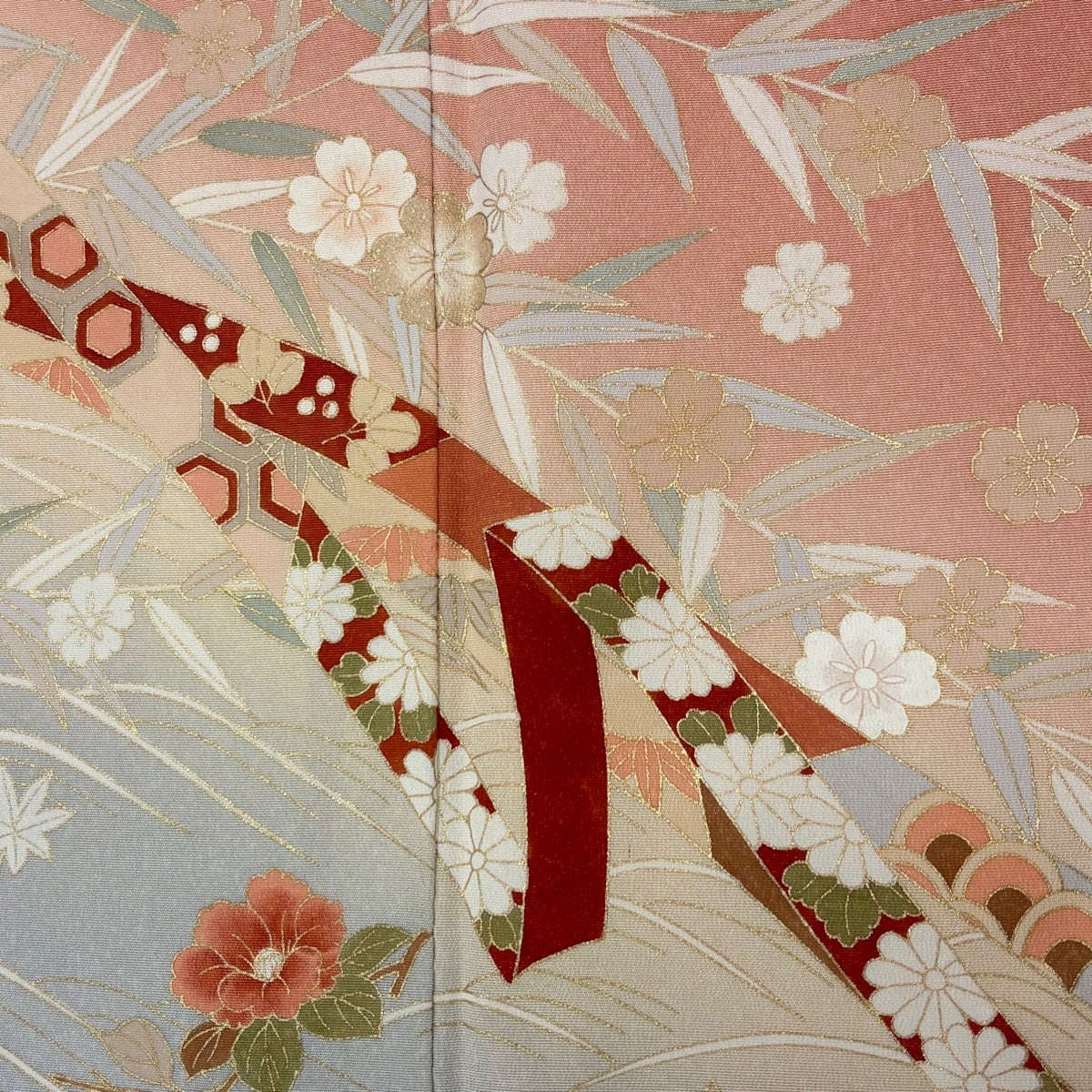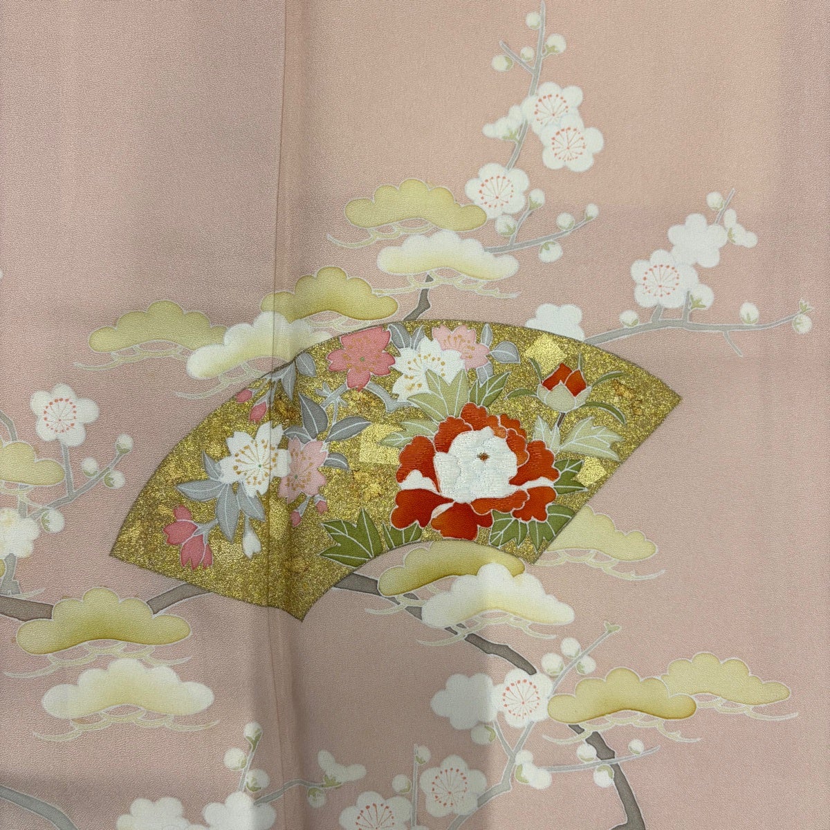 訪問着 身丈161cm 裄丈70cm L 袷 扇面 枝梅 金彩 染め分け 薄ピンク 正絹 秀品 一つ紋