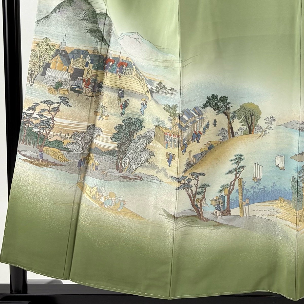 【美品】 色留袖 身丈155.5cm 裄丈63cm S 袷 落款あり 人物 風景 金銀糸 ぼかし よもぎ色 正絹 秀品 一つ紋