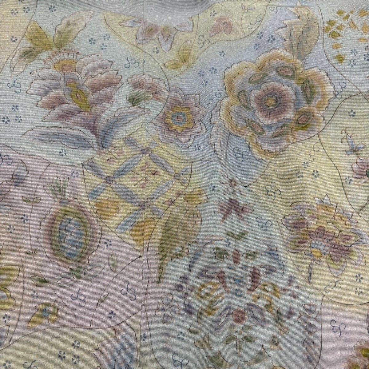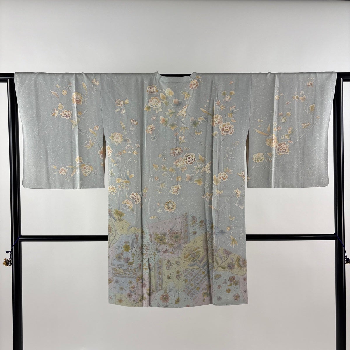 道行 身丈93cm 裄丈65cm M 和装コート 角衿 草花 鳥 金銀糸 ラメ糸 青灰色 正絹 秀品