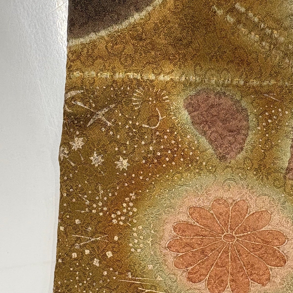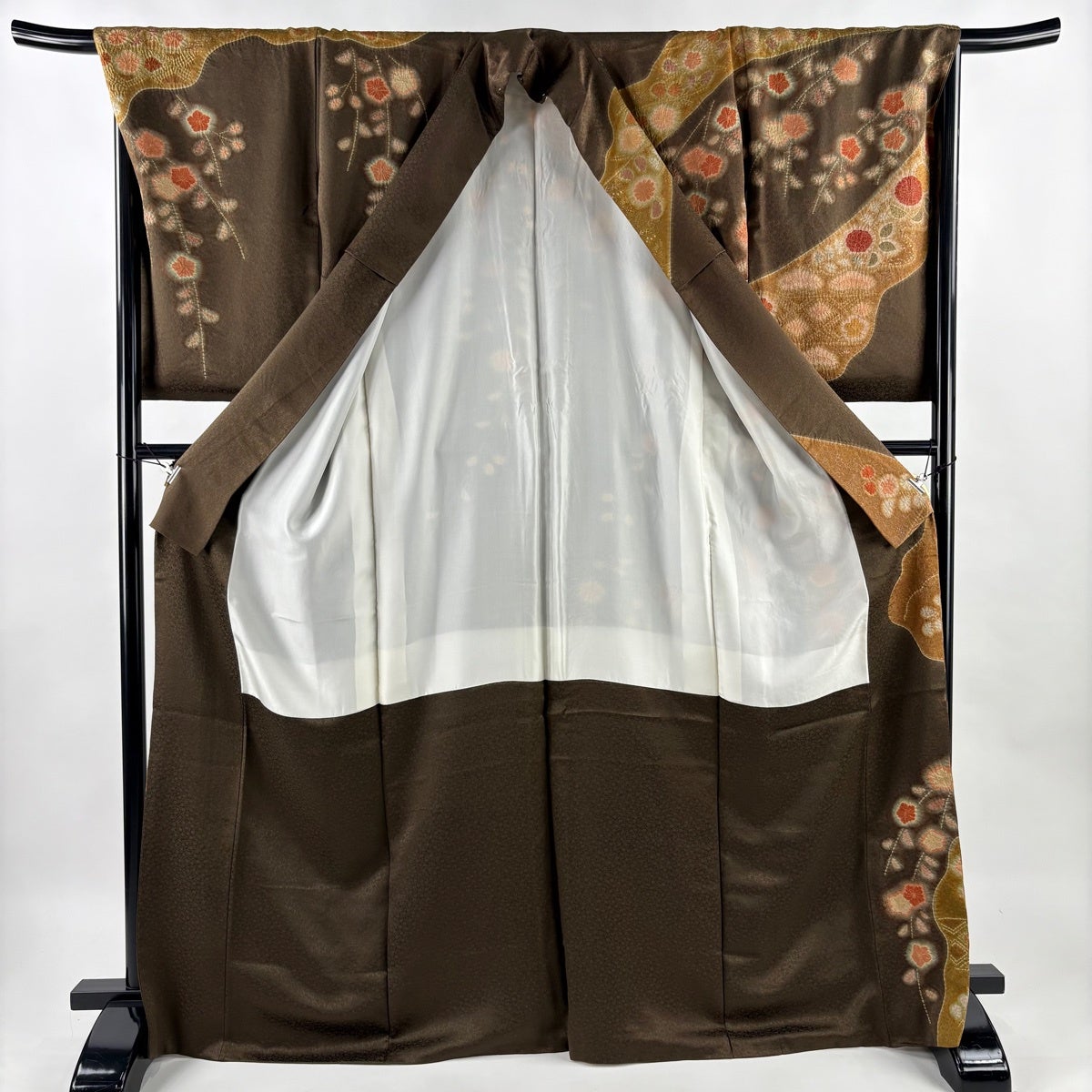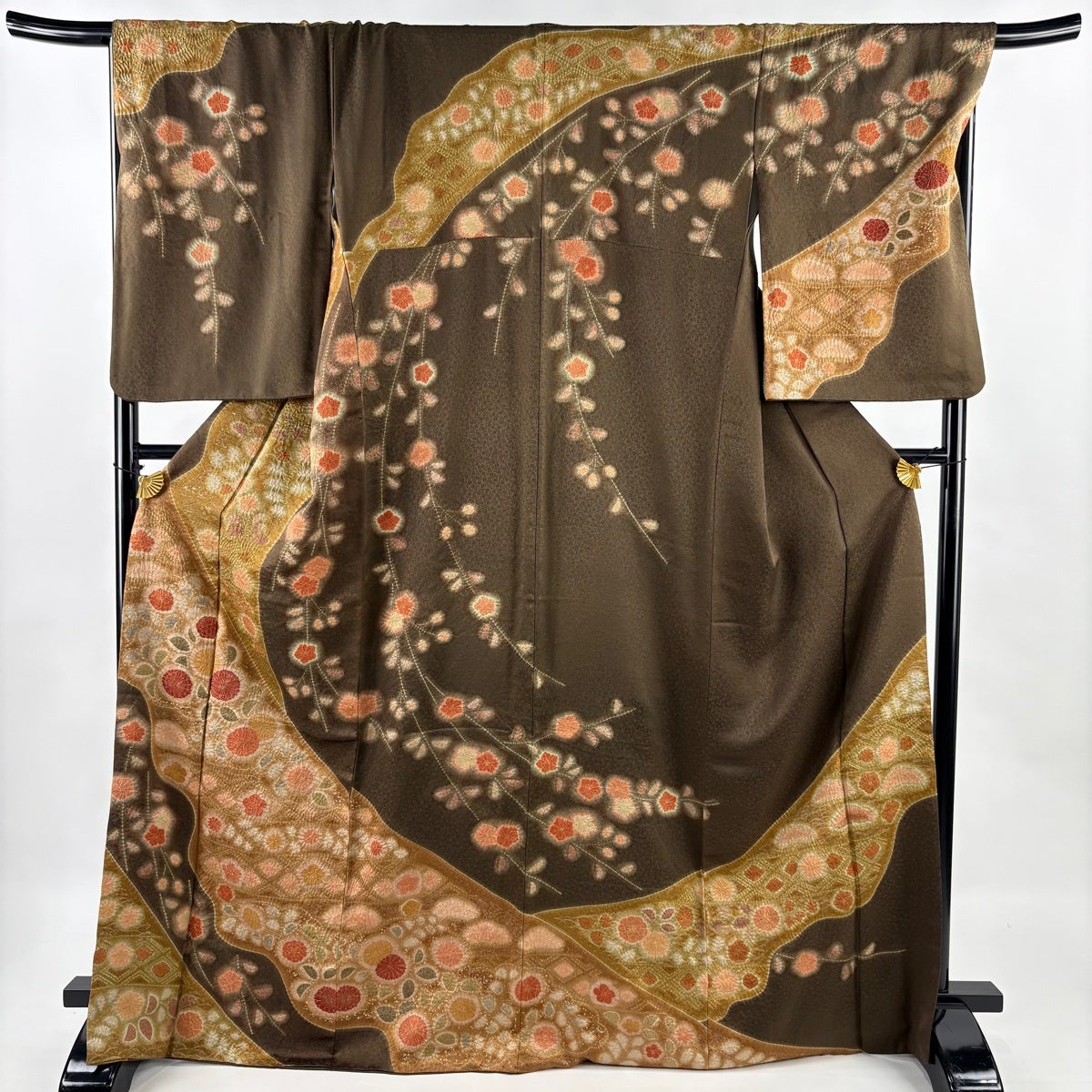 訪問着 身丈170cm 裄丈68.5cm L 袷 草花 道長取り 絞り 金彩 焦茶色 正絹 秀品