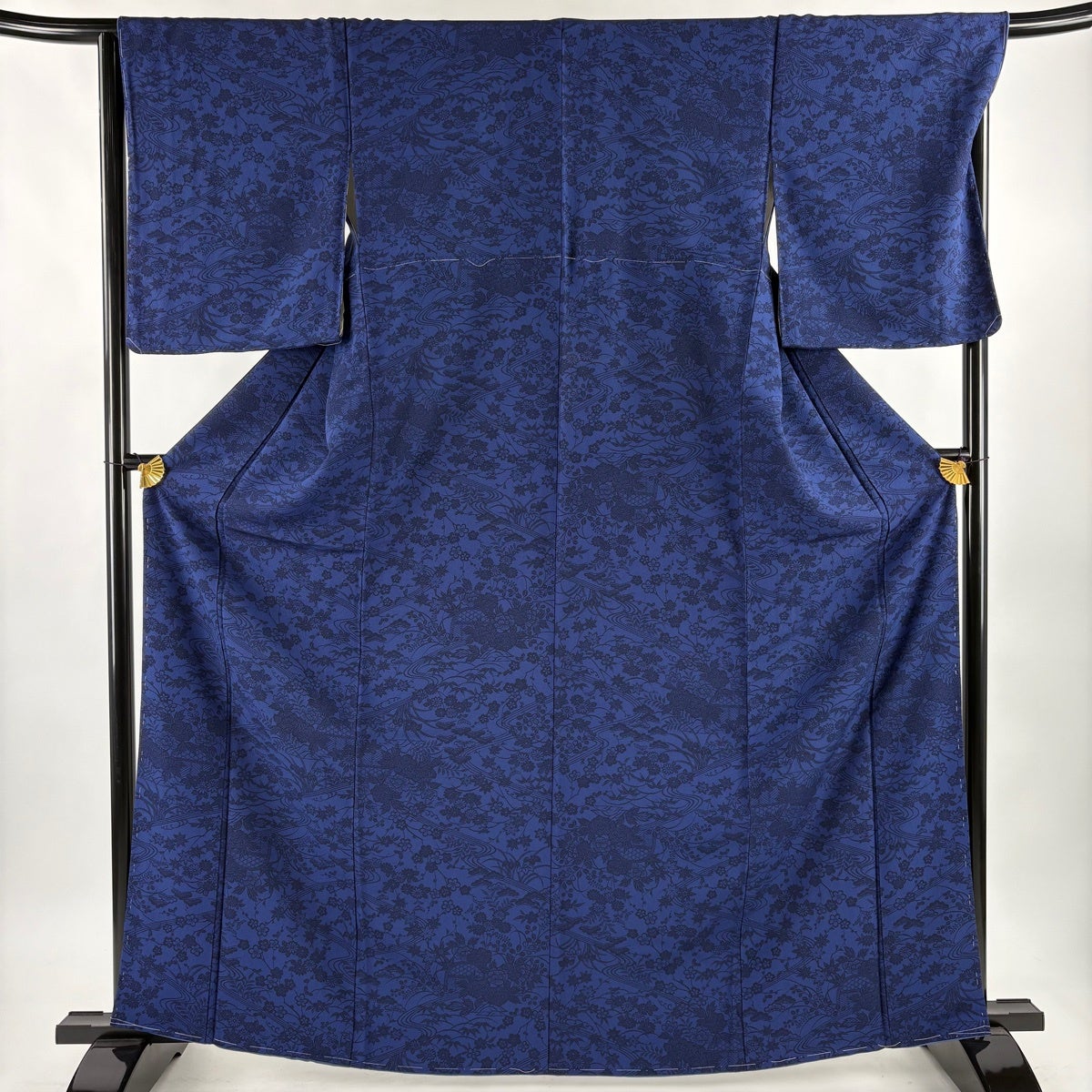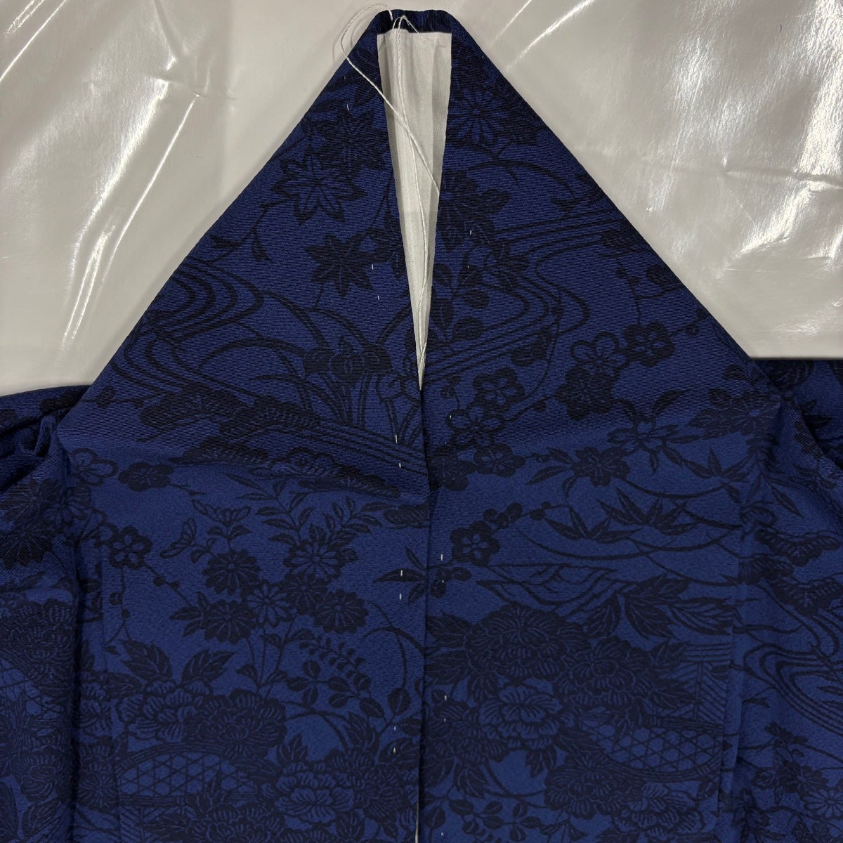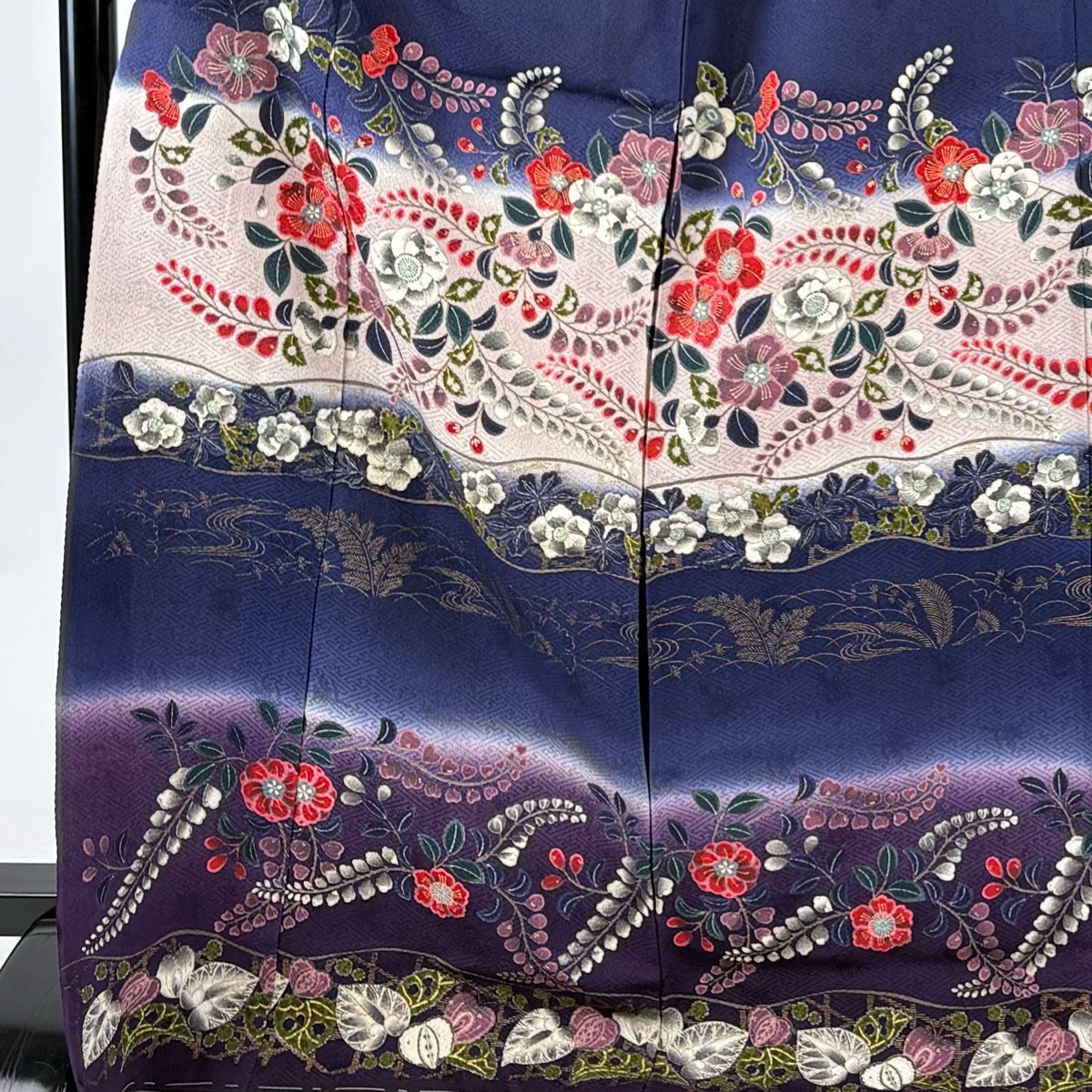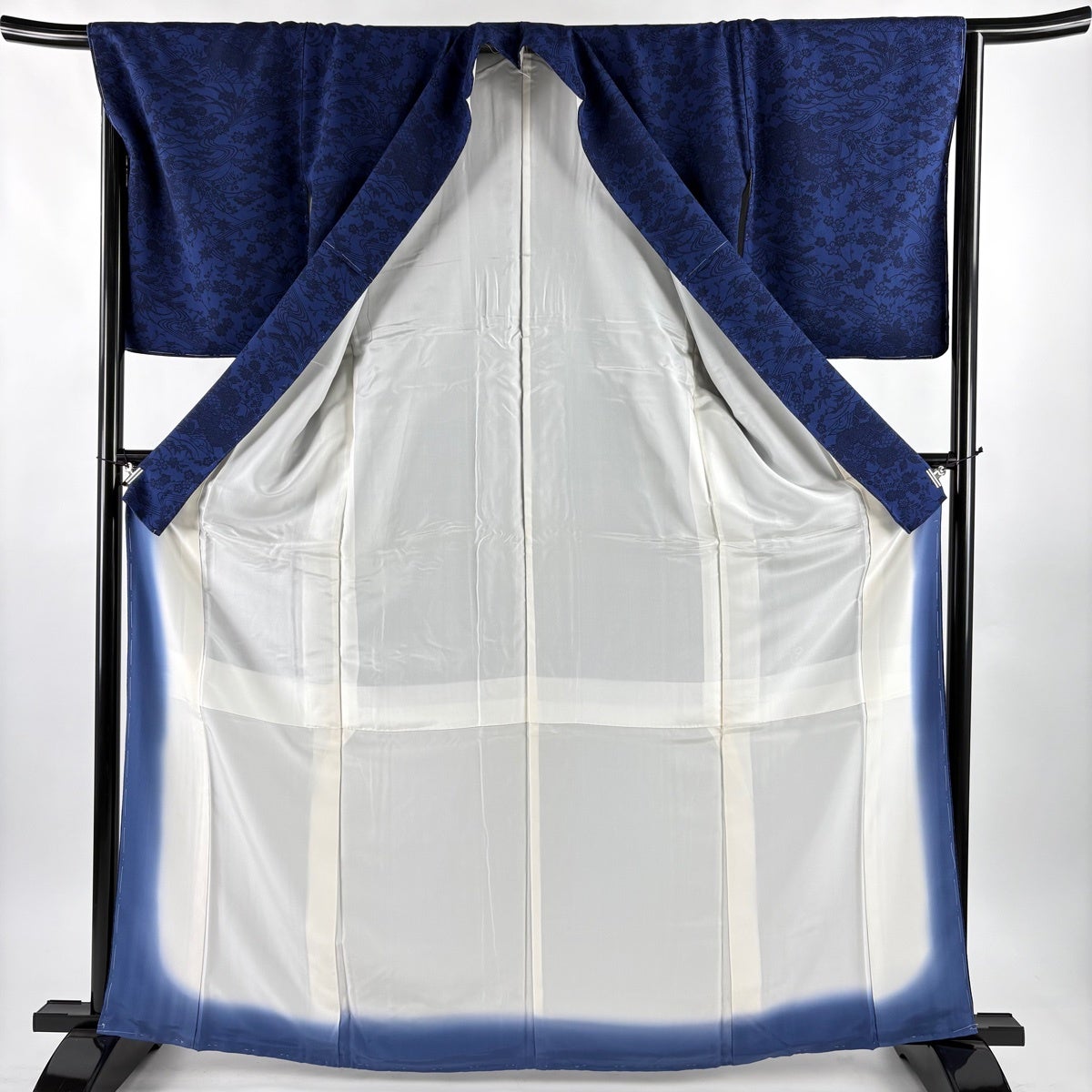 訪問着 身丈174cm 裄丈66.5cm M 未仕立て 仮絵羽 草花 流水 金彩 ぼかし 紺色 正絹 秀品