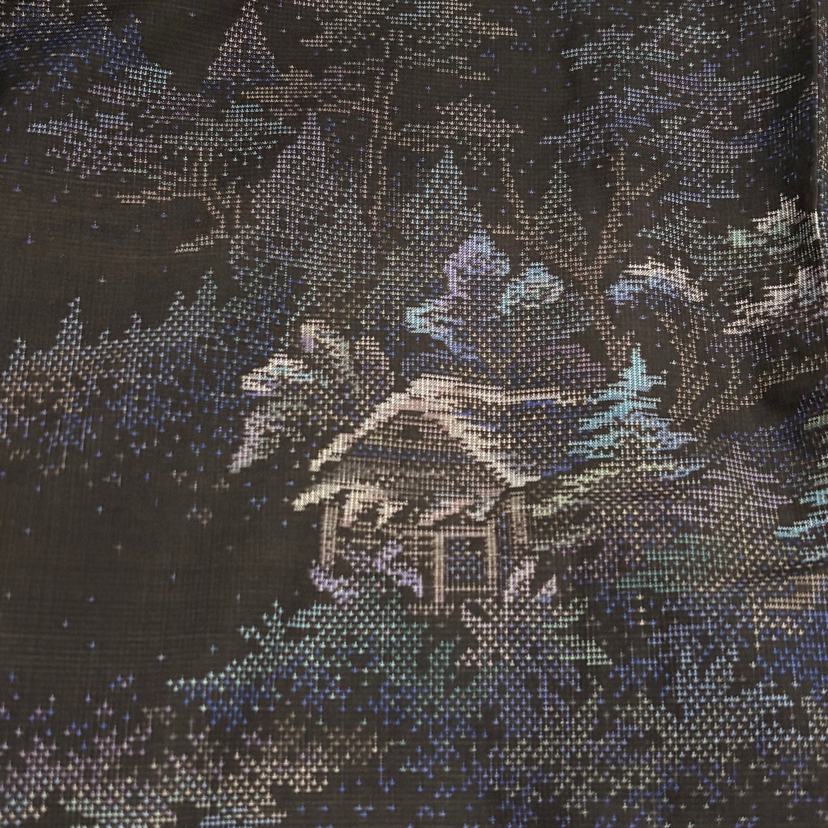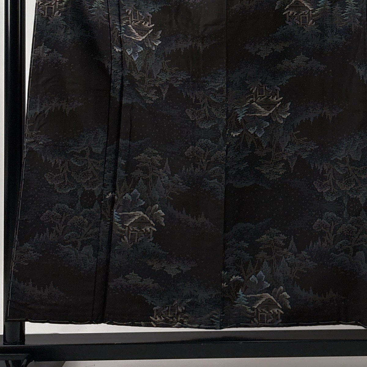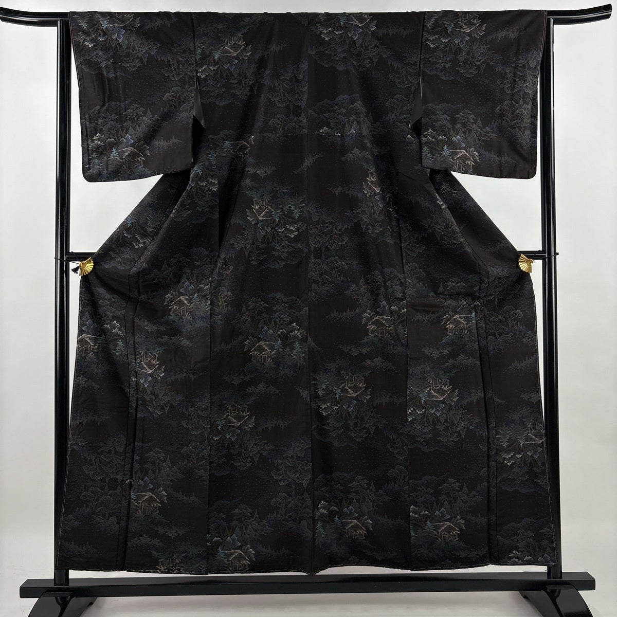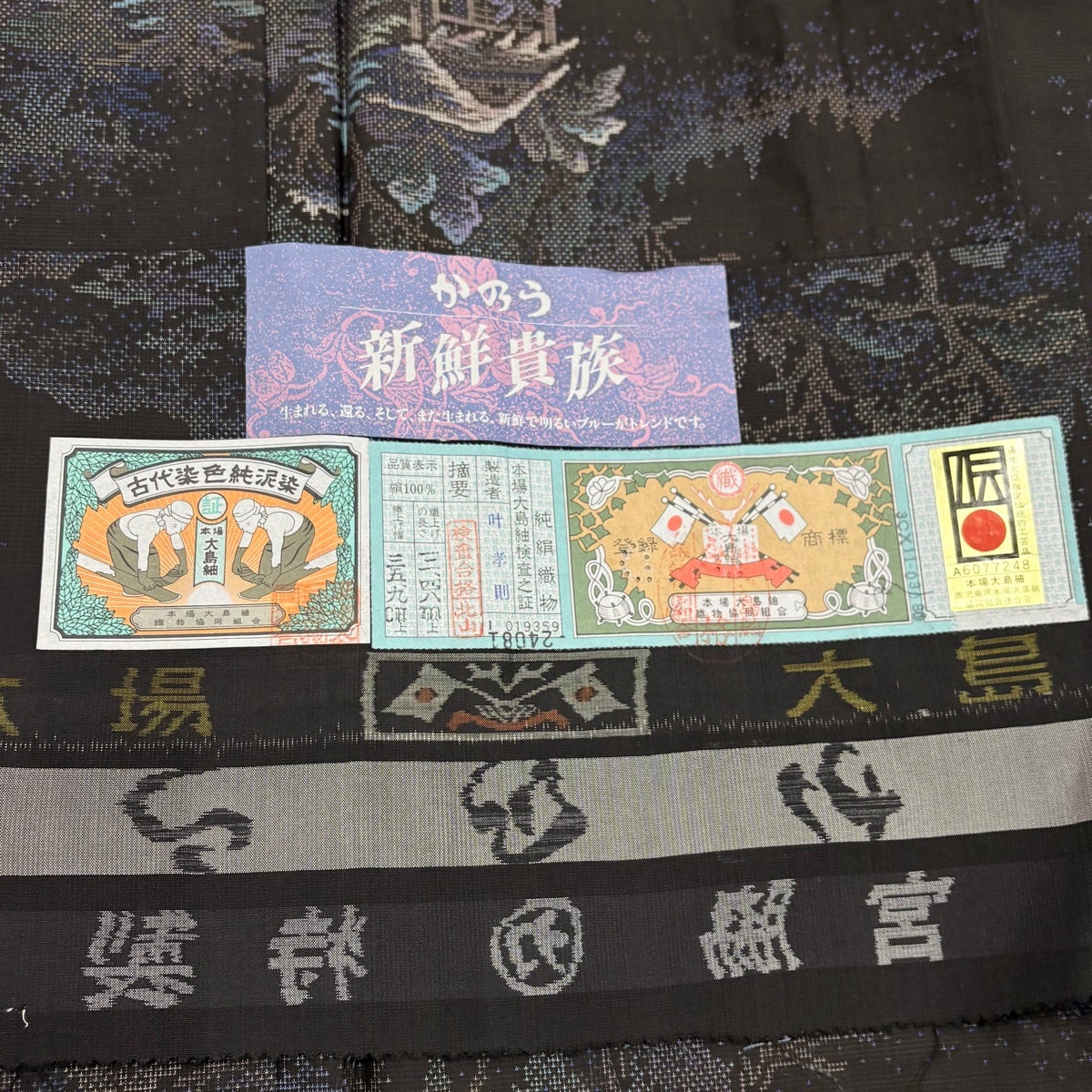 【美品】 大島紬 身丈158cm 裄丈64cm M 袷 純泥染 証紙あり 家屋 樹木 墨色 正絹 秀品