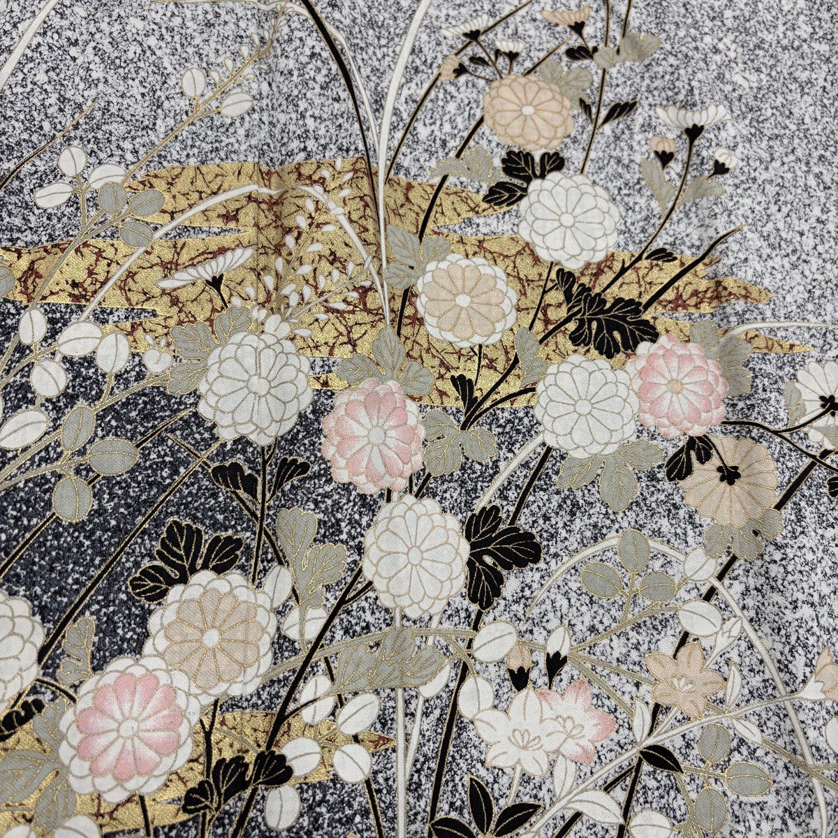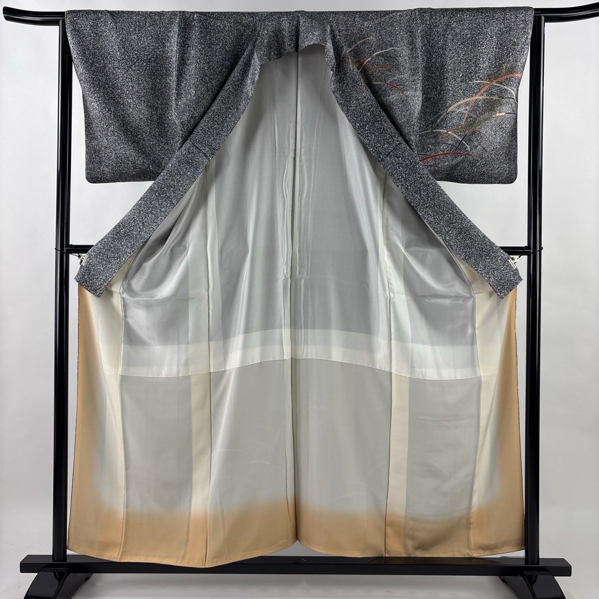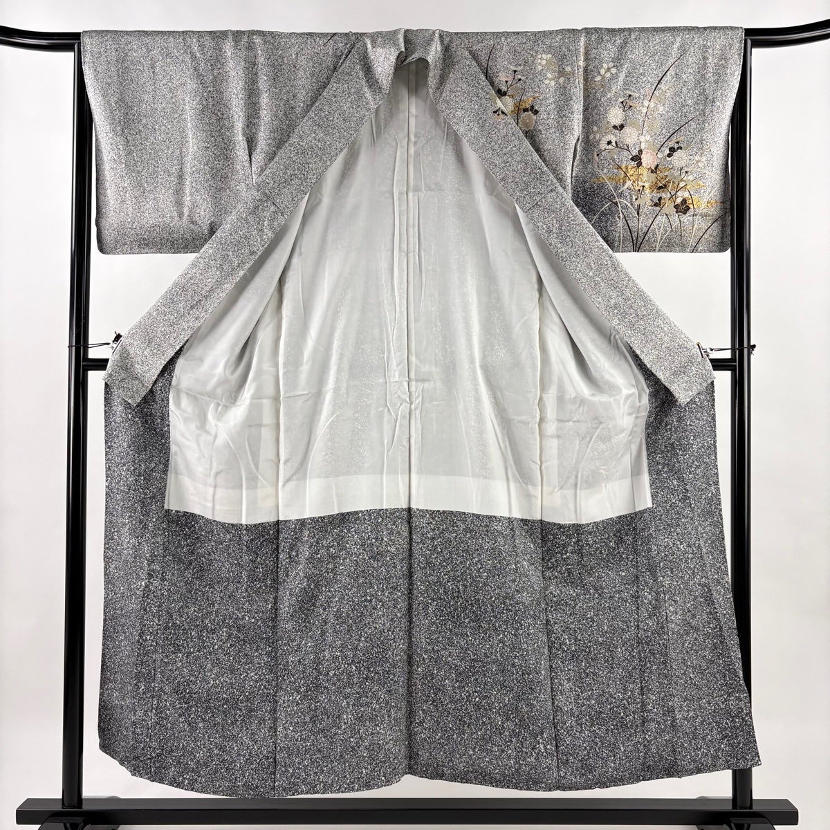 訪問着 身丈153cm 裄丈65.5cm M 袷 秋草 霞 金彩 ぼかし 黒灰 正絹 秀品