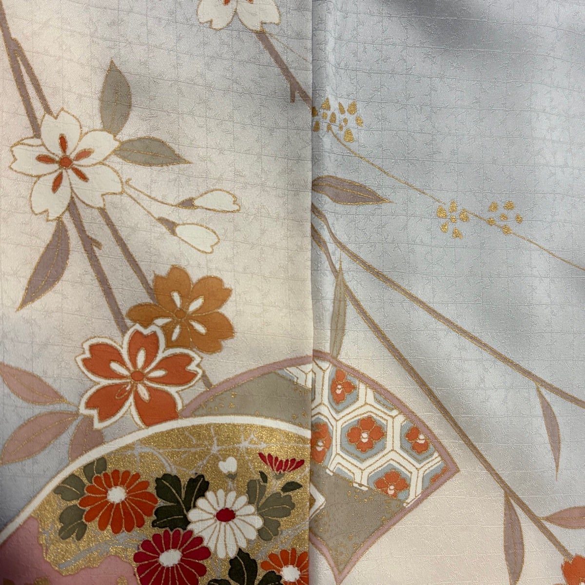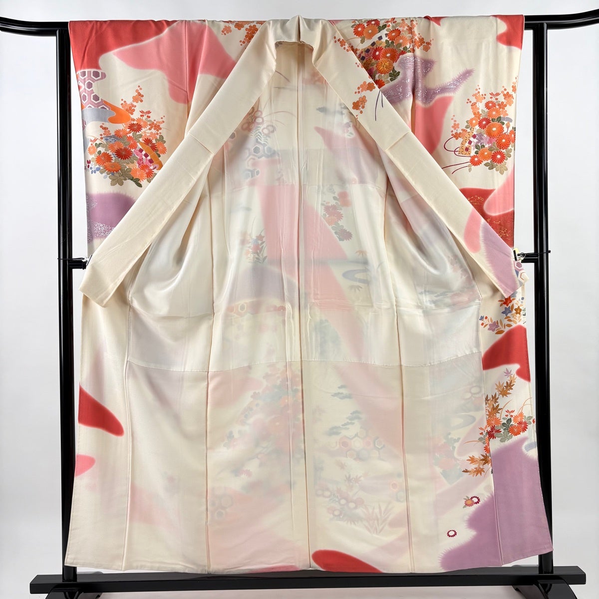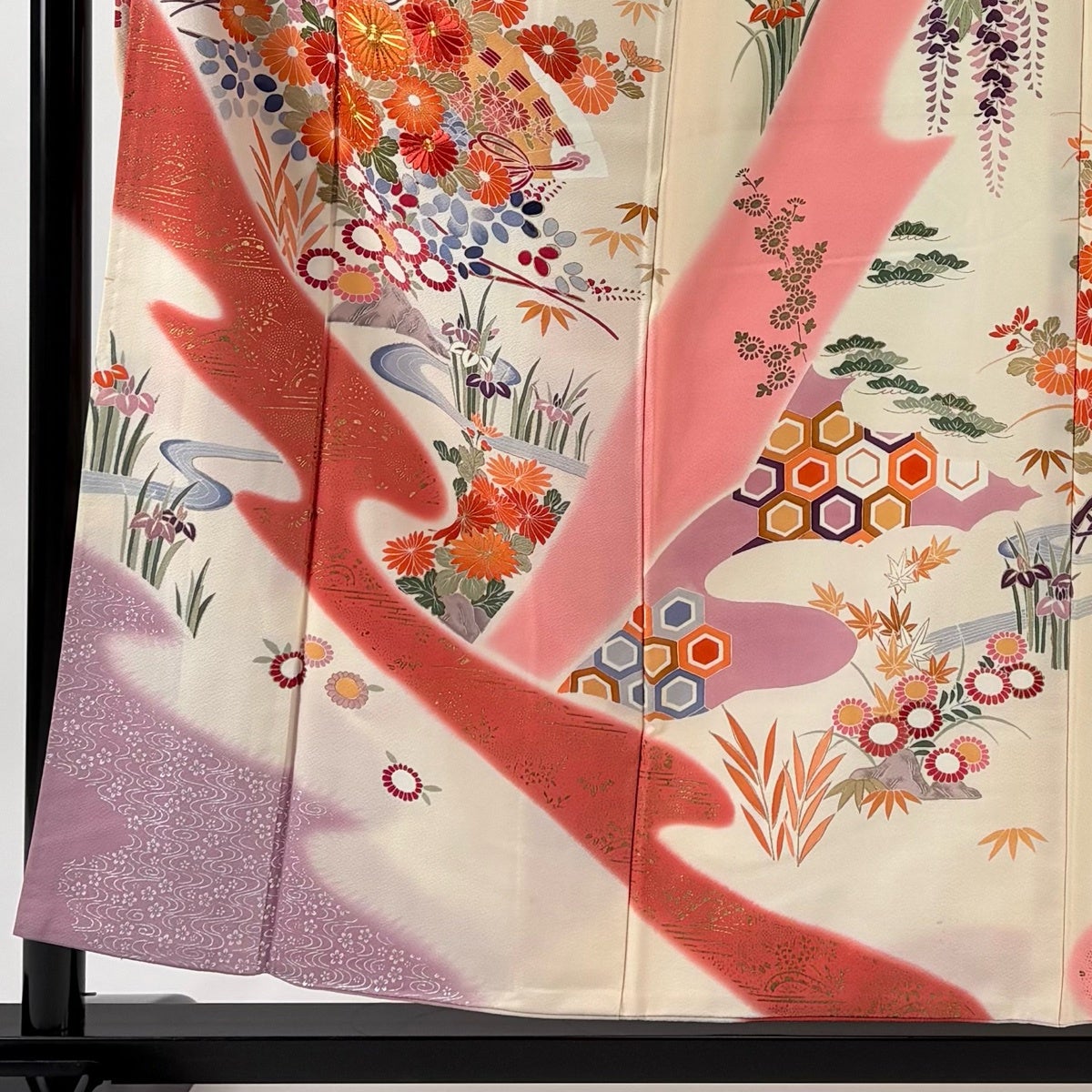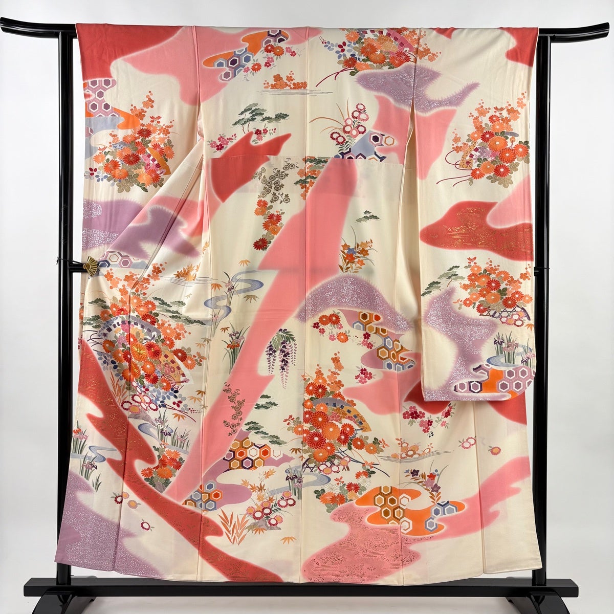 振袖 身丈156.5cm 裄丈62.5cm S 袷 桧扇 草花 金糸 金銀彩 クリーム 正絹 秀品