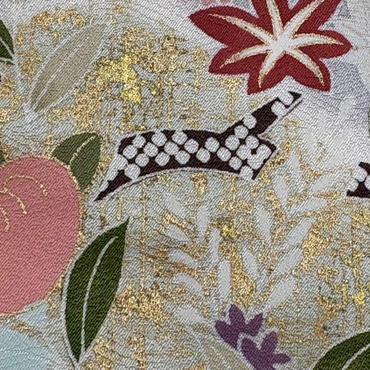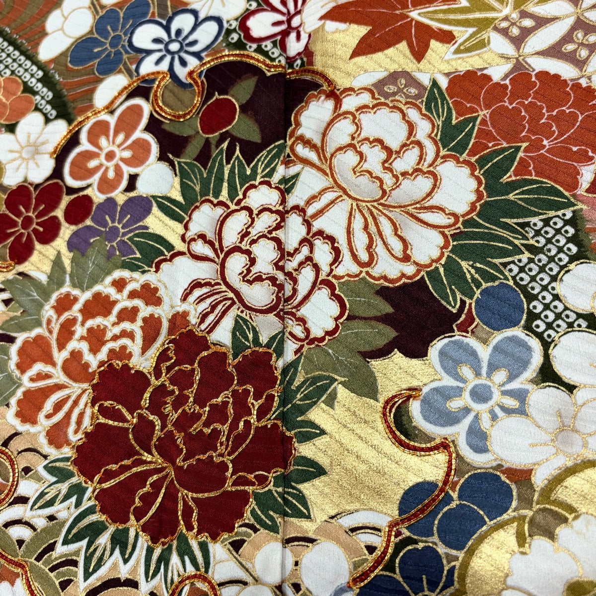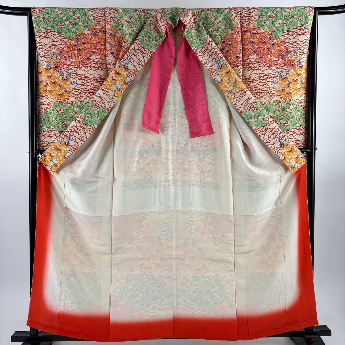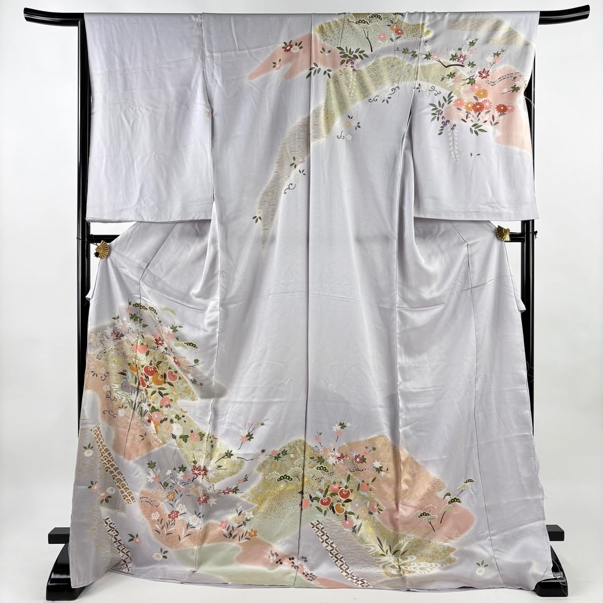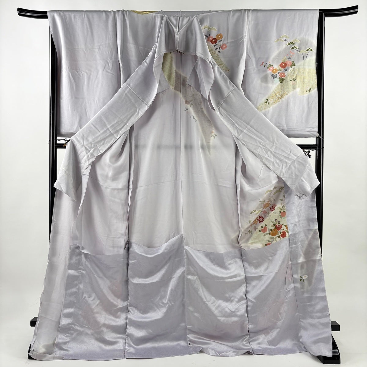 振袖 身丈156.5cm 裄丈62.5cm S 袷 桧扇 草花 金糸 金銀彩 クリーム 正絹 秀品