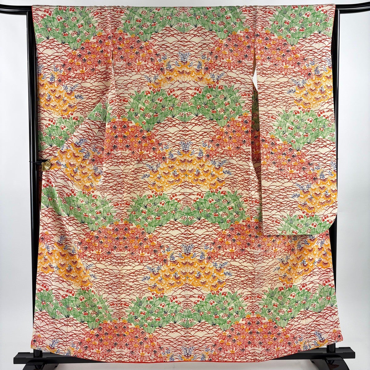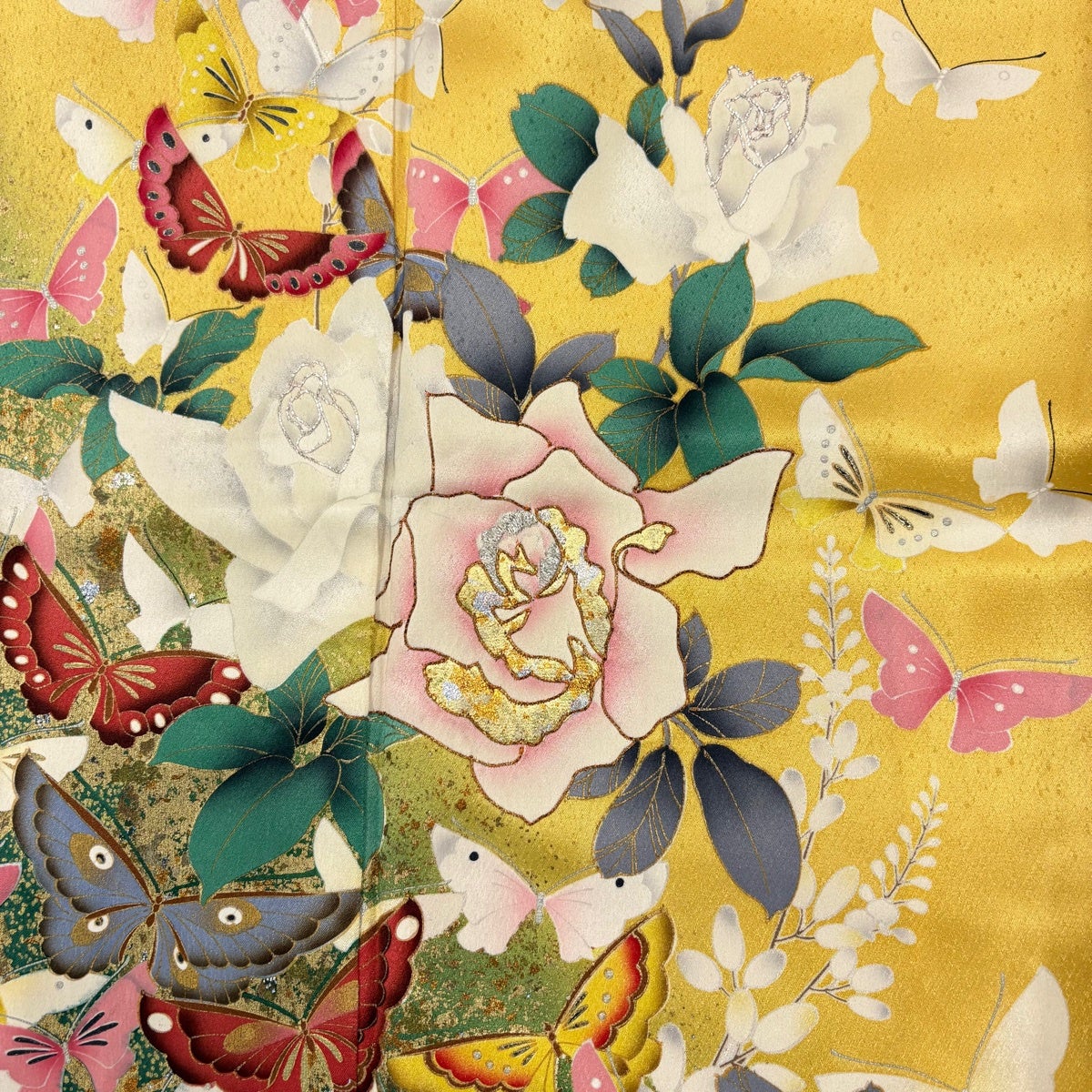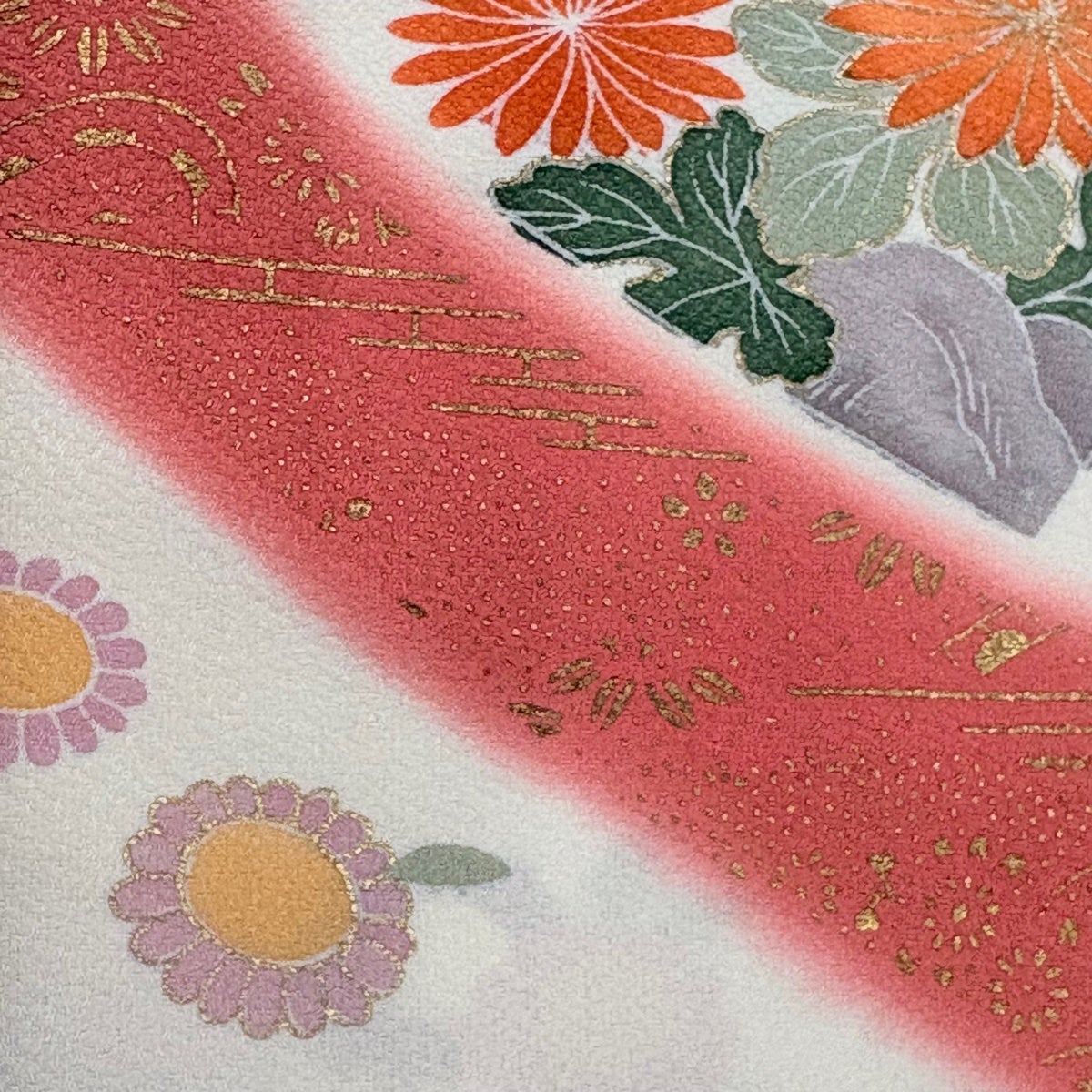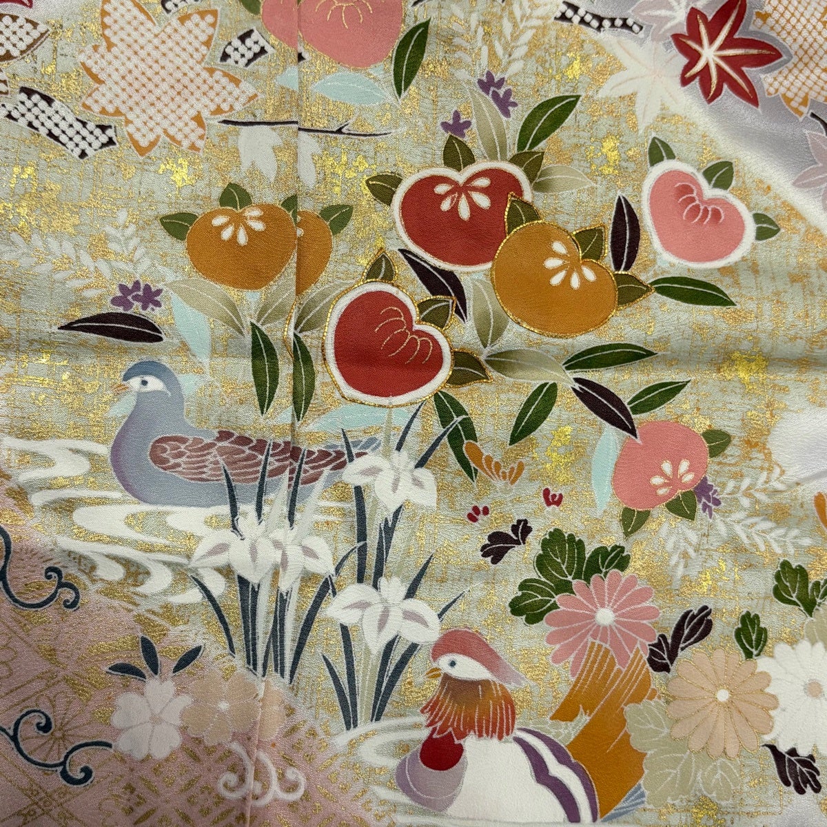振袖 身丈156.5cm 裄丈62.5cm S 袷 桧扇 草花 金糸 金銀彩 クリーム 正絹 秀品