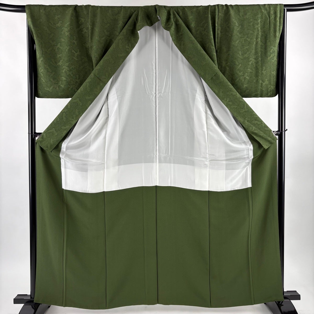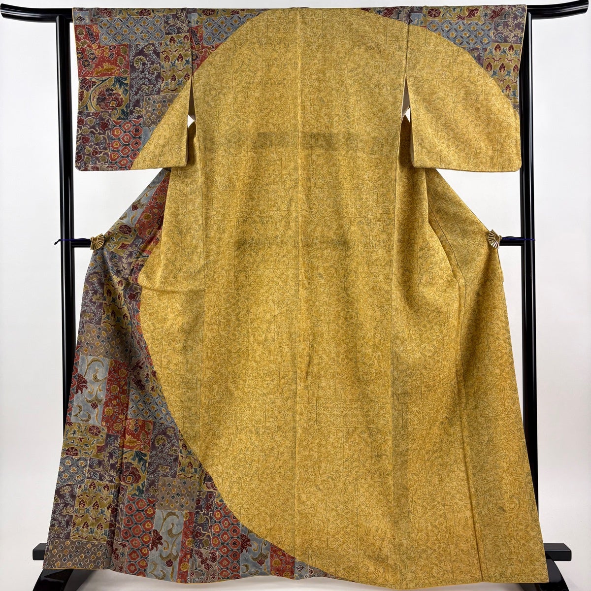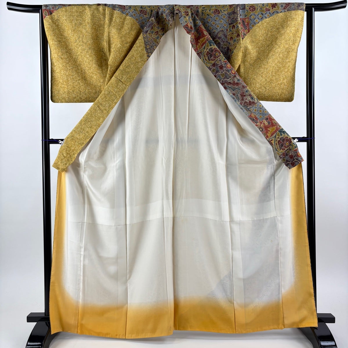 訪問着 身丈166cm 裄丈64.5cm M 袷 草花 鳥 染め分け 黄土色 正絹 秀品