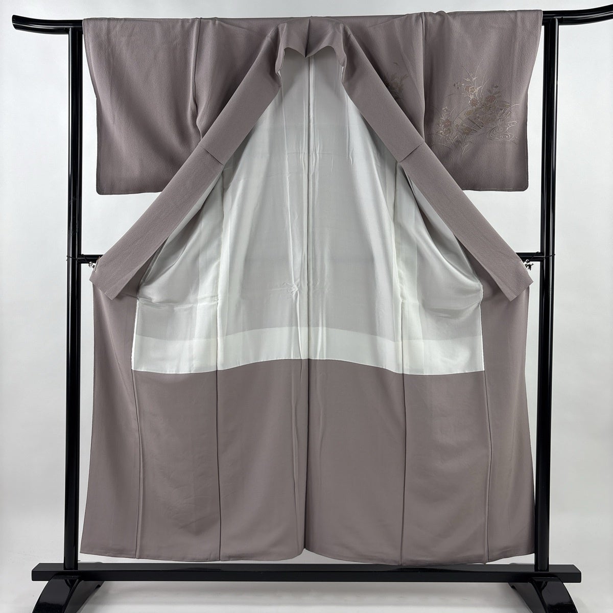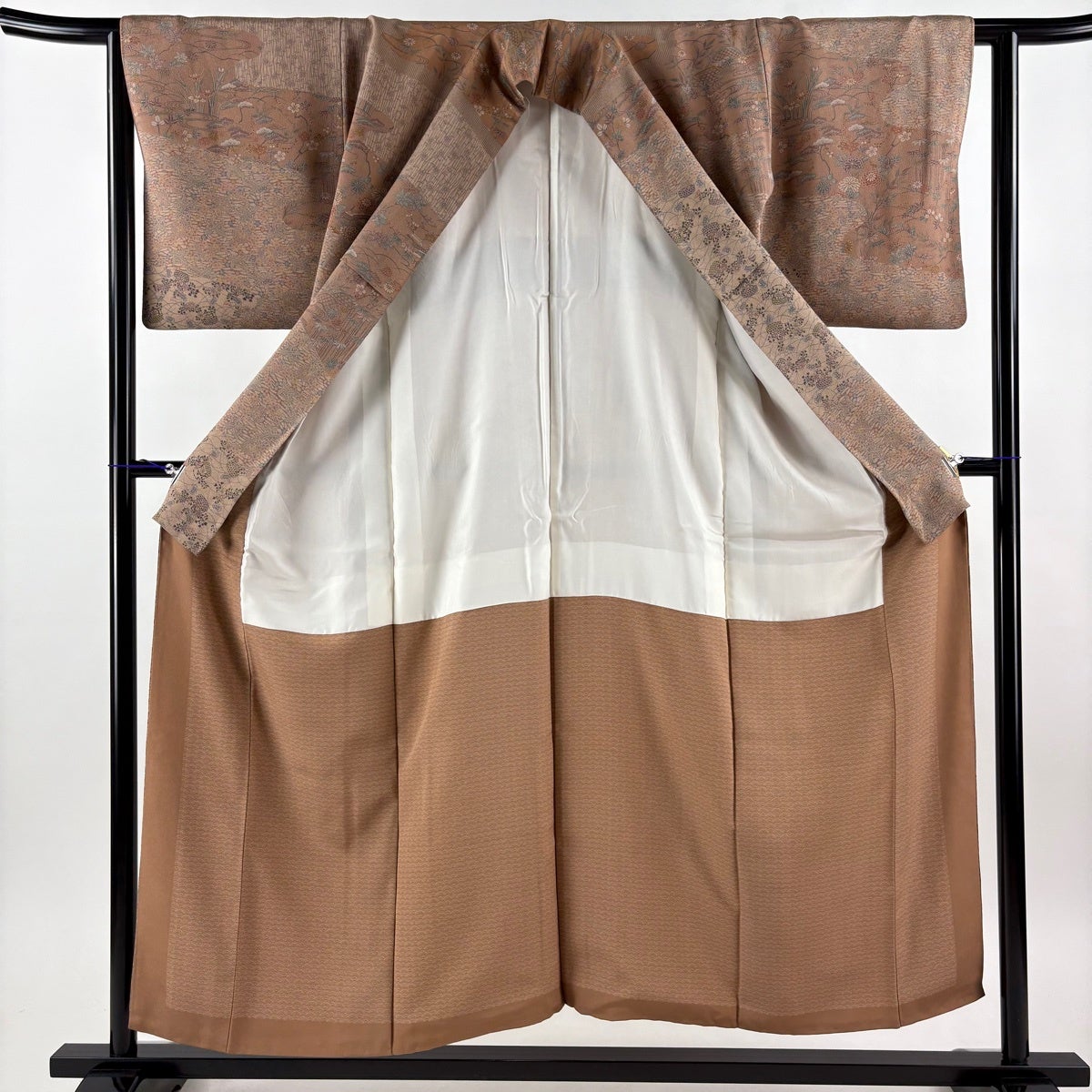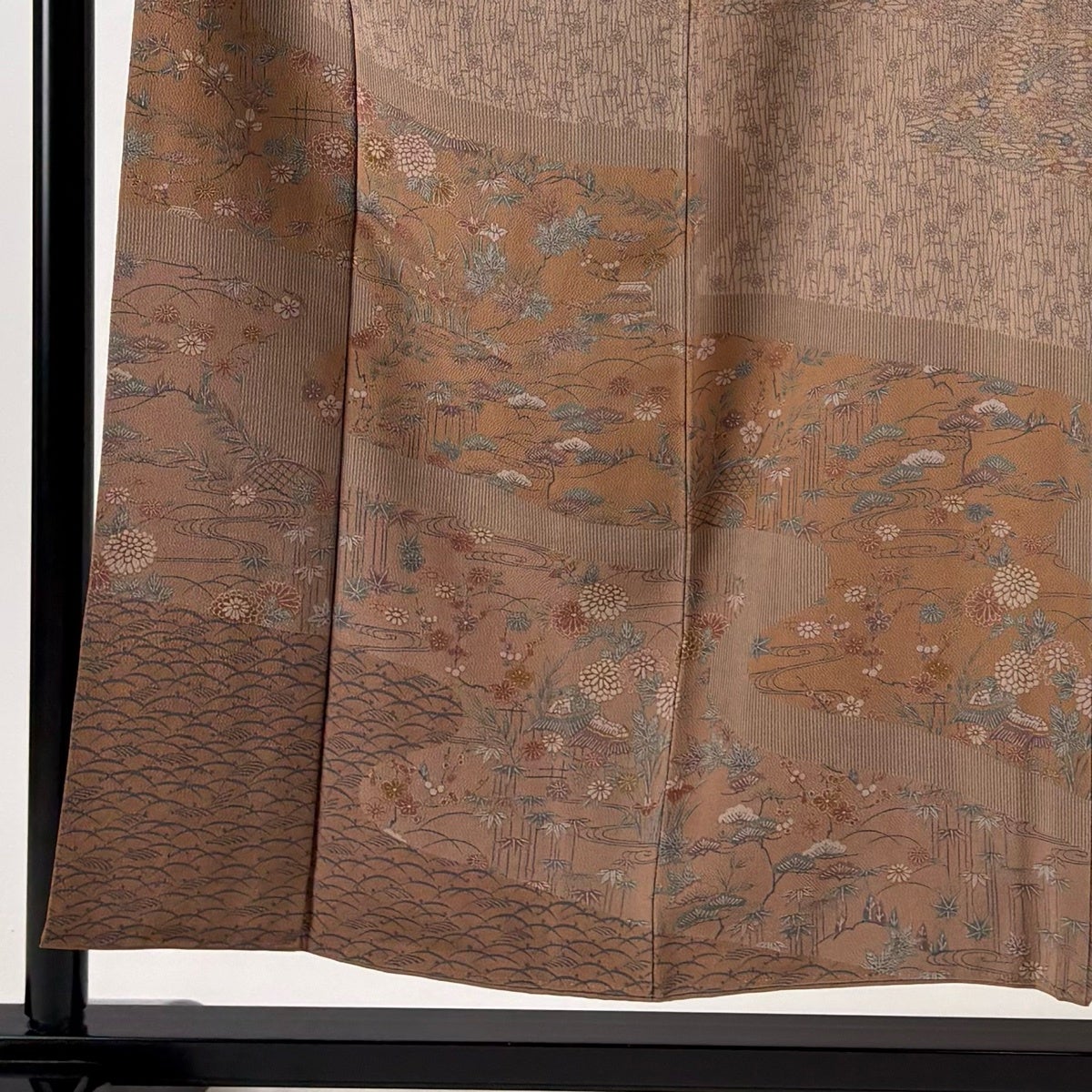 訪問着 身丈155cm 裄丈64cm M 袷 南部幸雄 落款あり 松竹梅 露芝 縮緬 灰茶 正絹 秀品