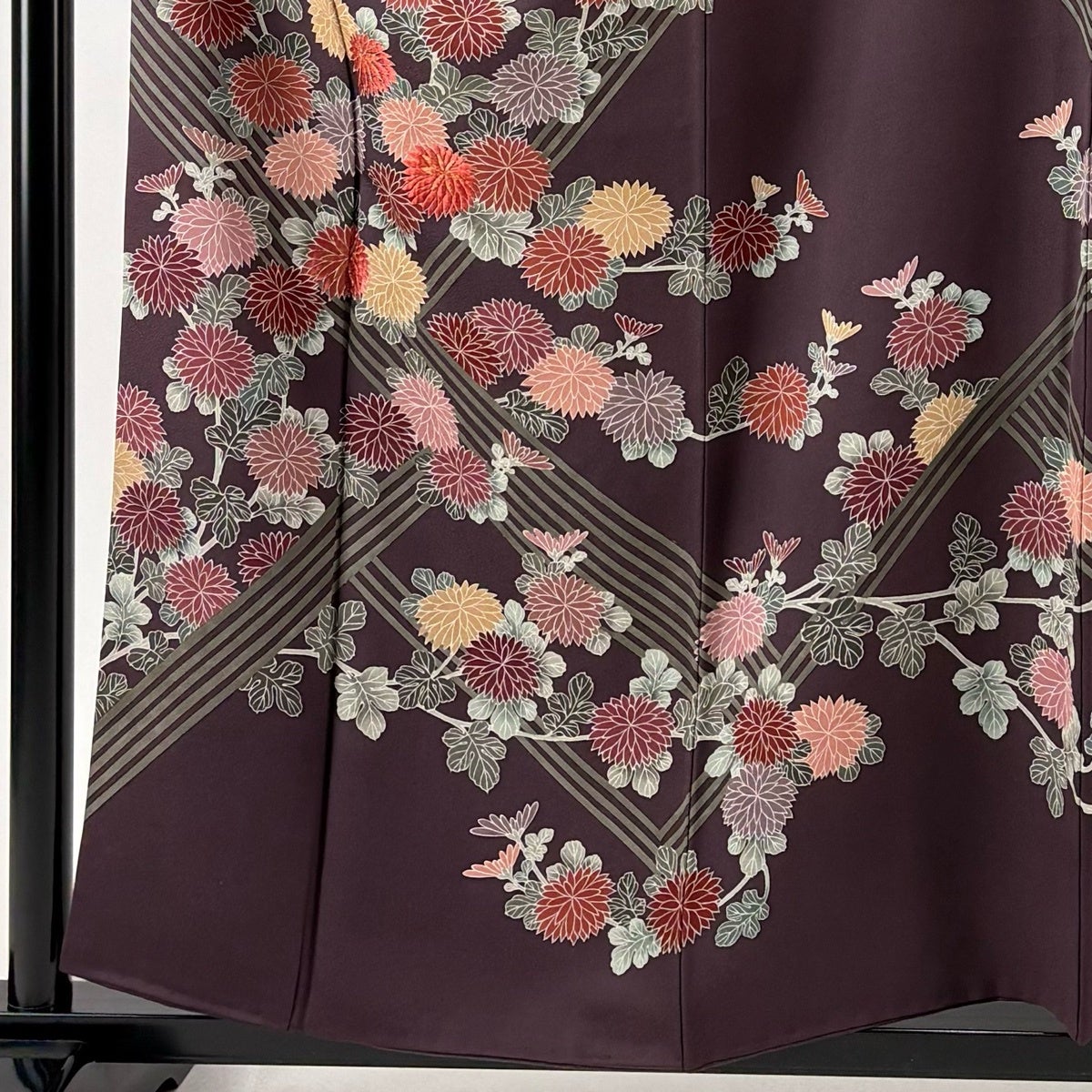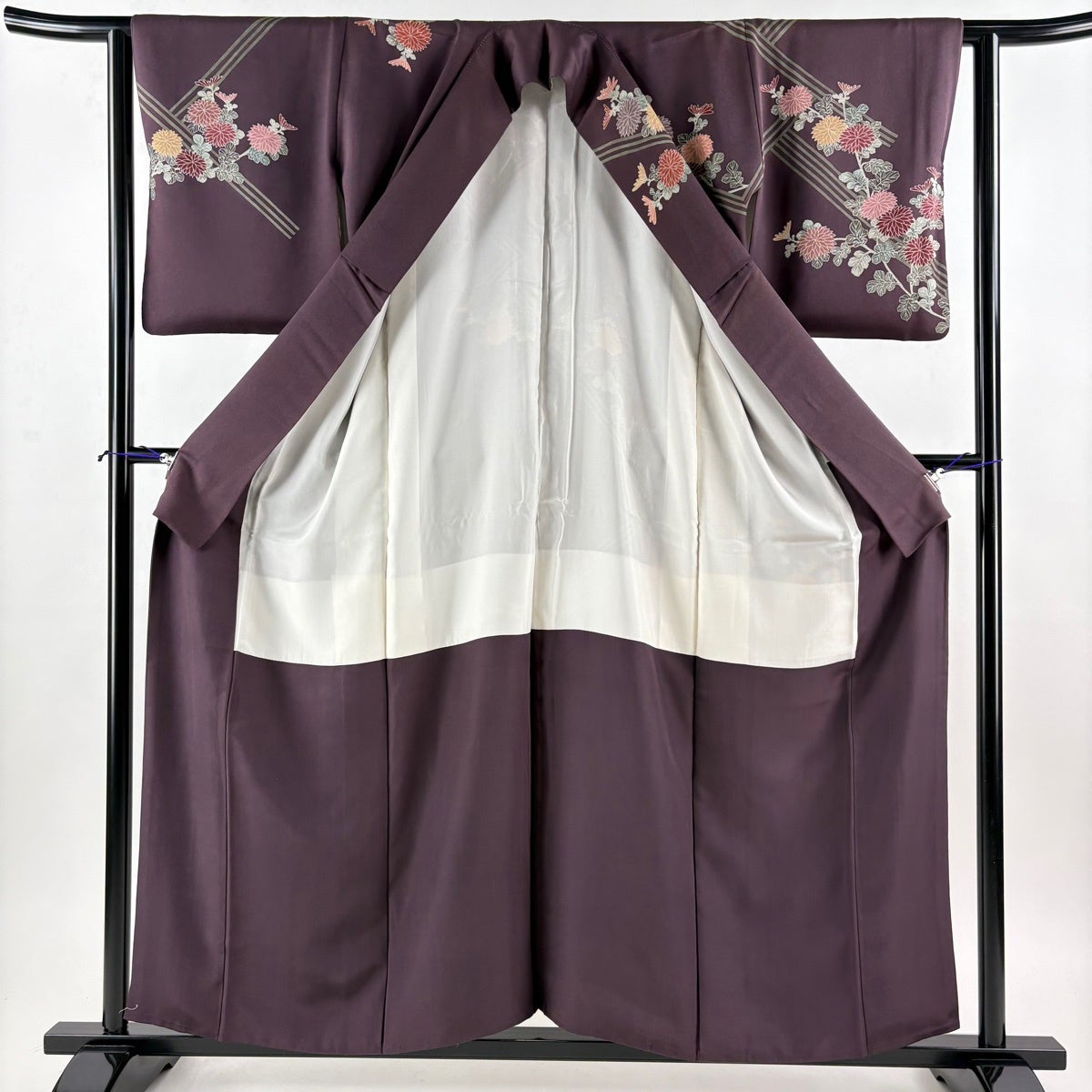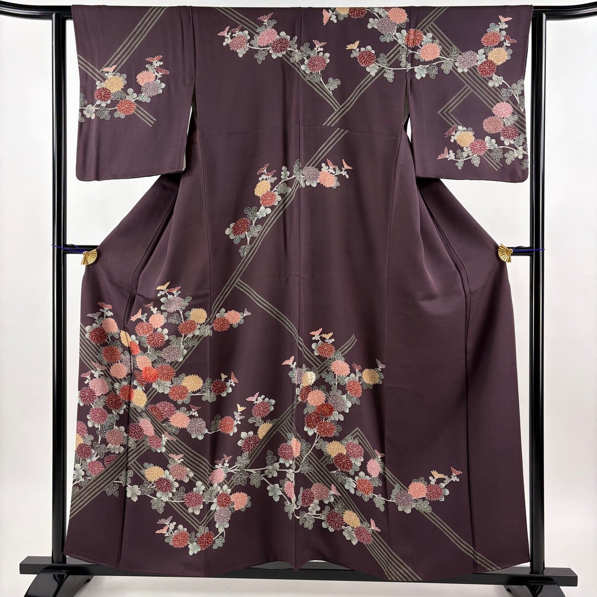 訪問着 身丈158cm 裄丈62.5cm S 袷 ますいわ屋 菊 幾何学模様 金糸 刺繍 小豆色 正絹 秀品