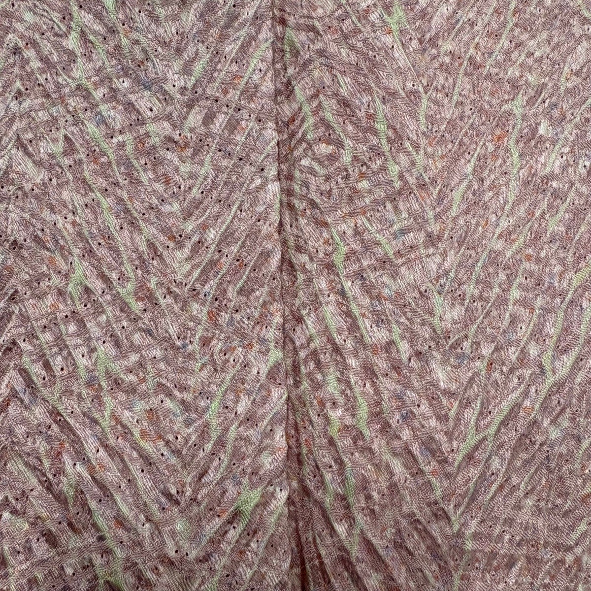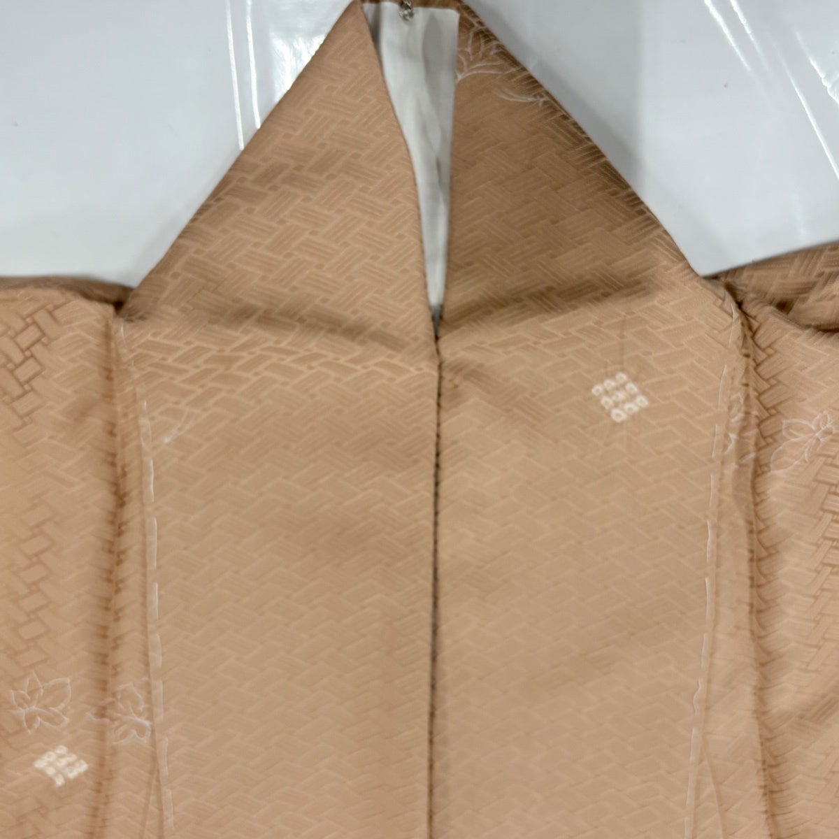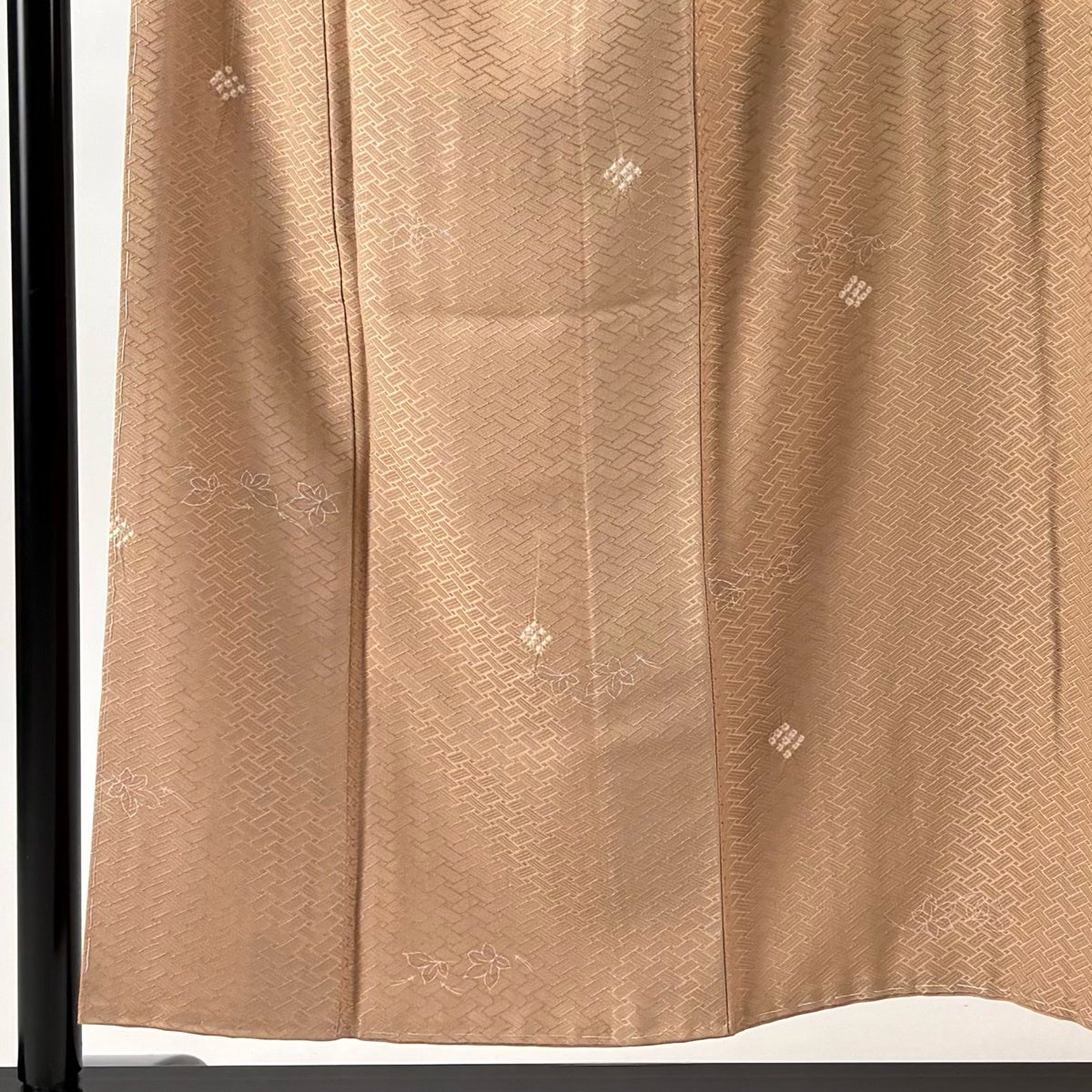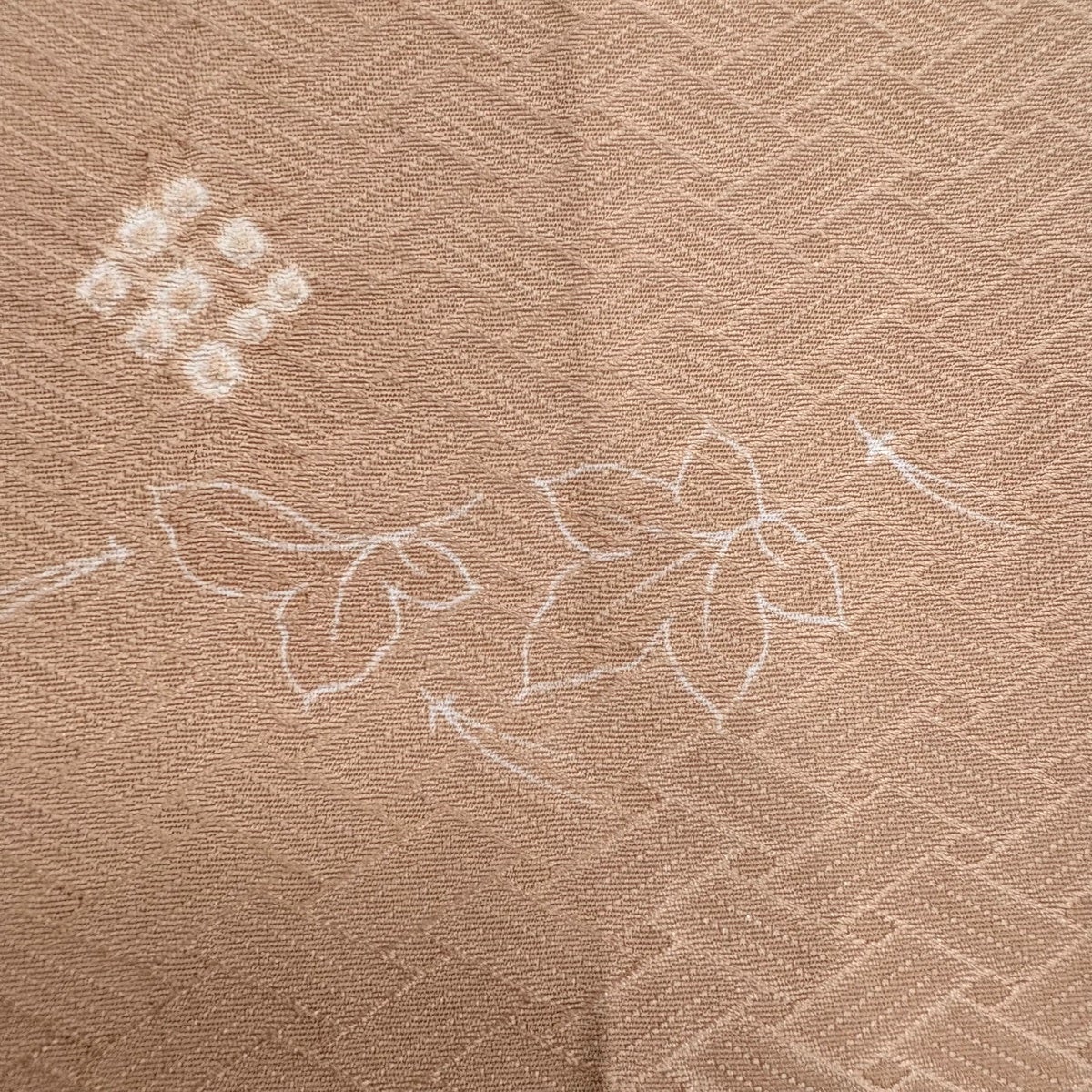 【美品】 小紋 身丈153cm 裄丈63cm S 袷 葉柄 地紋 絞り ピンクベージュ 正絹 秀品