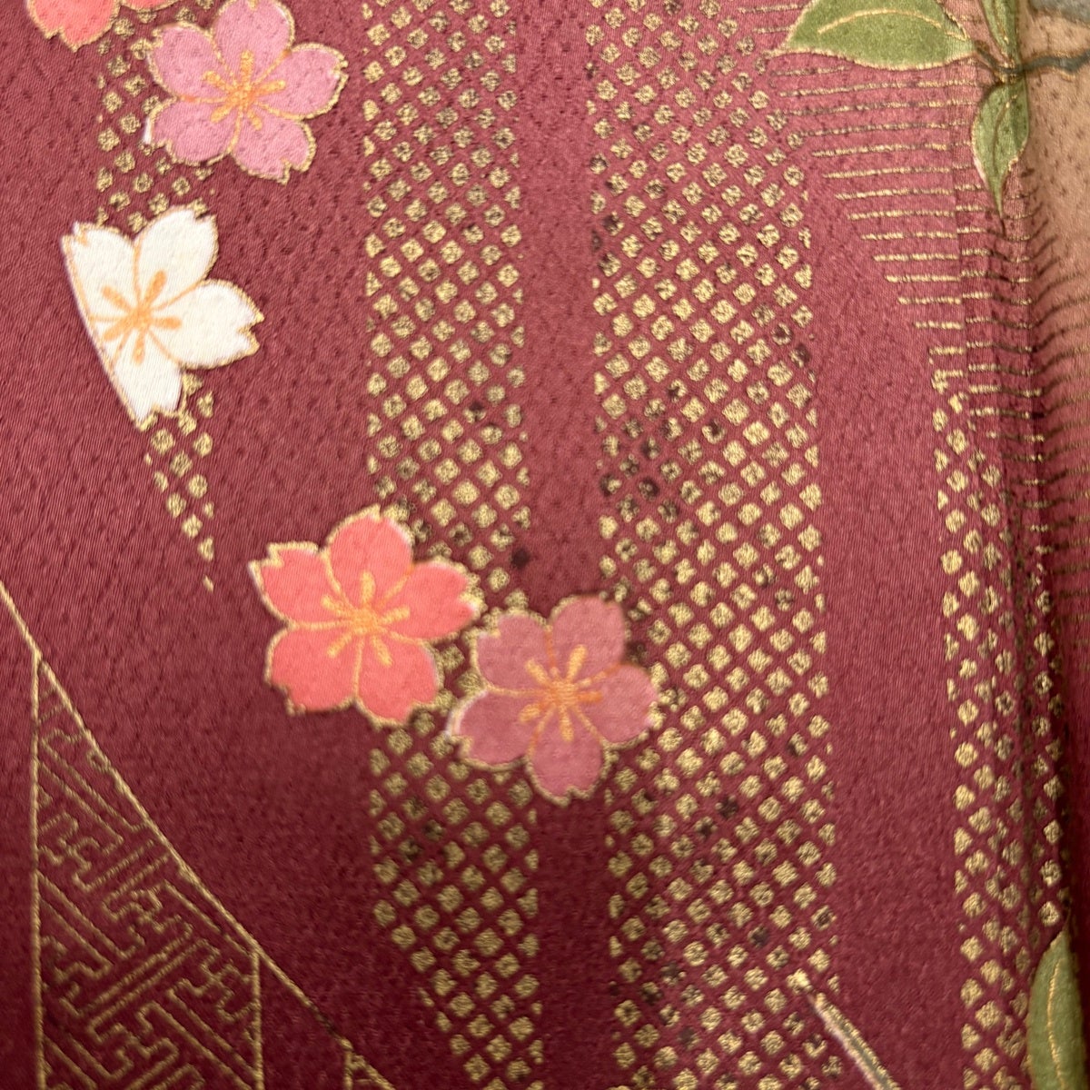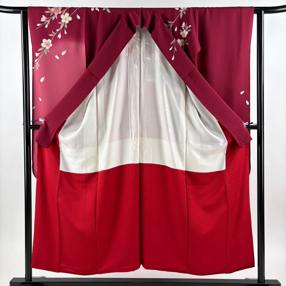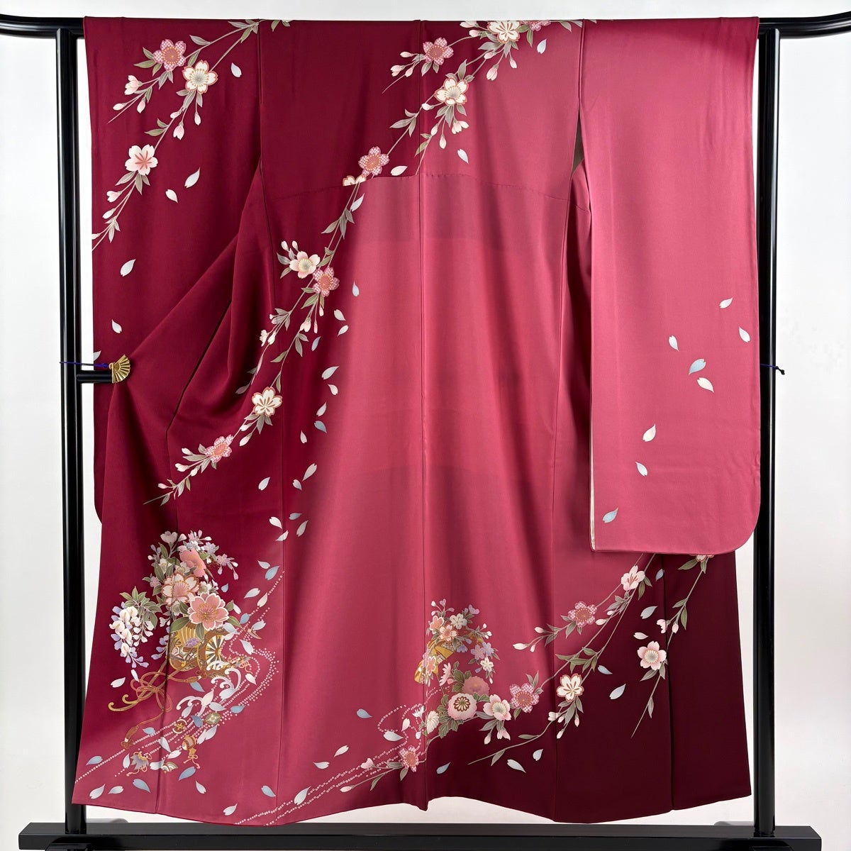 振袖 身丈153.5cm 裄丈62.5cm S 袷 花車 枝垂れ桜 金彩 箔 赤紫 正絹 秀品